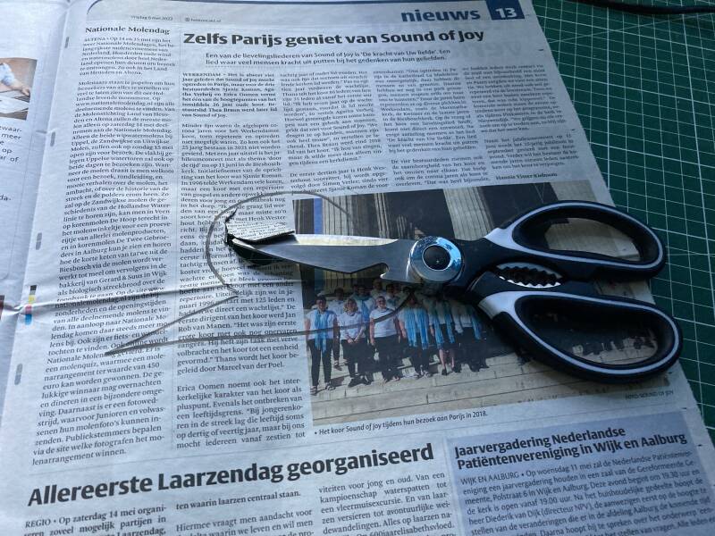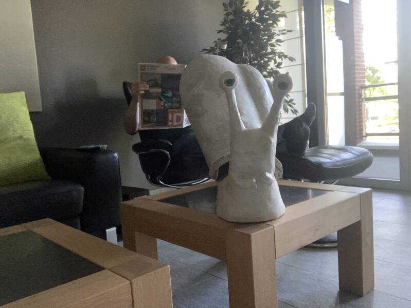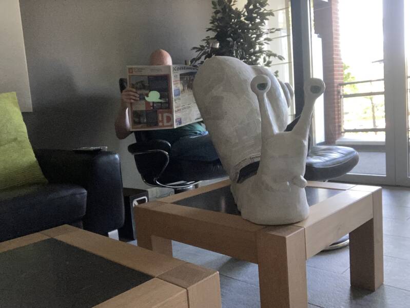 Ad Altena, zo heb ik mijn slak gedoopt. Gehuld in krantenpapier, met artikelen die het hele huis bedekken. Om het beter zichtbaar uit de krant te laten voortkomen hield ik een groen gekleurd papier op het gat gedrukt dat ik uit de krant had geknipt.