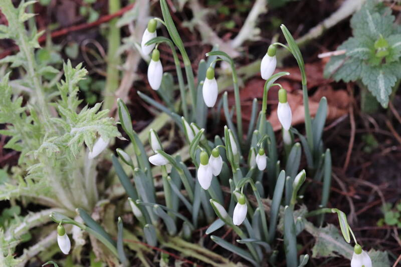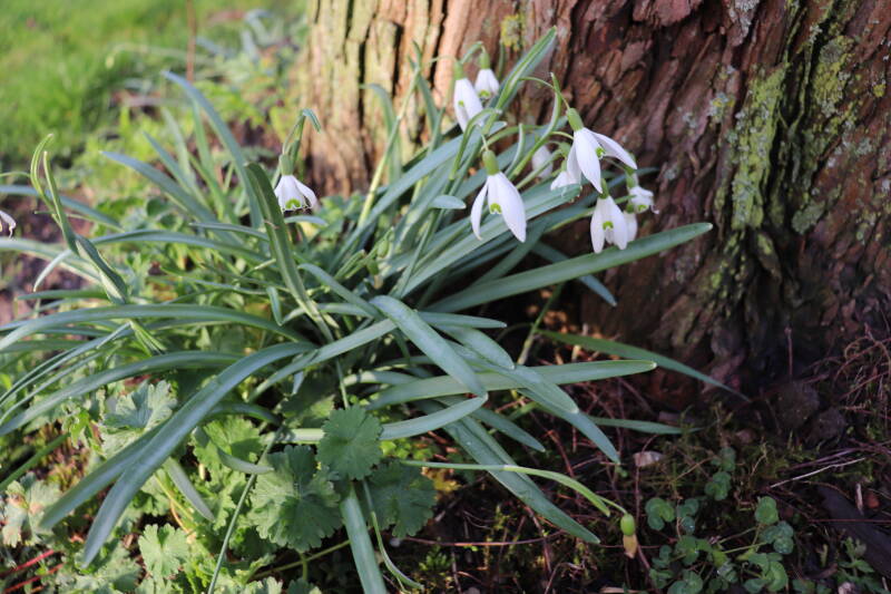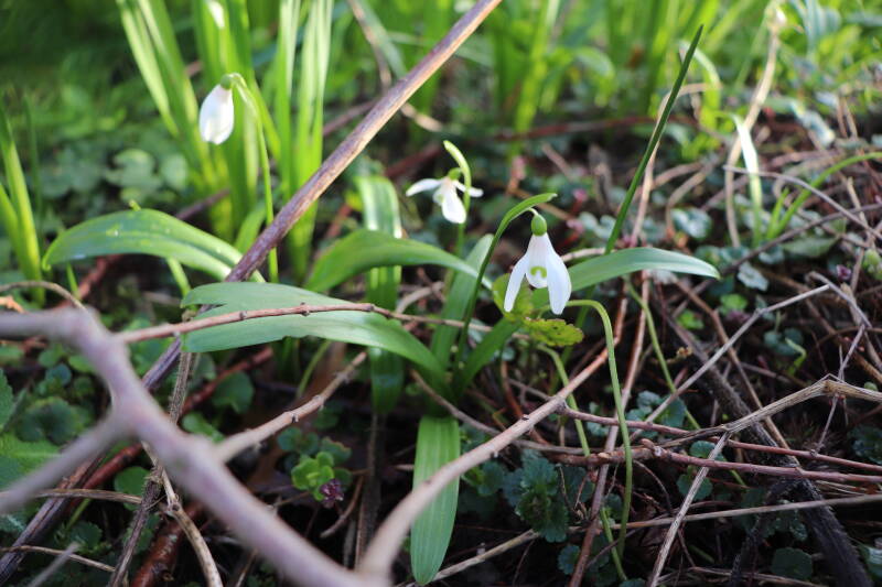Rondom een aantal lantaarnpalen, verkeersborden en een schrikhek zijn het afgelopen jaar geplante bollen inmiddels ook opgekomen. Lopend of fietsend over het rood geasfalteerde pad kan je nu links en rechts deze sneeuwklokjes in bloei zien staan. Het vrolijkt de route aanzienlijk op. Achteraf bekeken had ik de bollen misschien in kleinere groepen moeten aanplanten dan is gebeurd. Ik verwacht dat de bollen afgestorven zullen zijn tegen de tijd er rondom deze obstakels zal worden gemaaid en dat is belangrijk voor het behoud ervan voor de toekomst.
