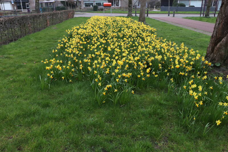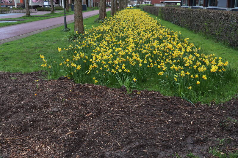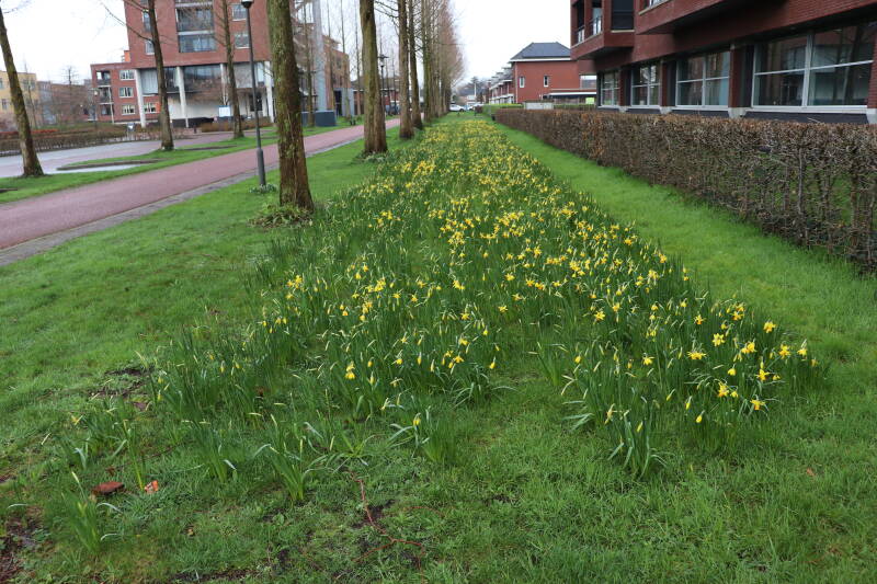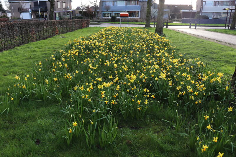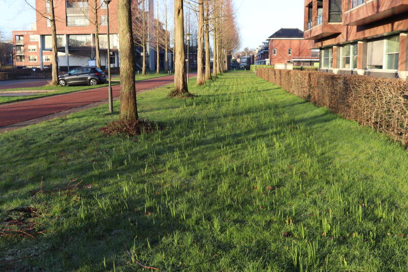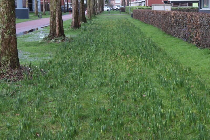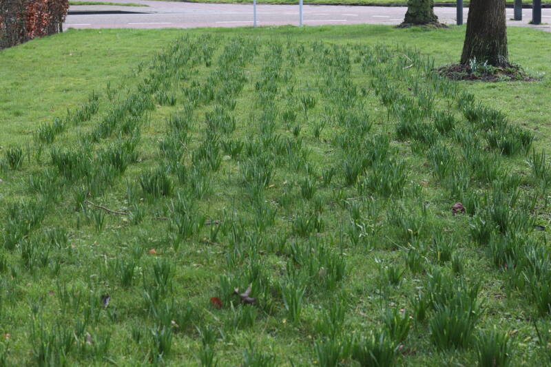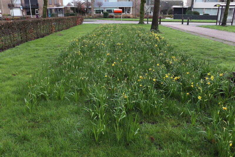 De bollenstrook Narcissen in het gazon laat al vroeg van het jaar iets van zich zelf zien dat het zoveel maanden ondergronds verborgen had weten te houden. Het afgelopen jaar hebben deze bollen voldoende reserves opgebouwd om straks weer massaal te schitteren.
