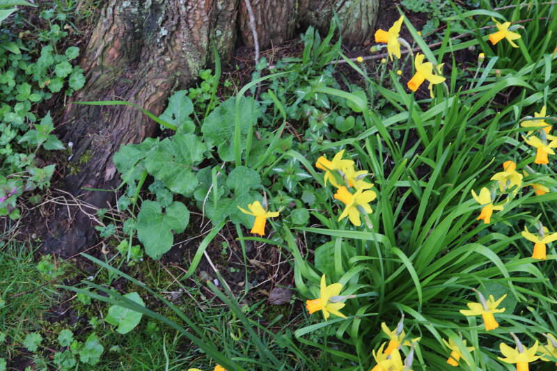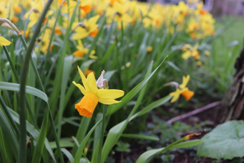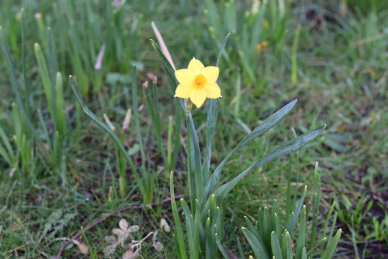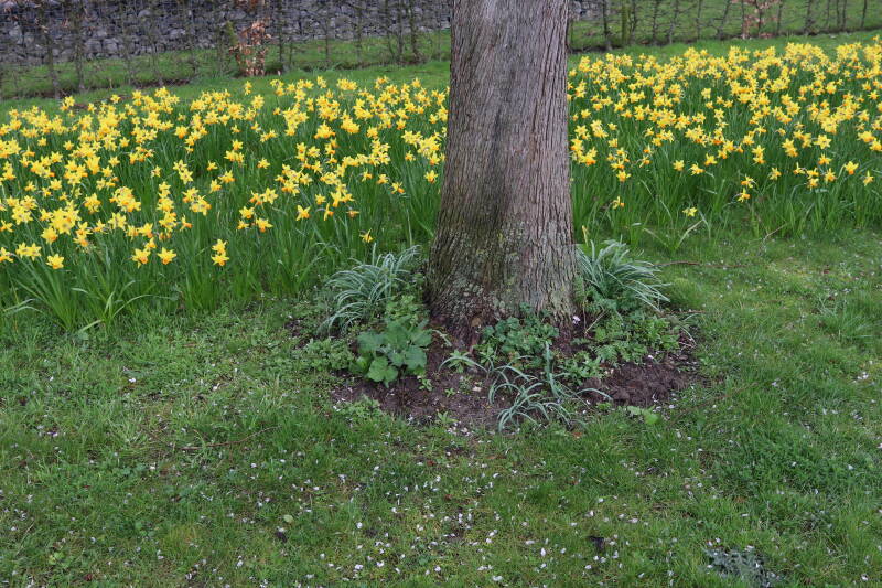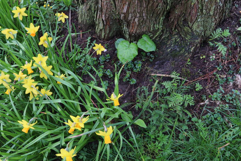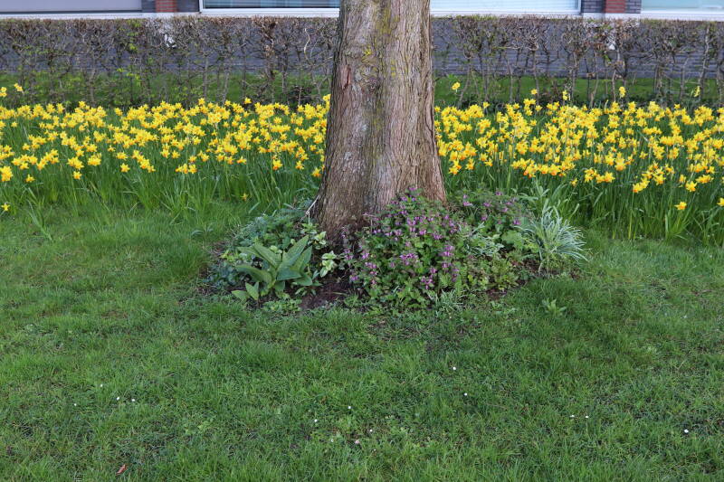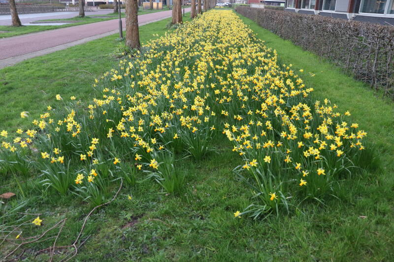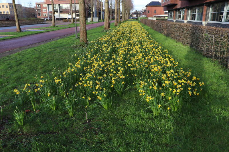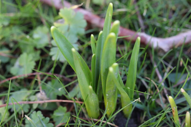 De bollenstrook Narcissen in het gazon laat al vroeg van het jaar iets van zich zelf zien dat het zoveel maanden ondergronds verborgen had weten te houden. Het afgelopen jaar hebben deze bollen voldoende reserves opgebouwd om straks weer massaal te schitteren.