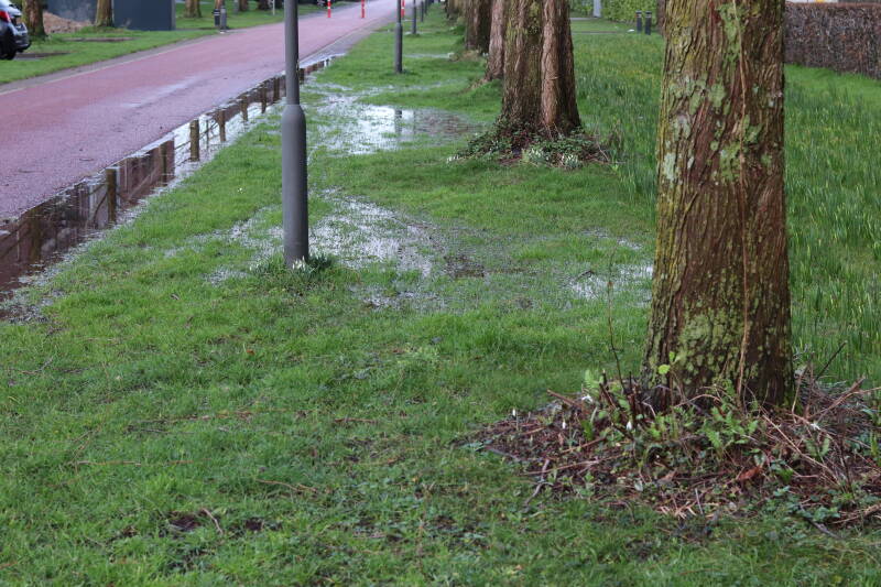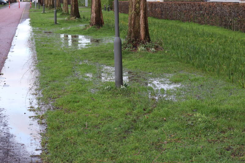 De afgelopen jaren is me gaan opvallen dat het water dat na een langdurige of heftige regenbui is gevallen steeds meer ruimte opeist voor het weer in de grond is weg gezakt. Deze plas water is 9 februari ontstaan. De grond was waarschijnlijk nog verzadigd van de regen die eerder deze week was gevallen en het water kruipt langzaam, maar gestaag verder richting de toegang tot de parkeerkelder van het appartementencomplex.