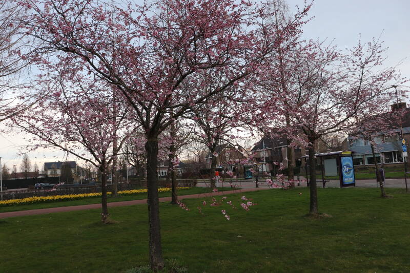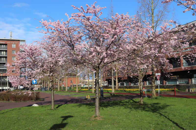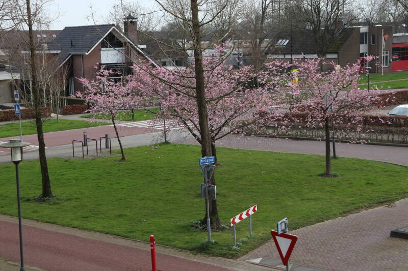 De vier Prunus avium (zoete kers) staan vanaf 7 maart in bloei en voor een te helaas korte tijd zullen we van de prachtige bloemen kunnen genieten. Een week later begonnen de eerste bloemblaadjes al in grote getale te vallen. Op 24 maart was het vrijwel voorbij en resteerde er nog slechts enkele bloemblaadjes.
