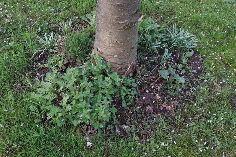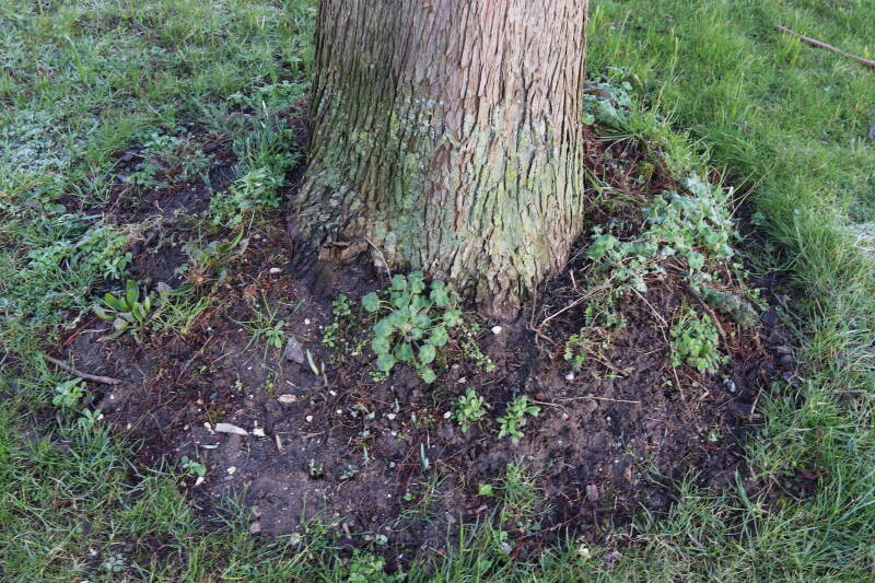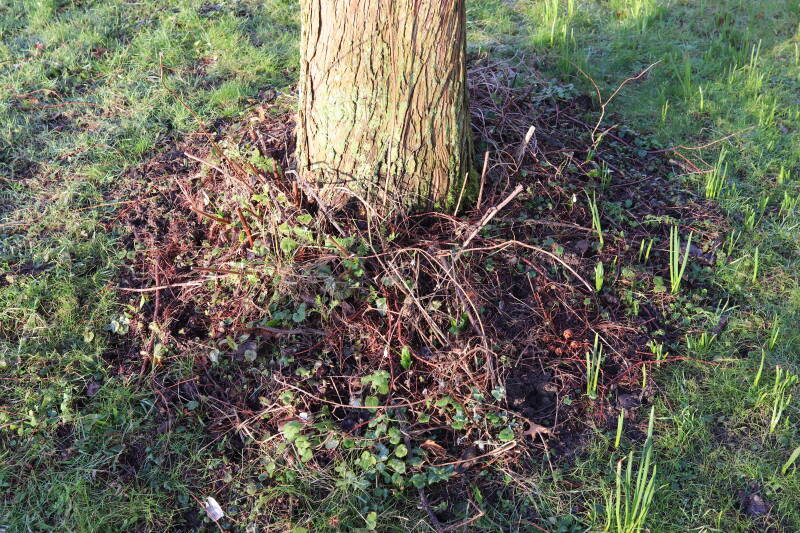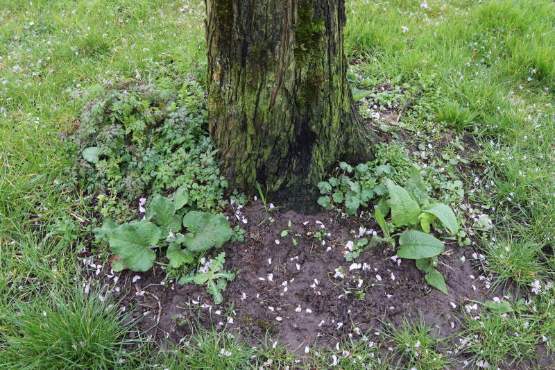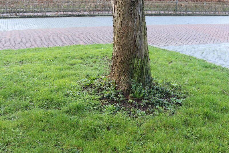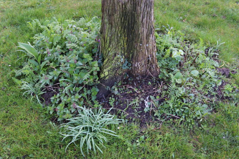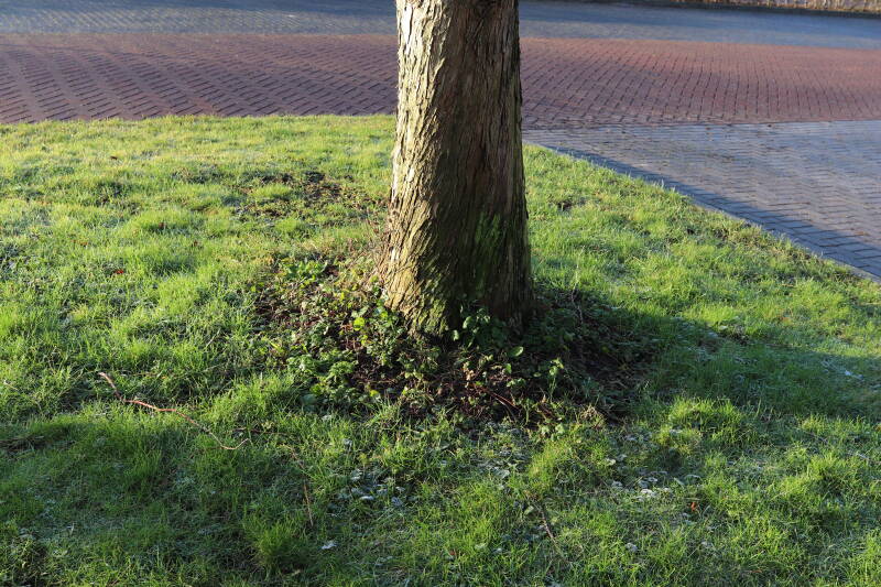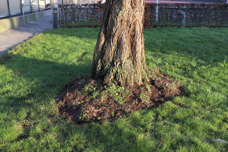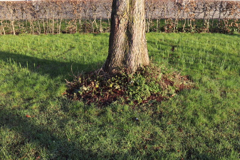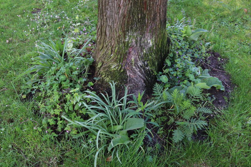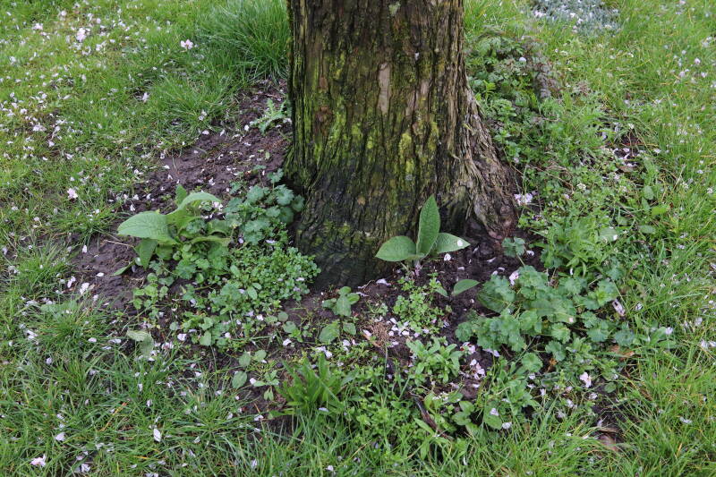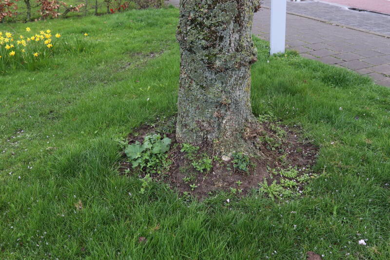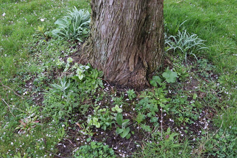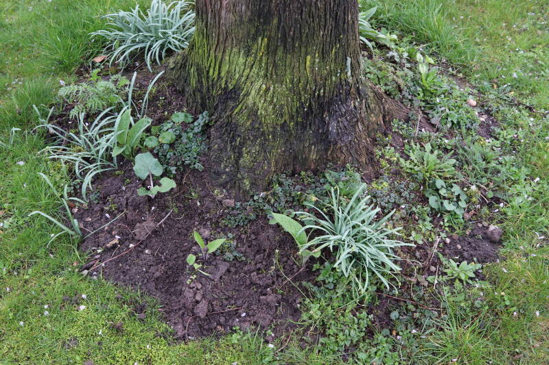 Na het omzagen van een boom in het laantje heb ik de beplanting er om heen verspreid over andere boomspiegels, plus een andere loofboom Prunus avium (zoete kers) van een boomspiegel voorzien, om het aantal voor dit jaar gelijk te houden met waar ik het afgelopen jaar mee ben geëindigd. Ik verwacht op kort termijn dat de stobbe van de Metasequoia glyptostroboides (Chinese moerascypres) tot onder het maaiveld wordt gefreesd en dan blijft er niets over van de bolgewassen en kruidachtige planten die er hebben gestaan. Het gefreesde afval zal in dat geval worden afgevoerd en het ontstane gat worden gedicht met grond, waar de maaier straks over heen zal rijden om het gras kort te houden. Er zal dan bovengronds geen spoor meer te bekennen zijn van de boom die er ooit heeft gestaan.