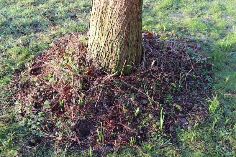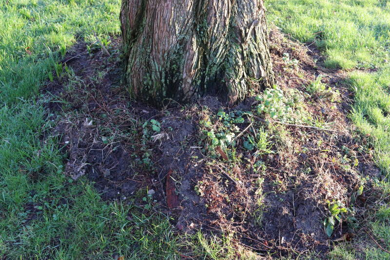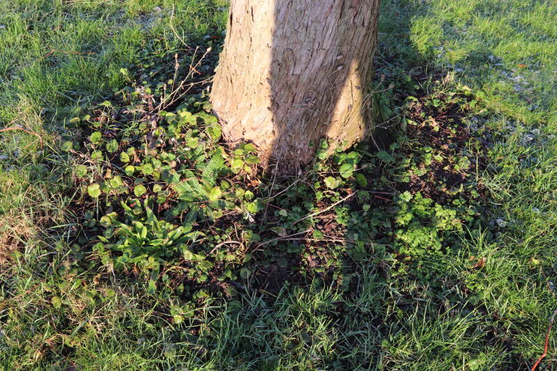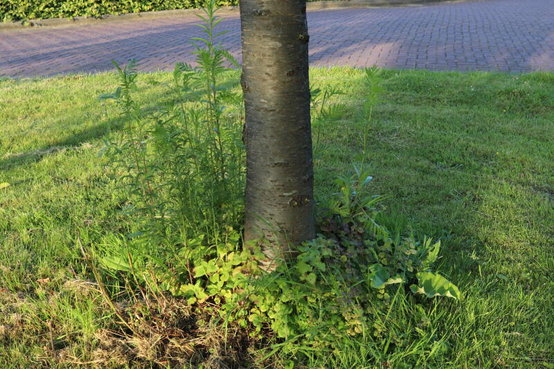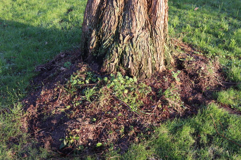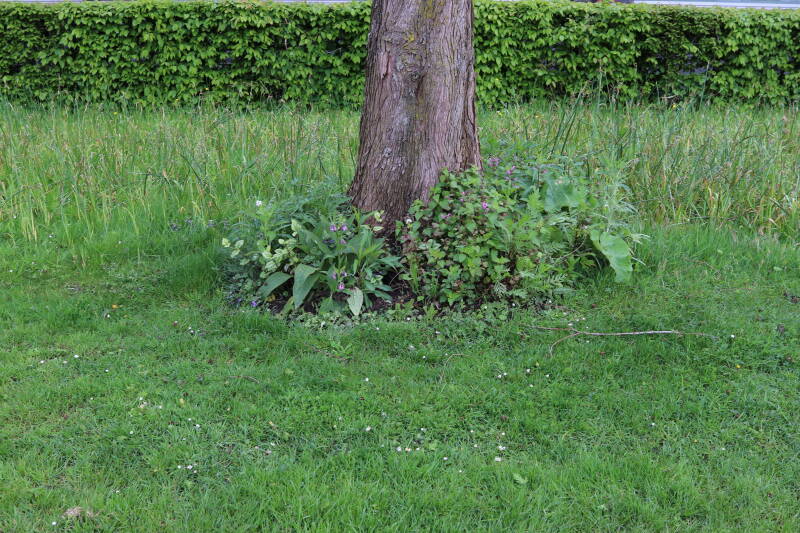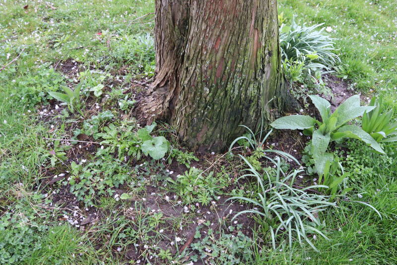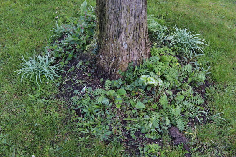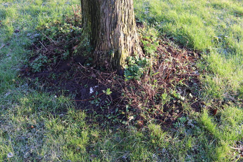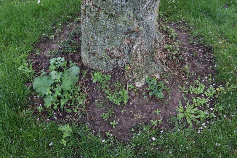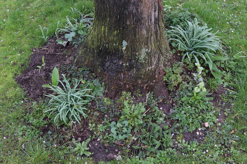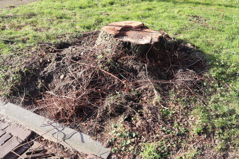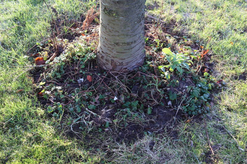 Na het omzagen van een boom in het laantje heb ik de beplanting er om heen verspreid over andere boomspiegels, plus een andere loofboom Prunus avium (zoete kers) van een boomspiegel voorzien, om het aantal voor dit jaar gelijk te houden met waar ik het afgelopen jaar mee ben geëindigd. Ik verwacht op kort termijn dat de stobbe van de Metasequoia glyptostroboides (Chinese moerascypres) tot onder het maaiveld wordt gefreesd en dan blijft er niets over van de bolgewassen en kruidachtige planten die er hebben gestaan. Het gefreesde afval zal in dat geval worden afgevoerd en het ontstane gat worden gedicht met grond, waar de maaier straks over heen zal rijden om het gras kort te houden. Er zal dan bovengronds geen spoor meer te bekennen zijn van de boom die er ooit heeft gestaan.