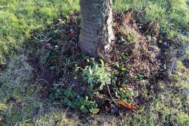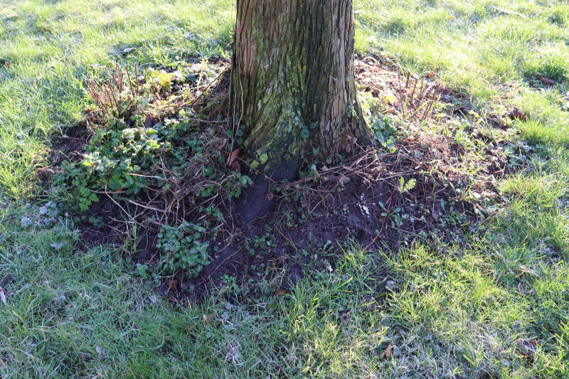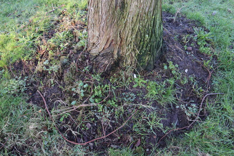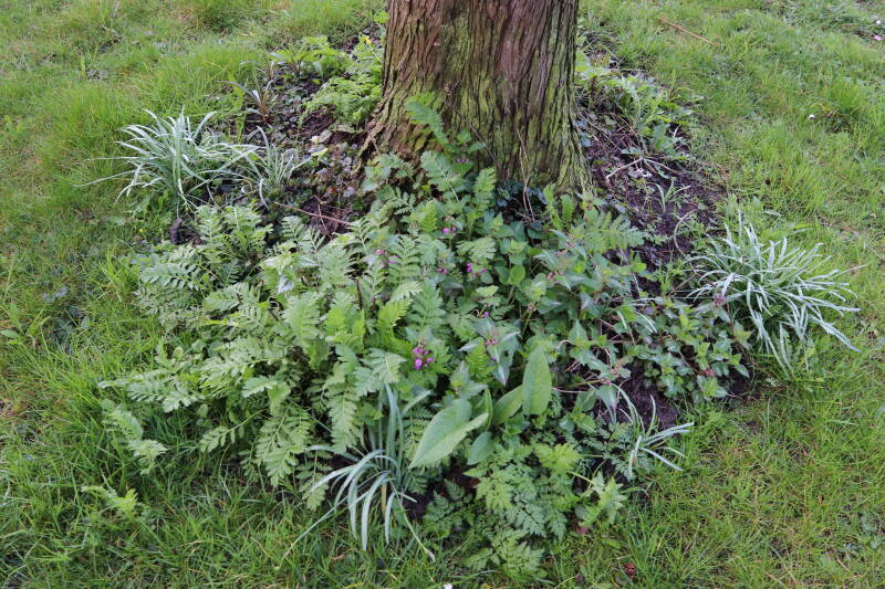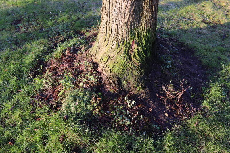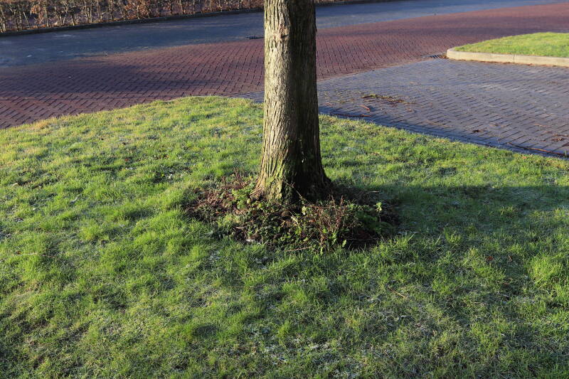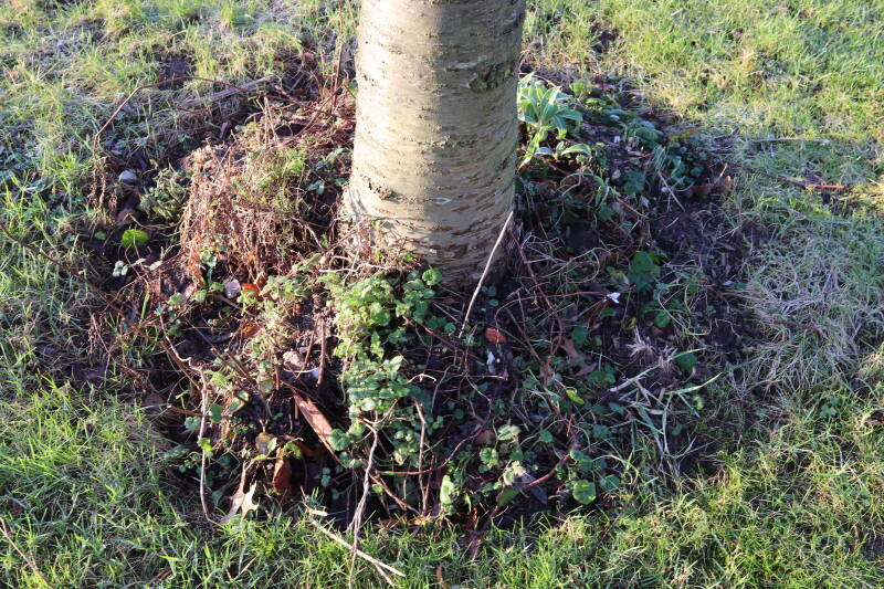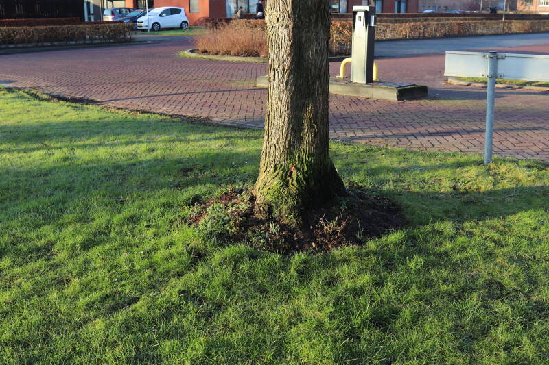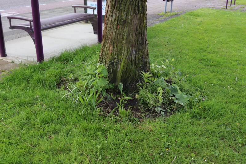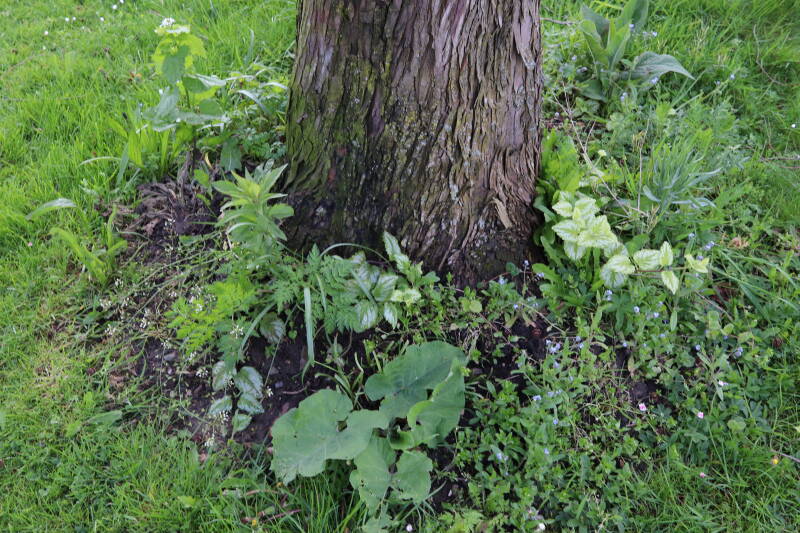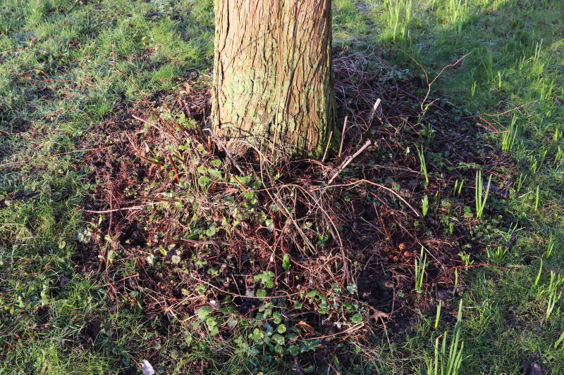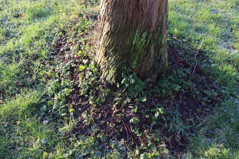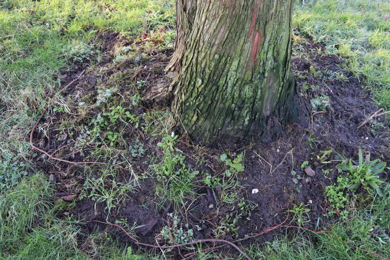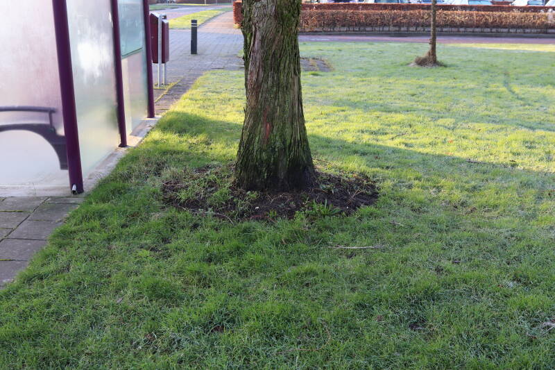 Na het omzagen van een boom in het laantje heb ik de beplanting er om heen verspreid over andere boomspiegels, plus een andere loofboom Prunus avium (zoete kers) van een boomspiegel voorzien, om het aantal voor dit jaar gelijk te houden met waar ik het afgelopen jaar mee ben geëindigd. Ik verwacht op kort termijn dat de stobbe van de Metasequoia glyptostroboides (Chinese moerascypres) tot onder het maaiveld wordt gefreesd en dan blijft er niets over van de bolgewassen en kruidachtige planten die er hebben gestaan. Het gefreesde afval zal in dat geval worden afgevoerd en het ontstane gat worden gedicht met grond, waar de maaier straks over heen zal rijden om het gras kort te houden. Er zal dan bovengronds geen spoor meer te bekennen zijn van de boom die er ooit heeft gestaan.