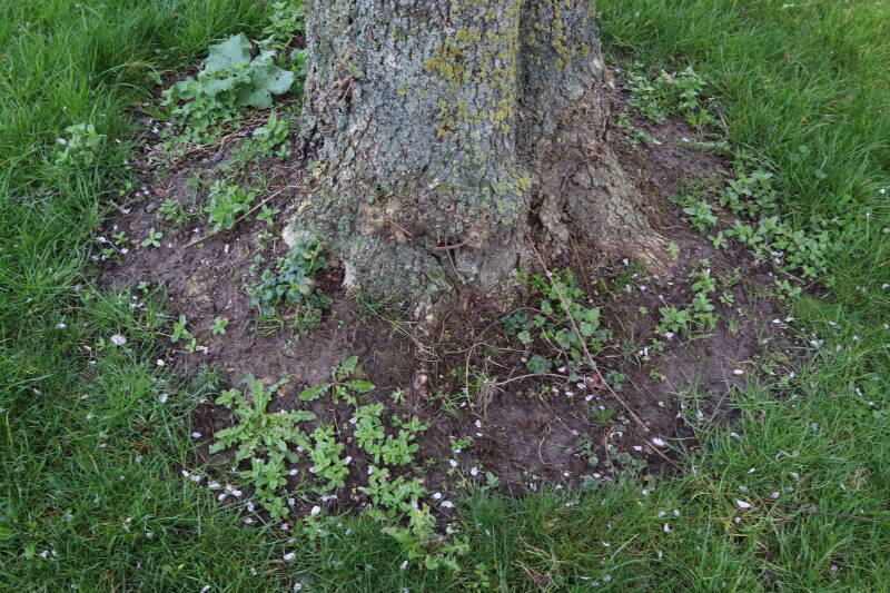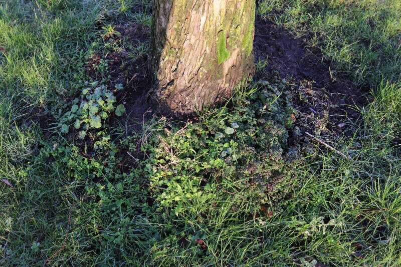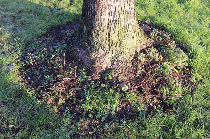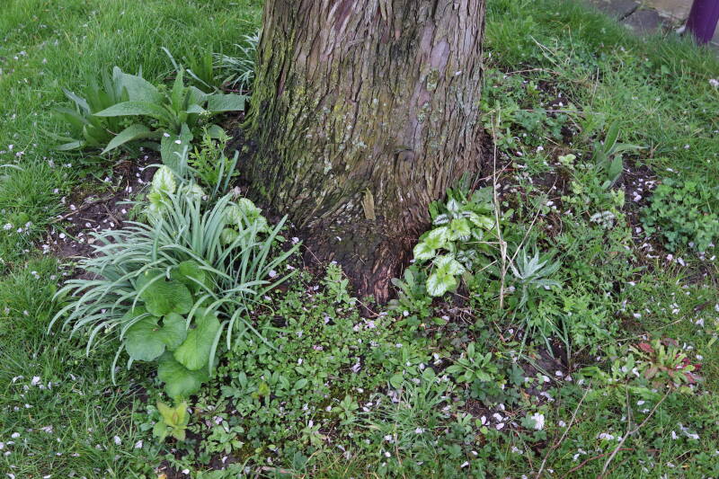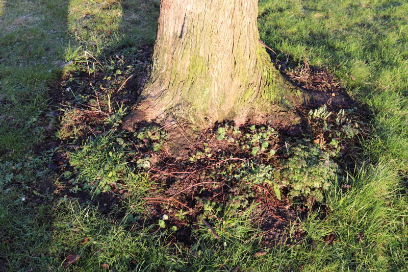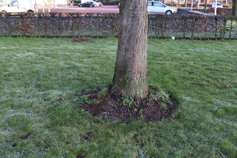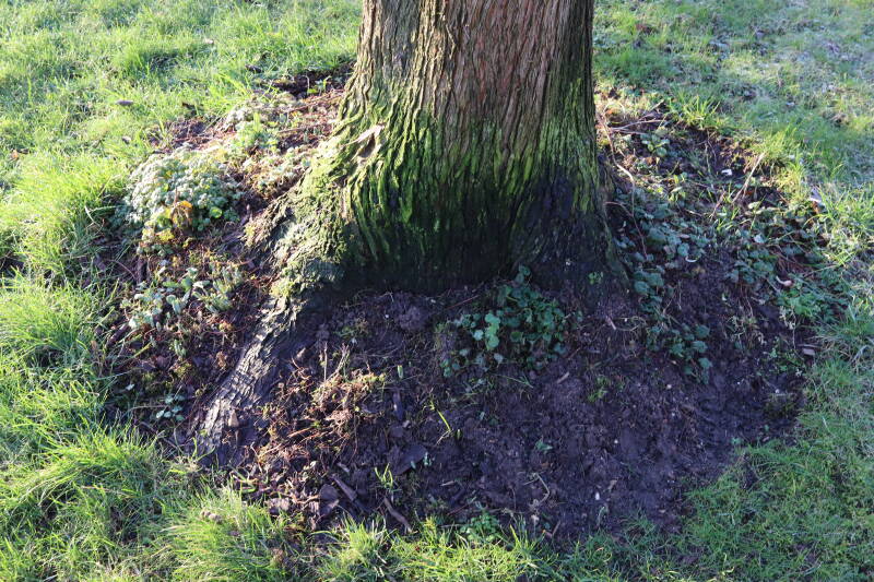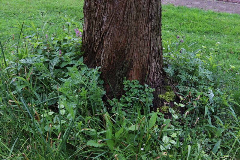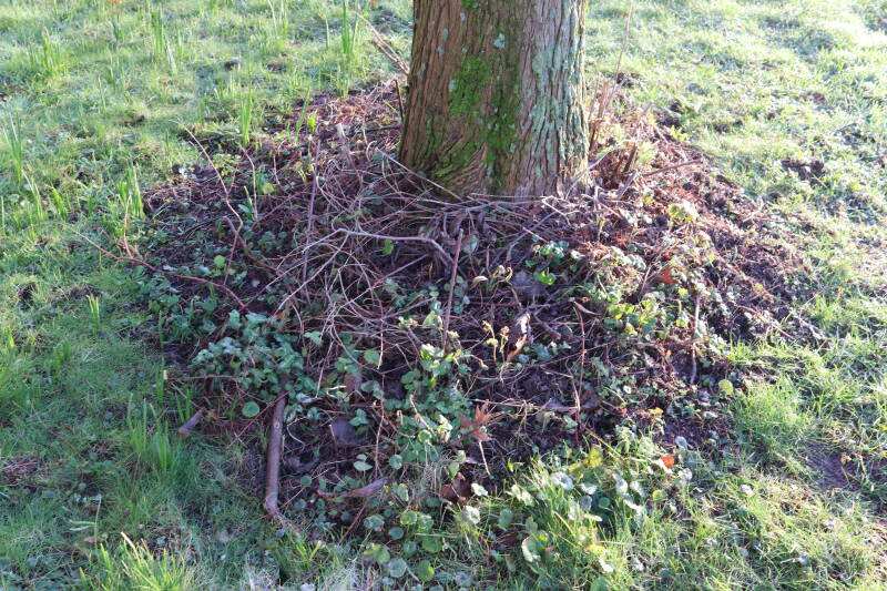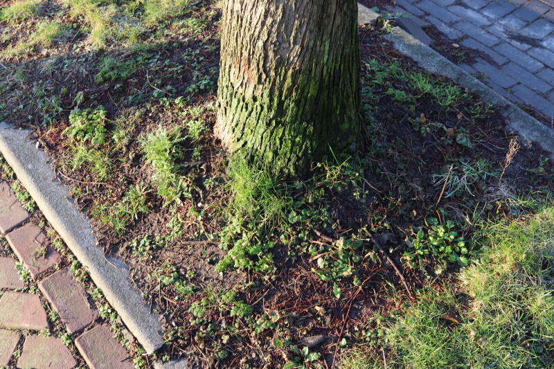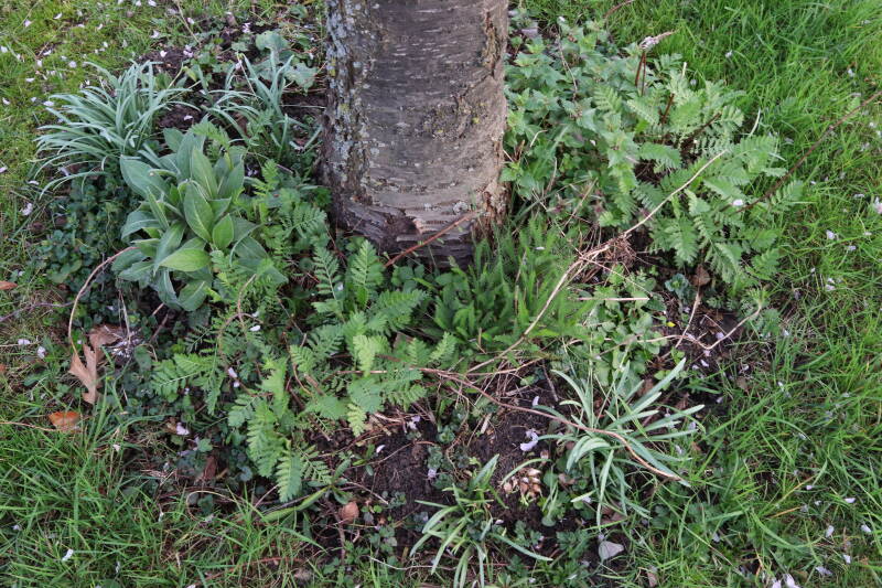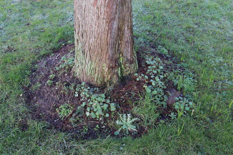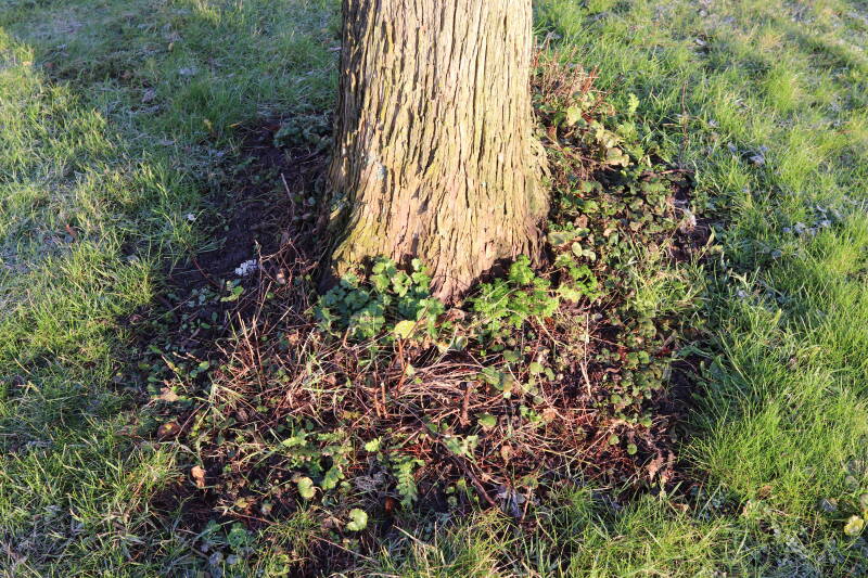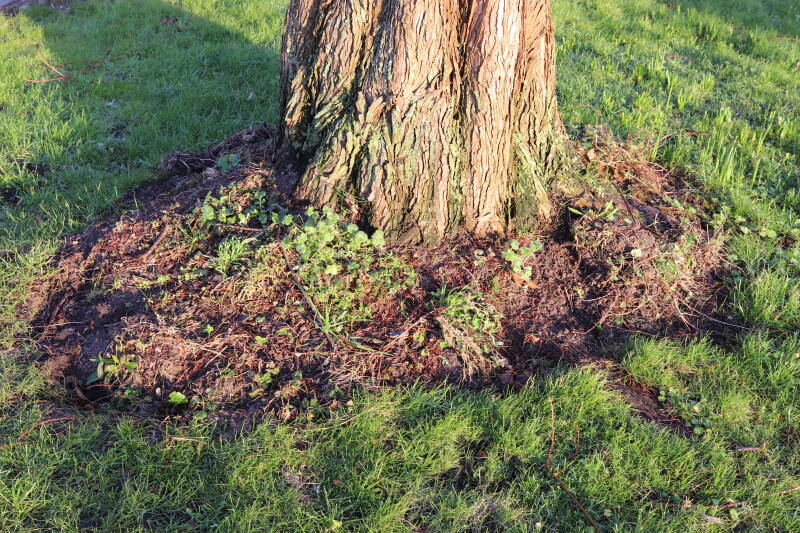 Na het omzagen van een boom in het laantje heb ik de beplanting er om heen verspreid over andere boomspiegels, plus een andere loofboom Prunus avium (zoete kers) van een boomspiegel voorzien, om het aantal voor dit jaar gelijk te houden met waar ik het afgelopen jaar mee ben geëindigd. Ik verwacht op kort termijn dat de stobbe van de Metasequoia glyptostroboides (Chinese moerascypres) tot onder het maaiveld wordt gefreesd en dan blijft er niets over van de bolgewassen en kruidachtige planten die er hebben gestaan. Het gefreesde afval zal in dat geval worden afgevoerd en het ontstane gat worden gedicht met grond, waar de maaier straks over heen zal rijden om het gras kort te houden. Er zal dan bovengronds geen spoor meer te bekennen zijn van de boom die er ooit heeft gestaan.