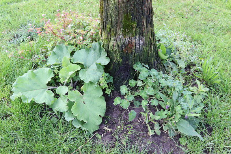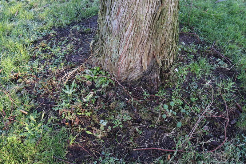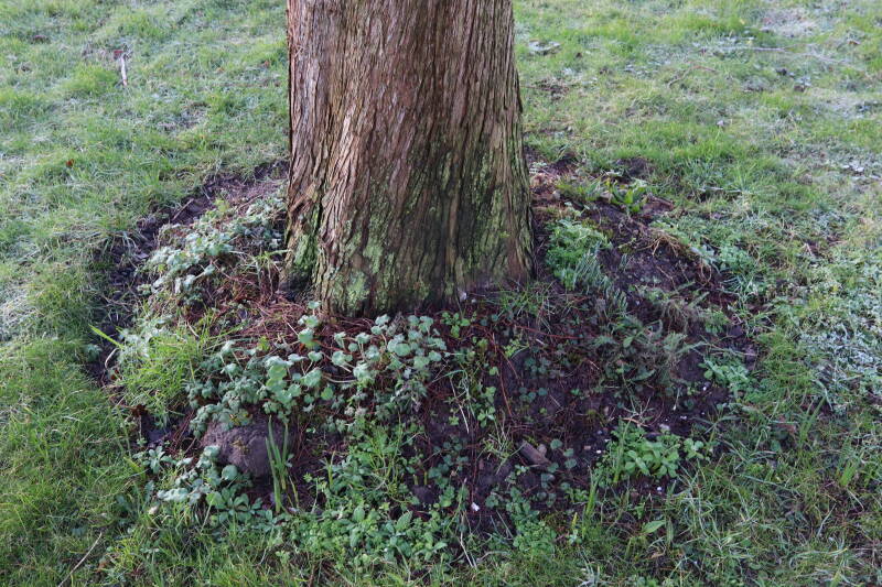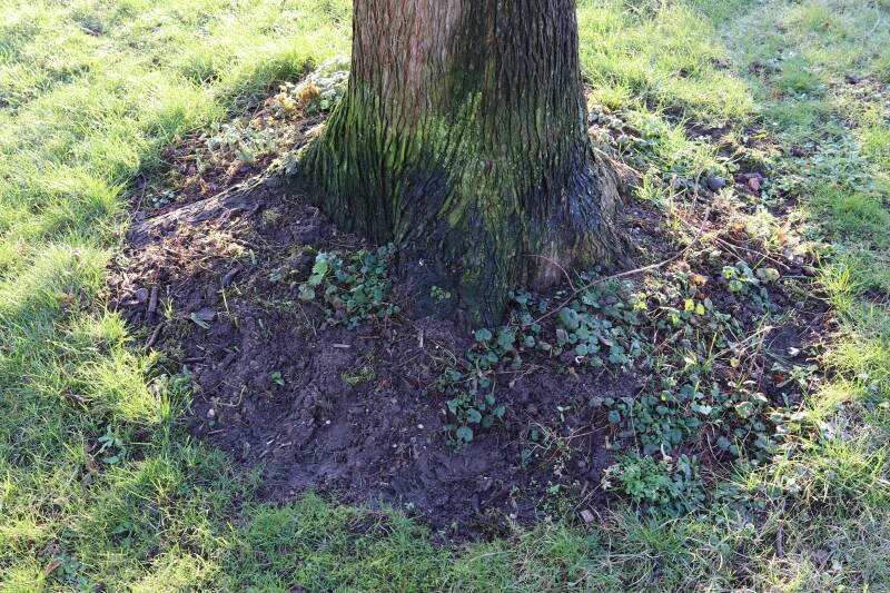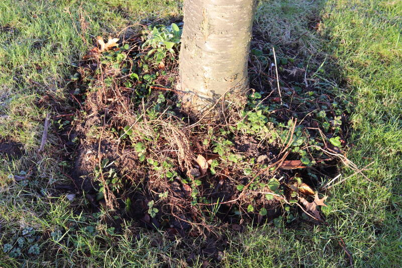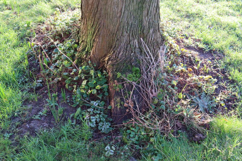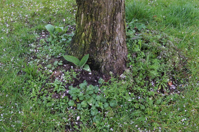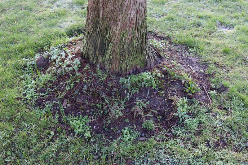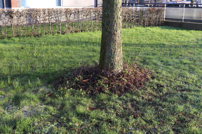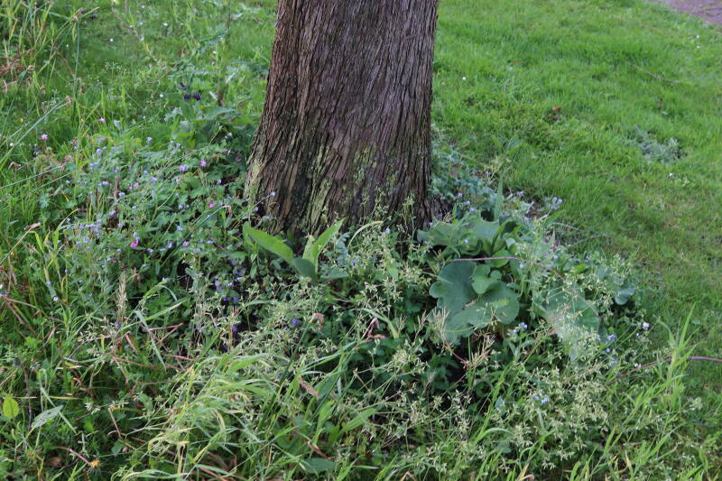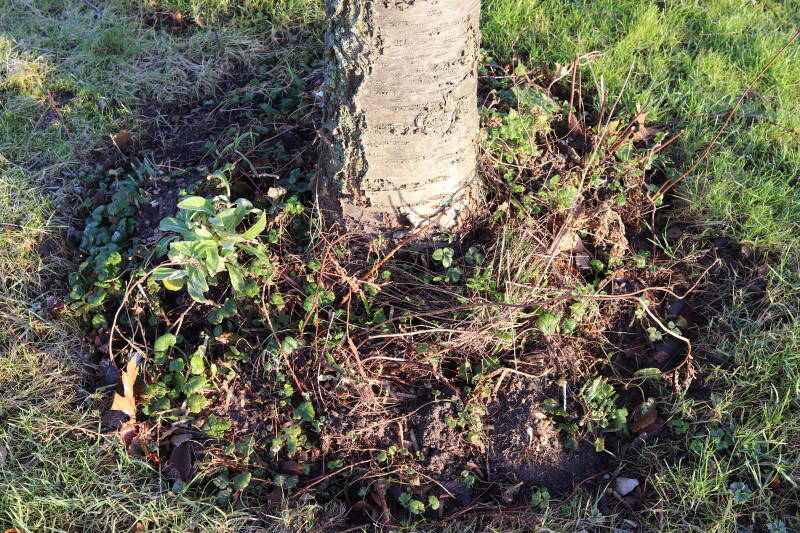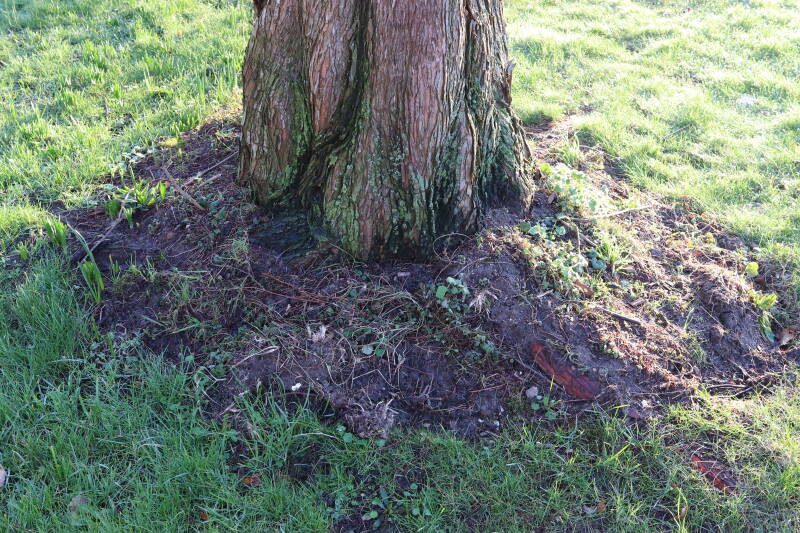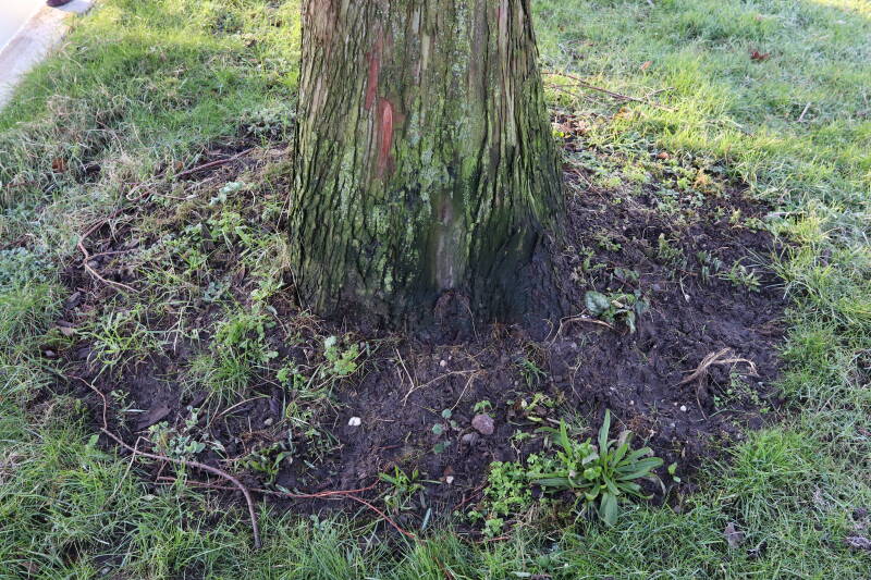 Na het omzagen van een boom in het laantje heb ik de beplanting er om heen verspreid over andere boomspiegels, plus een andere loofboom Prunus avium (zoete kers) van een boomspiegel voorzien, om het aantal voor dit jaar gelijk te houden met waar ik het afgelopen jaar mee ben geëindigd. Ik verwacht op kort termijn dat de stobbe van de Metasequoia glyptostroboides (Chinese moerascypres) tot onder het maaiveld wordt gefreesd en dan blijft er niets over van de bolgewassen en kruidachtige planten die er hebben gestaan. Het gefreesde afval zal in dat geval worden afgevoerd en het ontstane gat worden gedicht met grond, waar de maaier straks over heen zal rijden om het gras kort te houden. Er zal dan bovengronds geen spoor meer te bekennen zijn van de boom die er ooit heeft gestaan.