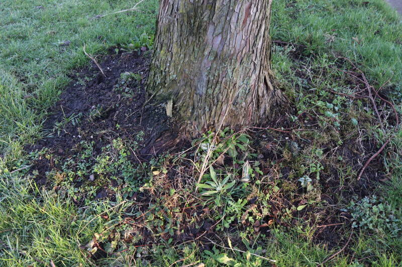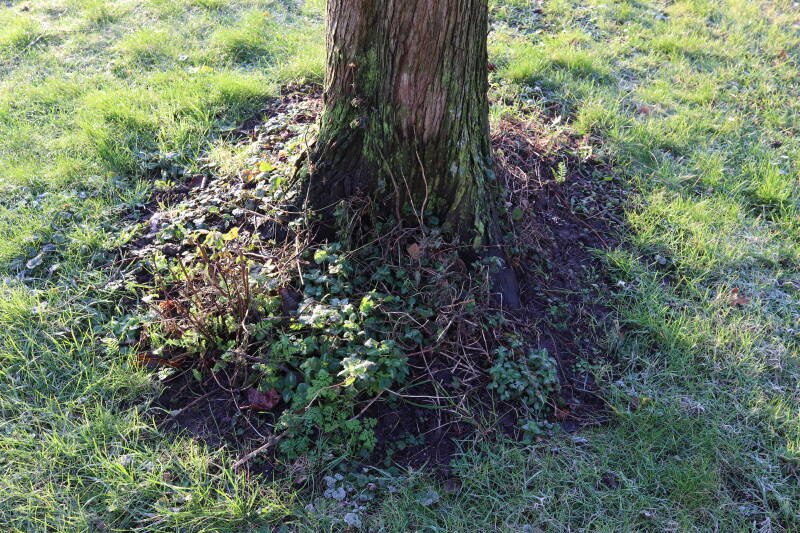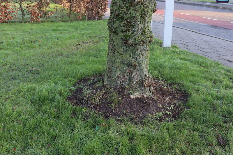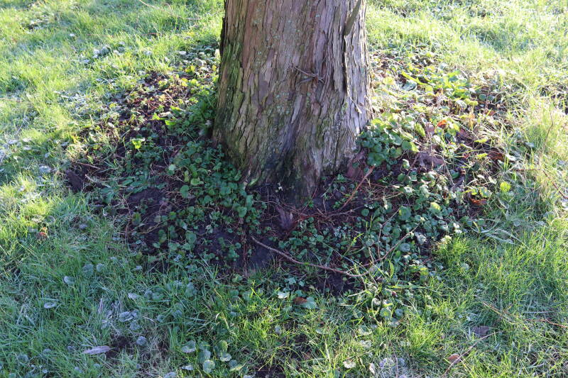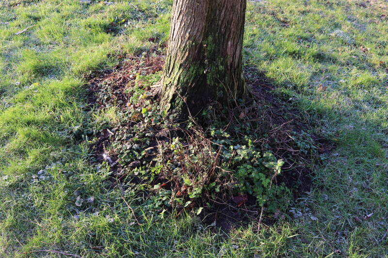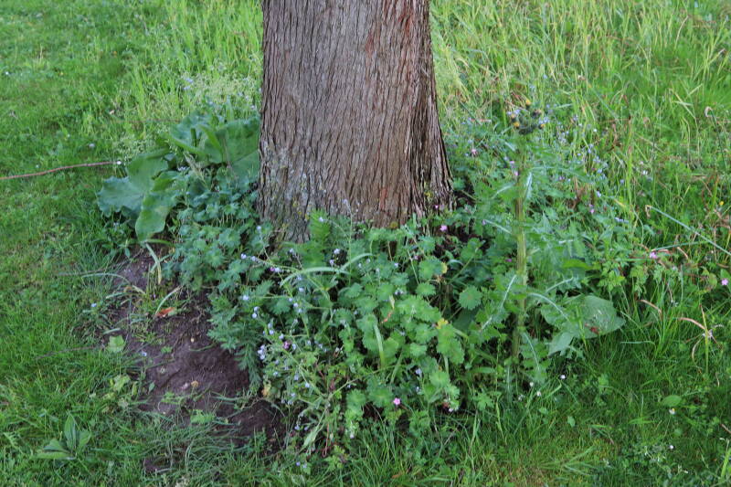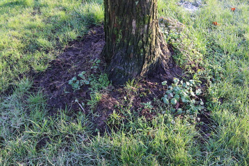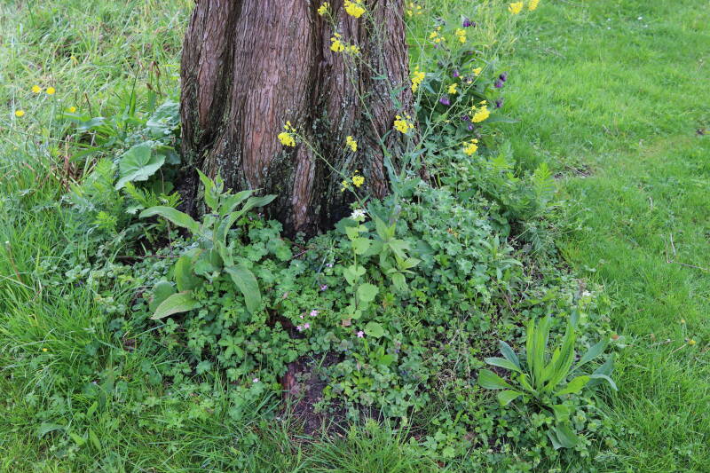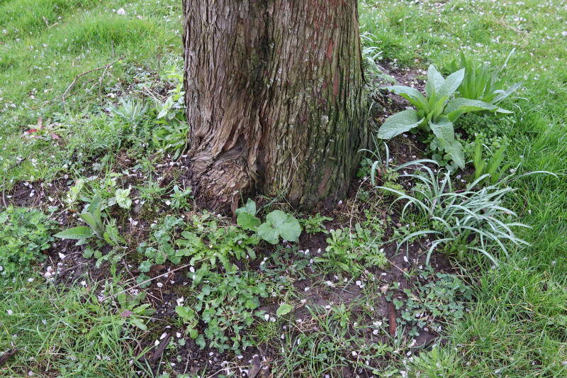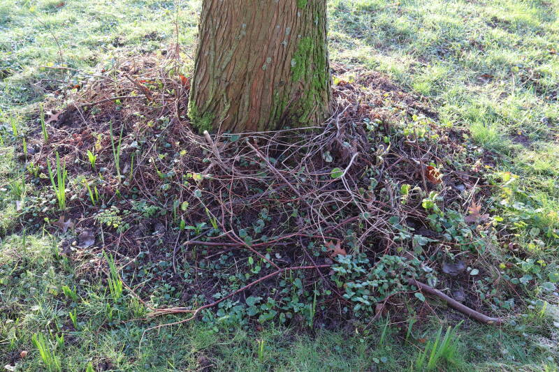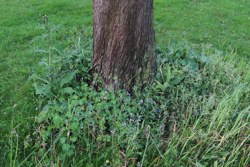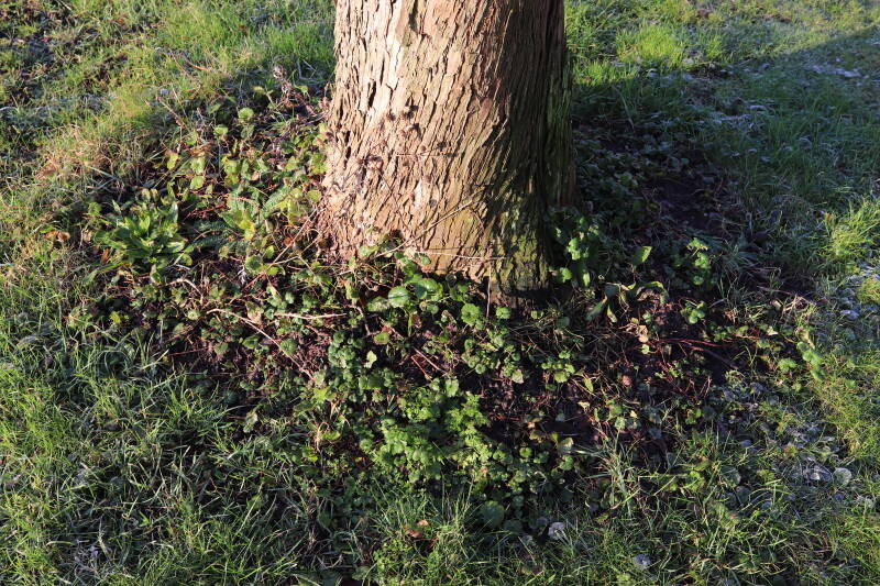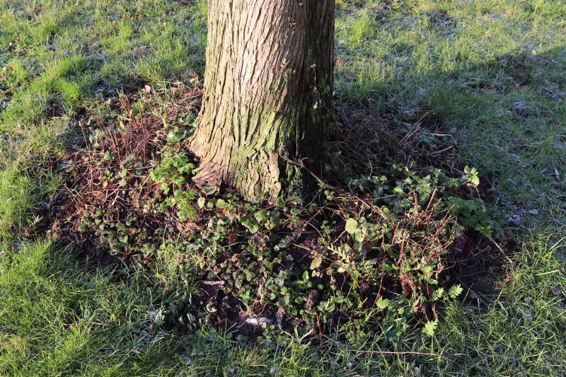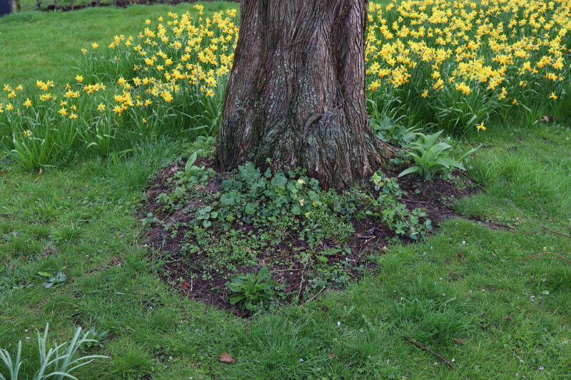 Na het omzagen van een boom in het laantje heb ik de beplanting er om heen verspreid over andere boomspiegels, plus een andere loofboom Prunus avium (zoete kers) van een boomspiegel voorzien, om het aantal voor dit jaar gelijk te houden met waar ik het afgelopen jaar mee ben geëindigd. Ik verwacht op kort termijn dat de stobbe van de Metasequoia glyptostroboides (Chinese moerascypres) tot onder het maaiveld wordt gefreesd en dan blijft er niets over van de bolgewassen en kruidachtige planten die er hebben gestaan. Het gefreesde afval zal in dat geval worden afgevoerd en het ontstane gat worden gedicht met grond, waar de maaier straks over heen zal rijden om het gras kort te houden. Er zal dan bovengronds geen spoor meer te bekennen zijn van de boom die er ooit heeft gestaan.