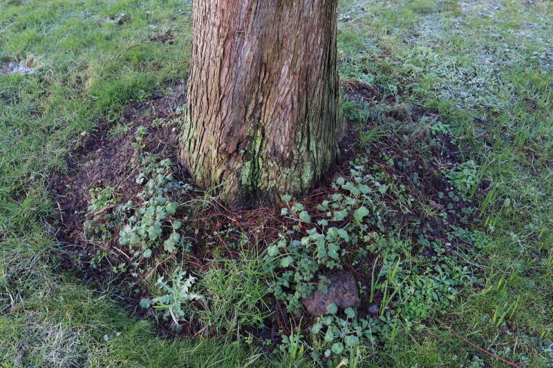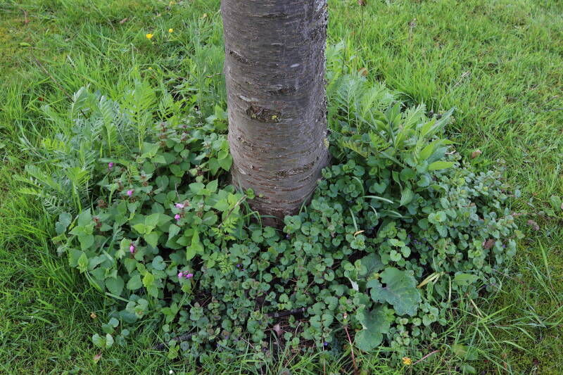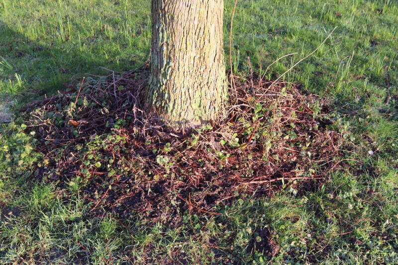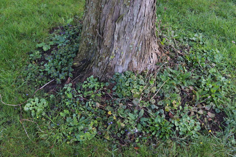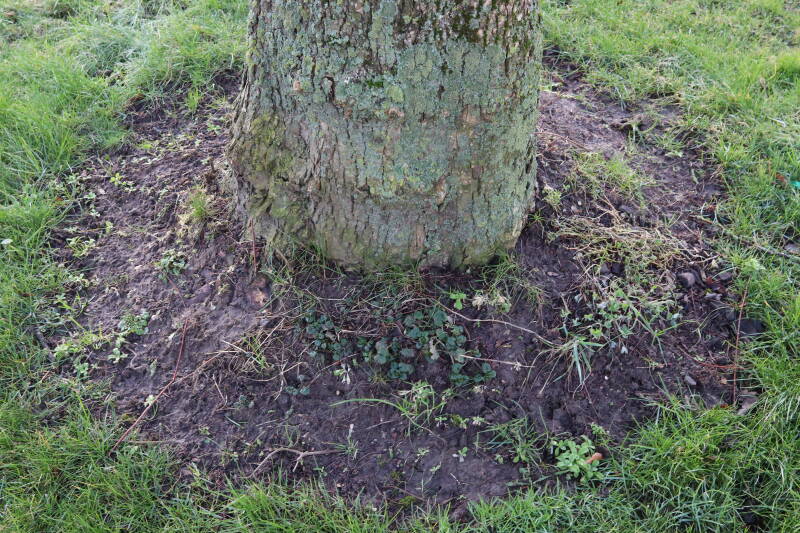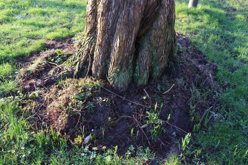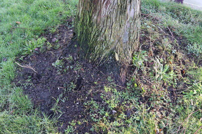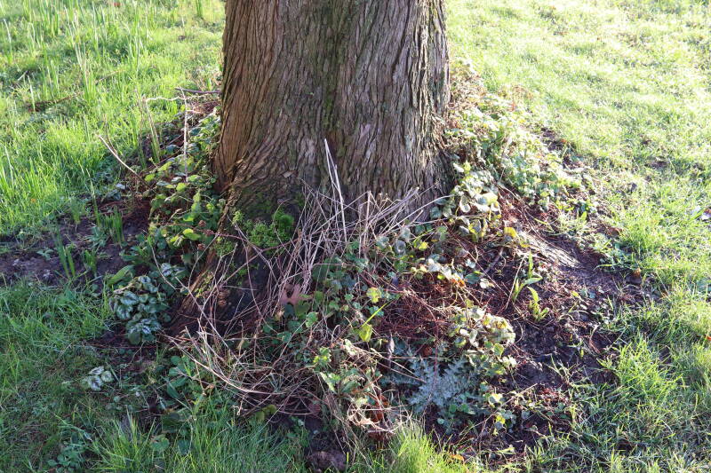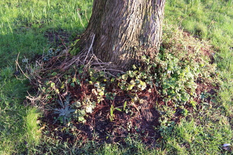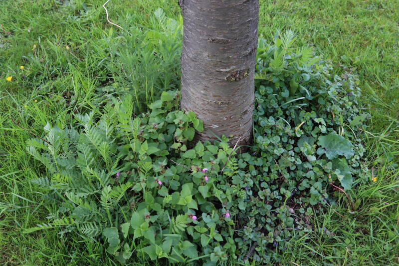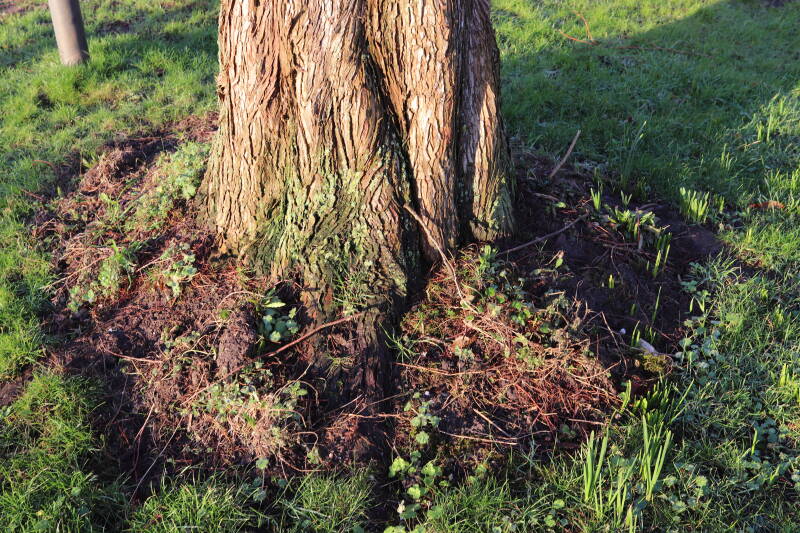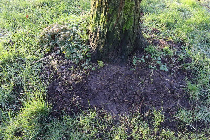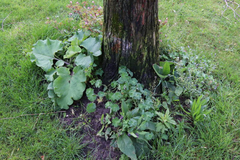 Na het omzagen van een boom in het laantje heb ik de beplanting er om heen verspreid over andere boomspiegels, plus een andere loofboom Prunus avium (zoete kers) van een boomspiegel voorzien, om het aantal voor dit jaar gelijk te houden met waar ik het afgelopen jaar mee ben geëindigd. Ik verwacht op kort termijn dat de stobbe van de Metasequoia glyptostroboides (Chinese moerascypres) tot onder het maaiveld wordt gefreesd en dan blijft er niets over van de bolgewassen en kruidachtige planten die er hebben gestaan. Het gefreesde afval zal in dat geval worden afgevoerd en het ontstane gat worden gedicht met grond, waar de maaier straks over heen zal rijden om het gras kort te houden. Er zal dan bovengronds geen spoor meer te bekennen zijn van de boom die er ooit heeft gestaan.