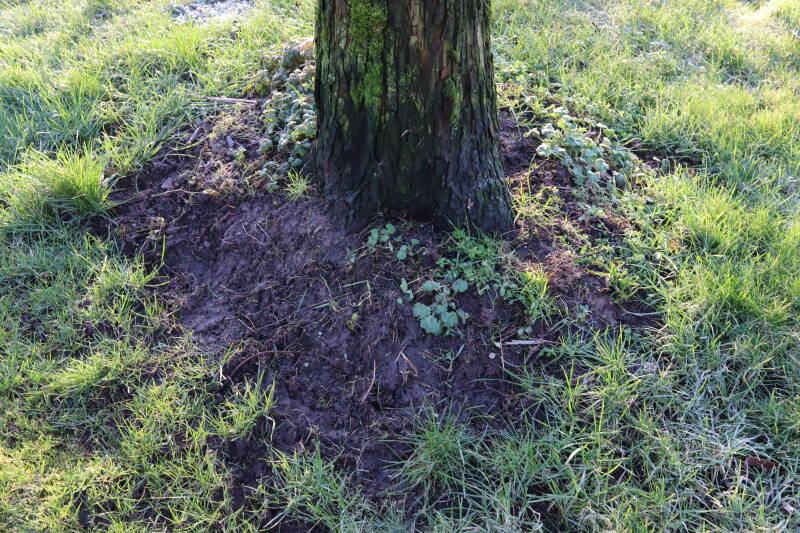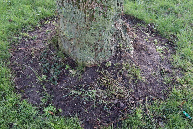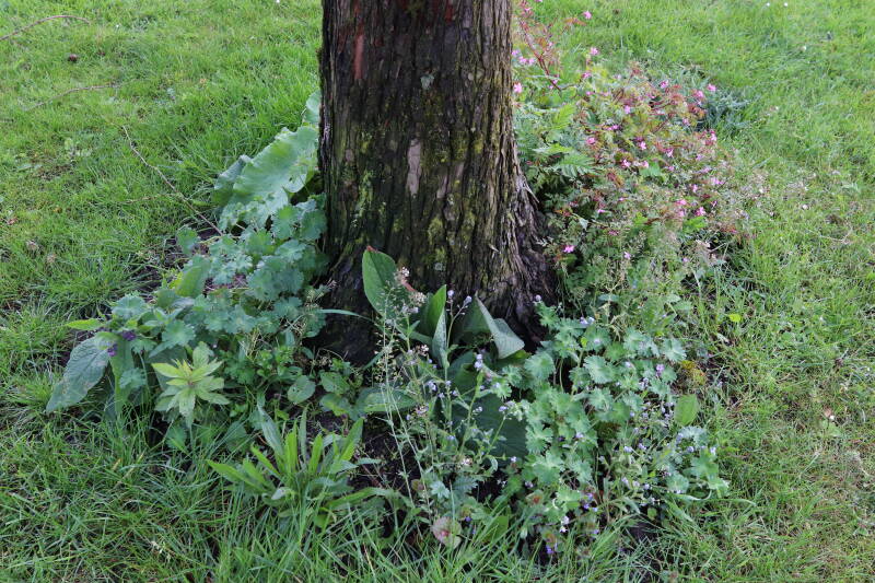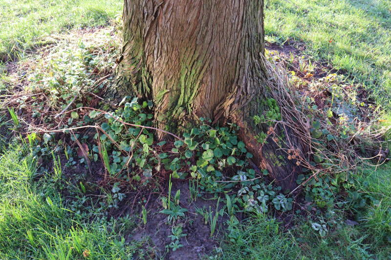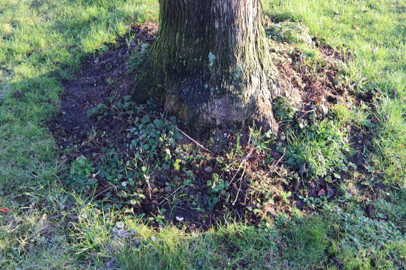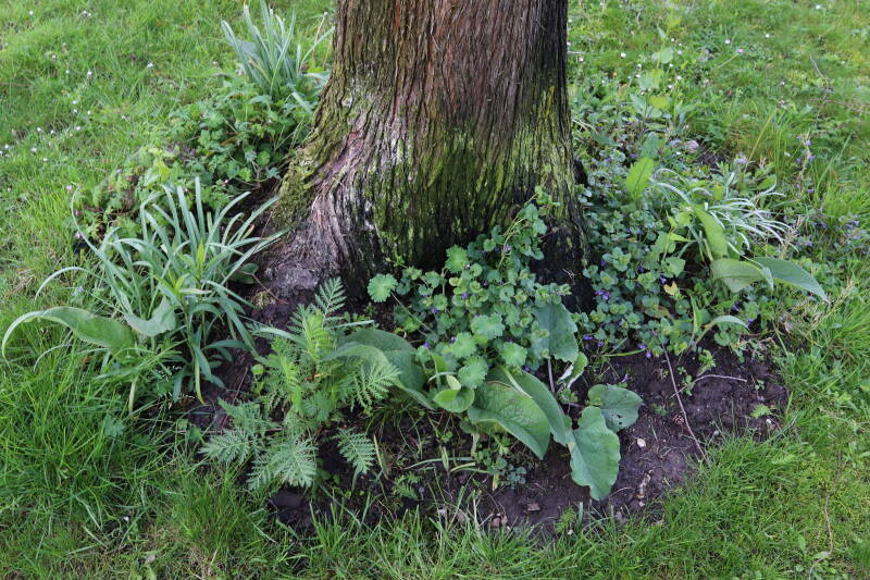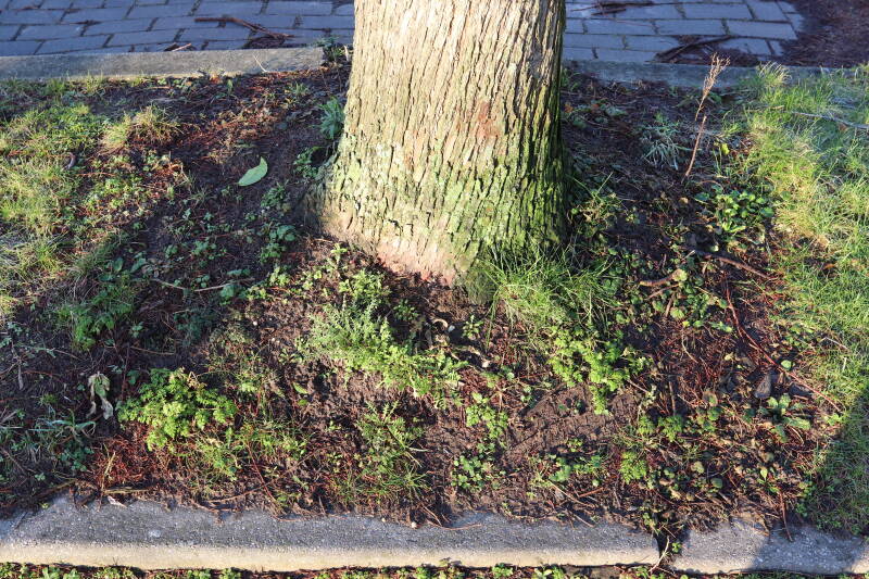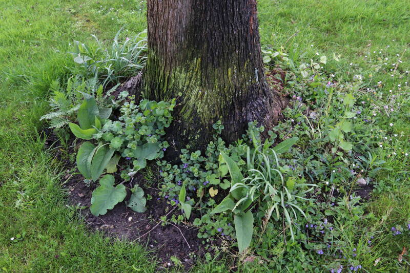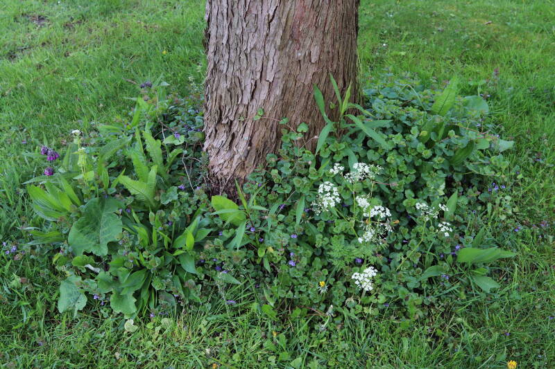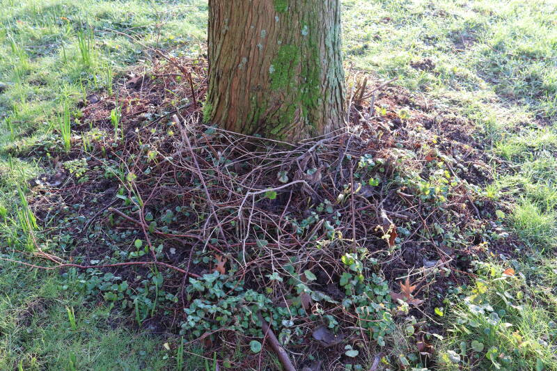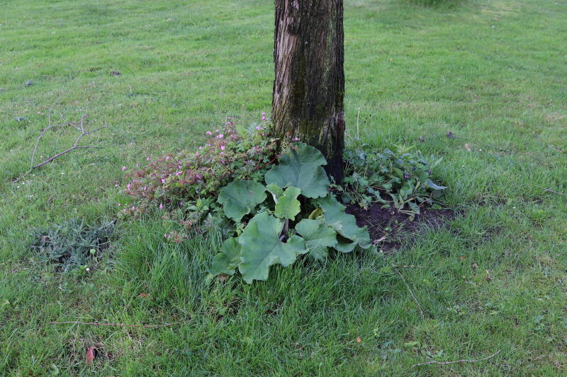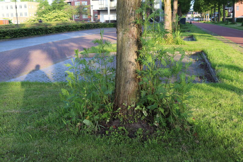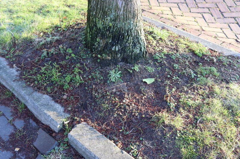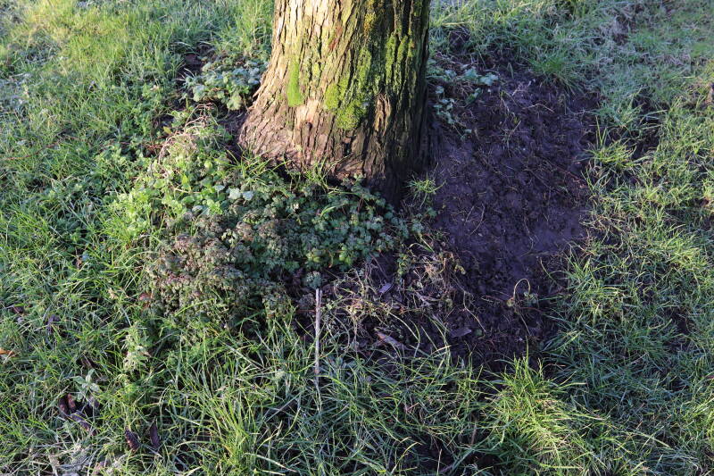 Na het omzagen van een boom in het laantje heb ik de beplanting er om heen verspreid over andere boomspiegels, plus een andere loofboom Prunus avium (zoete kers) van een boomspiegel voorzien, om het aantal voor dit jaar gelijk te houden met waar ik het afgelopen jaar mee ben geëindigd. Ik verwacht op kort termijn dat de stobbe van de Metasequoia glyptostroboides (Chinese moerascypres) tot onder het maaiveld wordt gefreesd en dan blijft er niets over van de bolgewassen en kruidachtige planten die er hebben gestaan. Het gefreesde afval zal in dat geval worden afgevoerd en het ontstane gat worden gedicht met grond, waar de maaier straks over heen zal rijden om het gras kort te houden. Er zal dan bovengronds geen spoor meer te bekennen zijn van de boom die er ooit heeft gestaan.