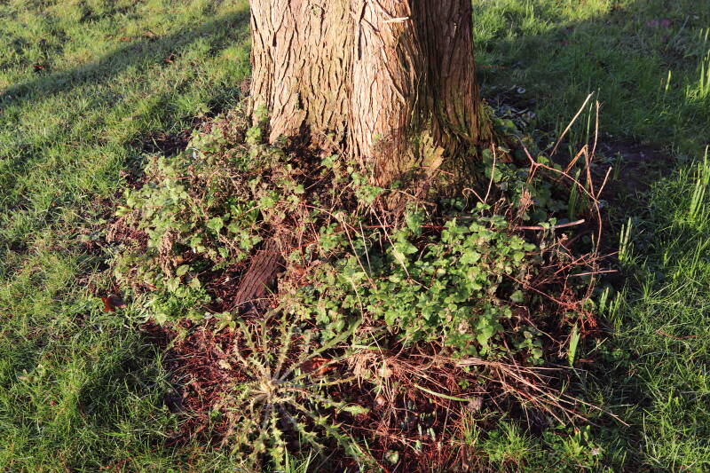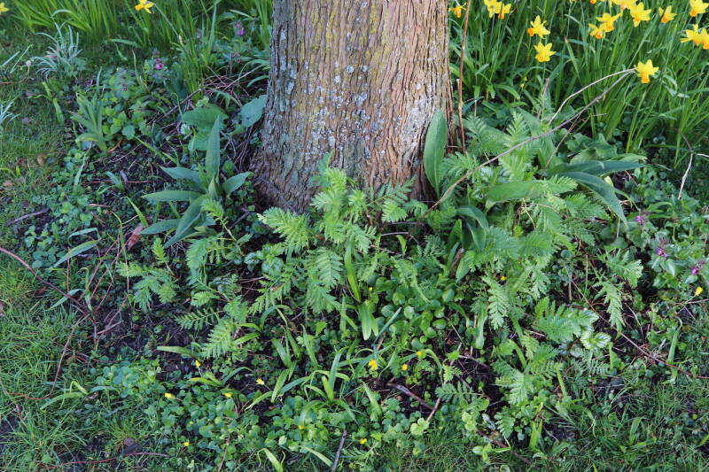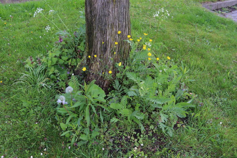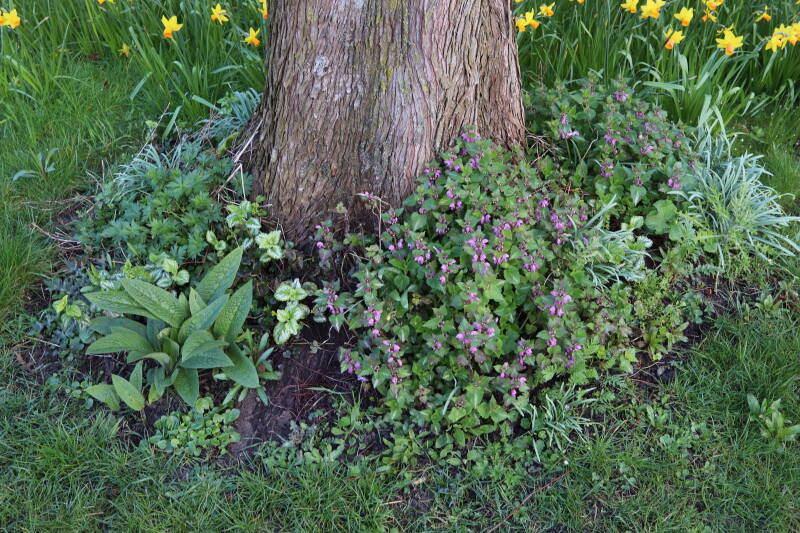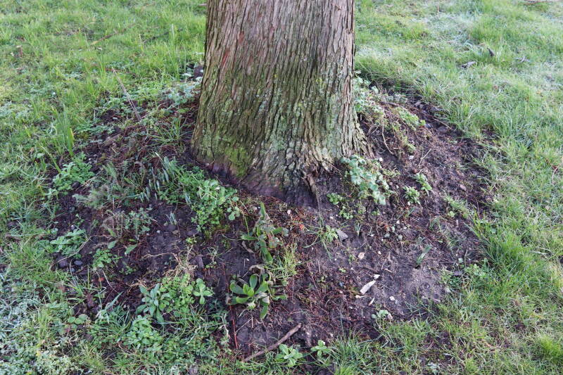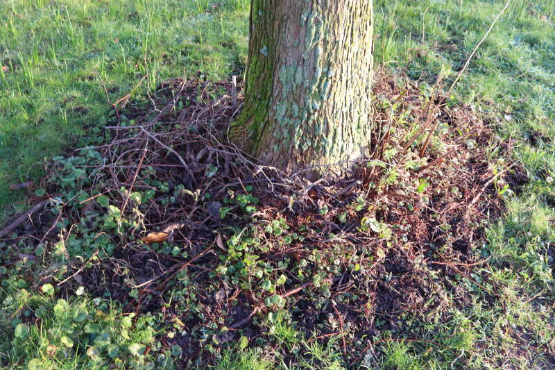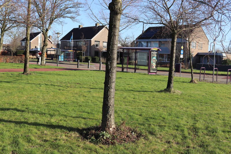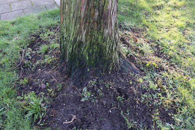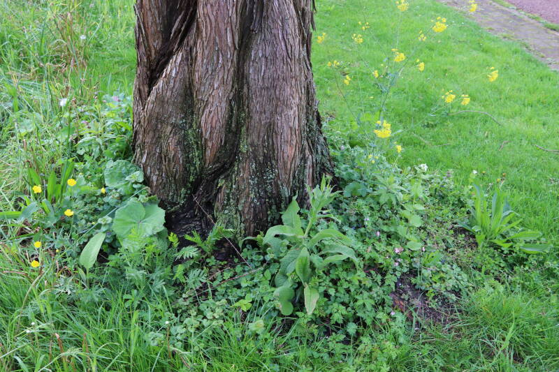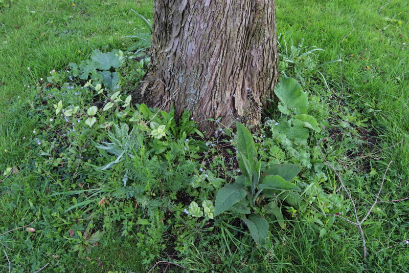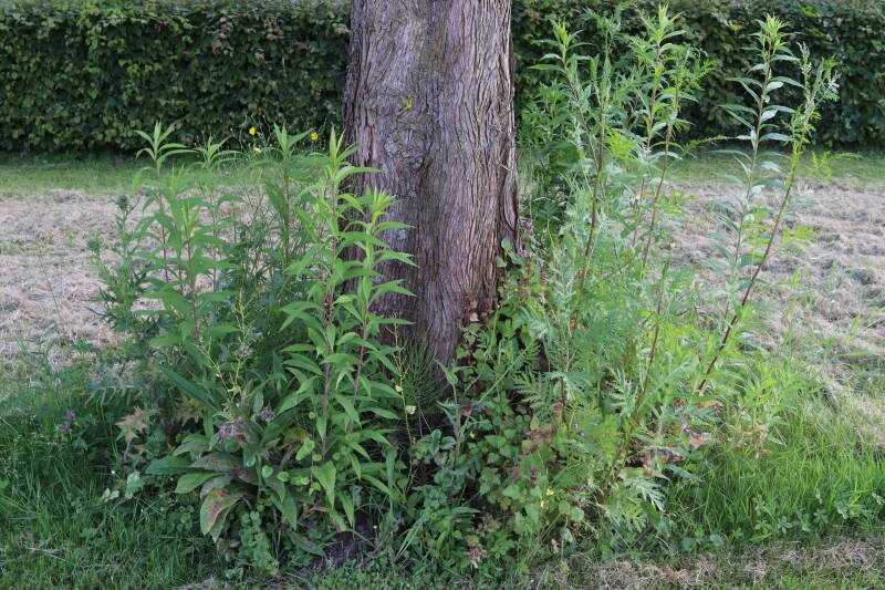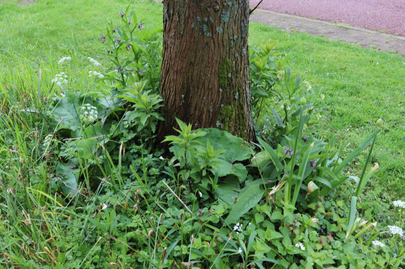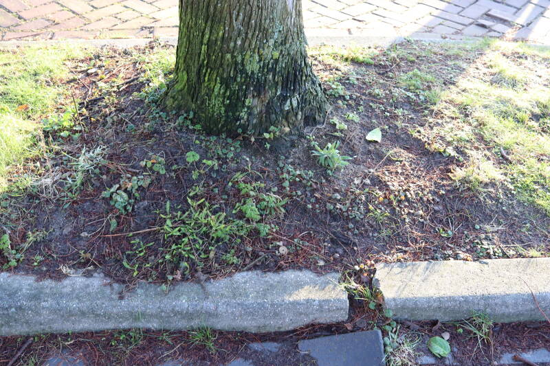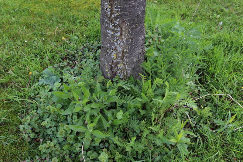 Na het omzagen van een boom in het laantje heb ik de beplanting er om heen verspreid over andere boomspiegels, plus een andere loofboom Prunus avium (zoete kers) van een boomspiegel voorzien, om het aantal voor dit jaar gelijk te houden met waar ik het afgelopen jaar mee ben geëindigd. Ik verwacht op kort termijn dat de stobbe van de Metasequoia glyptostroboides (Chinese moerascypres) tot onder het maaiveld wordt gefreesd en dan blijft er niets over van de bolgewassen en kruidachtige planten die er hebben gestaan. Het gefreesde afval zal in dat geval worden afgevoerd en het ontstane gat worden gedicht met grond, waar de maaier straks over heen zal rijden om het gras kort te houden. Er zal dan bovengronds geen spoor meer te bekennen zijn van de boom die er ooit heeft gestaan.