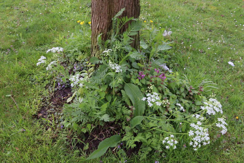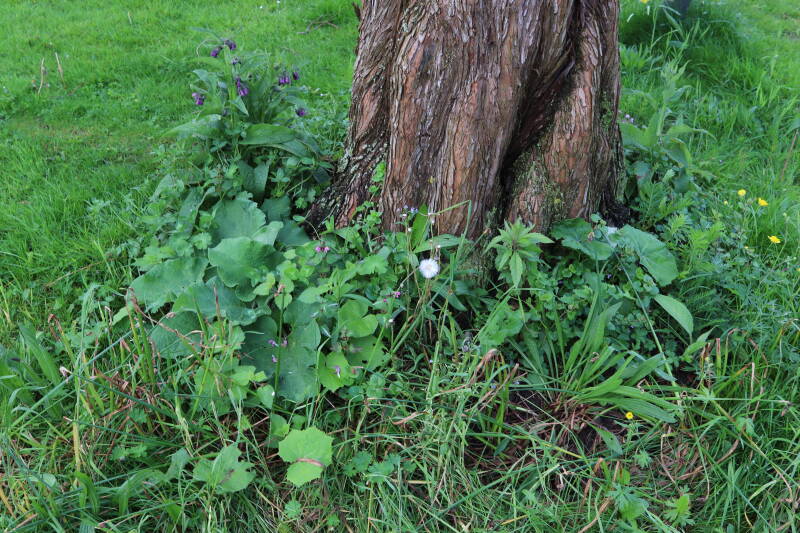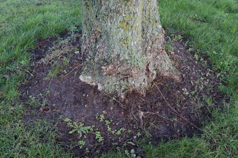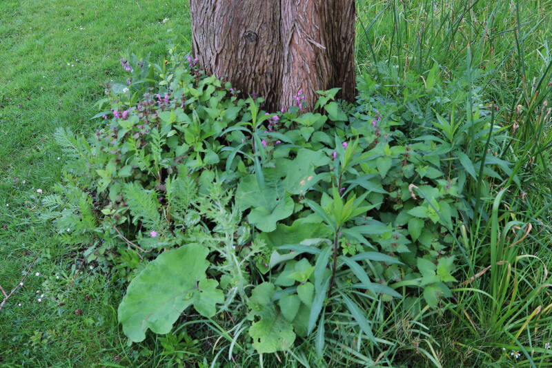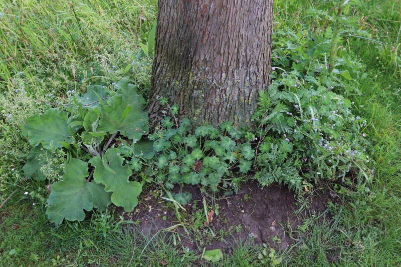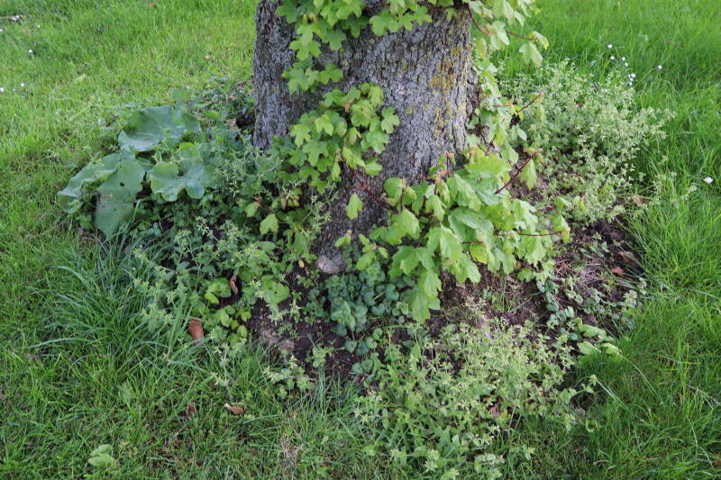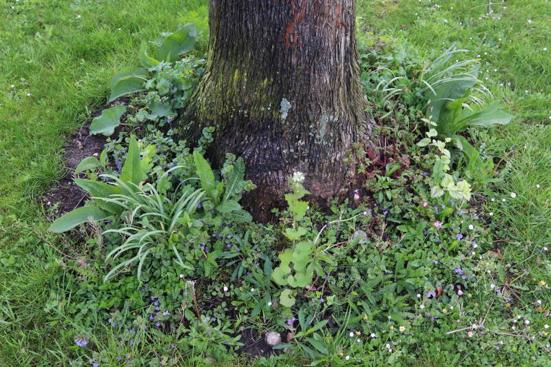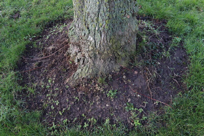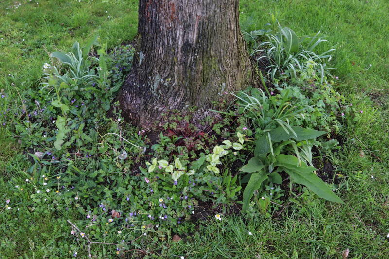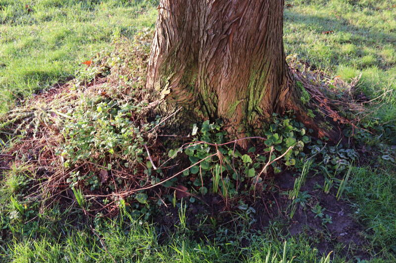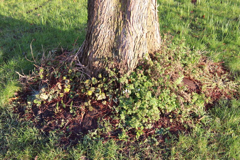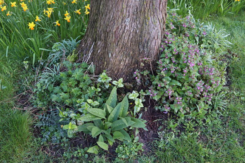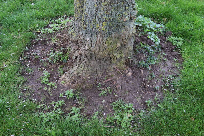 Na het omzagen van een boom in het laantje heb ik de beplanting er om heen verspreid over andere boomspiegels, plus een andere loofboom Prunus avium (zoete kers) van een boomspiegel voorzien, om het aantal voor dit jaar gelijk te houden met waar ik het afgelopen jaar mee ben geëindigd. Ik verwacht op kort termijn dat de stobbe van de Metasequoia glyptostroboides (Chinese moerascypres) tot onder het maaiveld wordt gefreesd en dan blijft er niets over van de bolgewassen en kruidachtige planten die er hebben gestaan. Het gefreesde afval zal in dat geval worden afgevoerd en het ontstane gat worden gedicht met grond, waar de maaier straks over heen zal rijden om het gras kort te houden. Er zal dan bovengronds geen spoor meer te bekennen zijn van de boom die er ooit heeft gestaan.