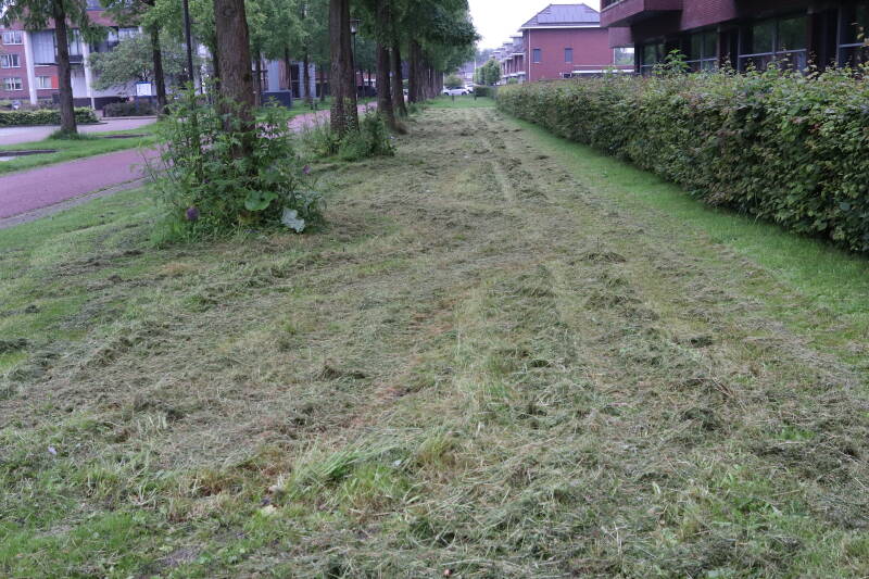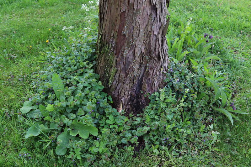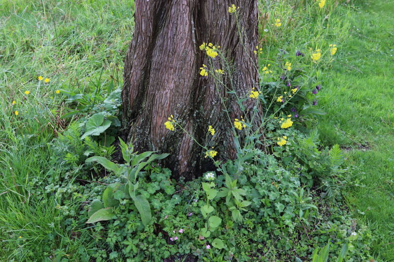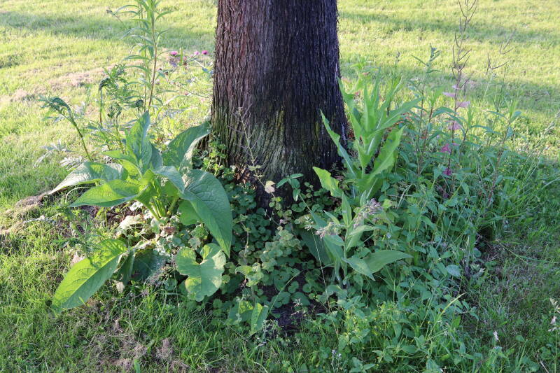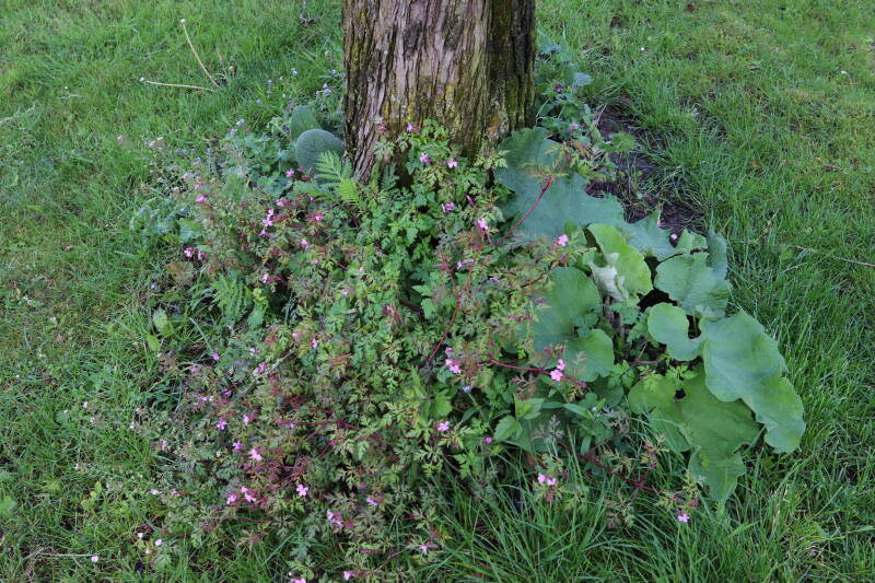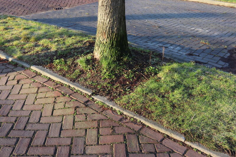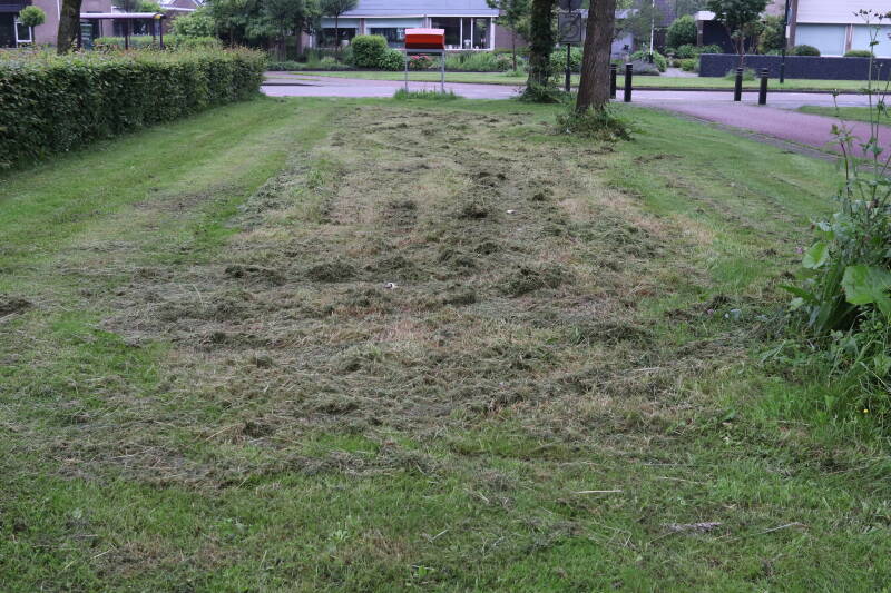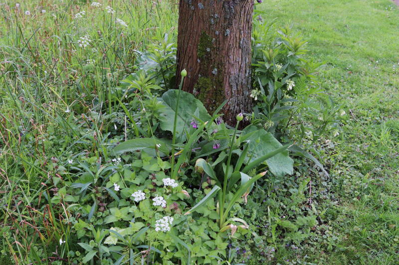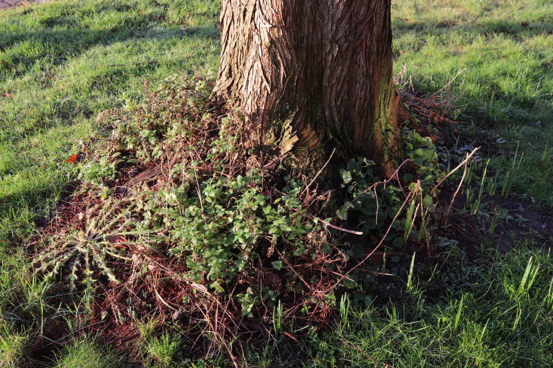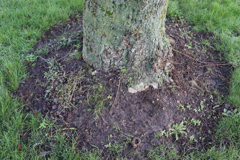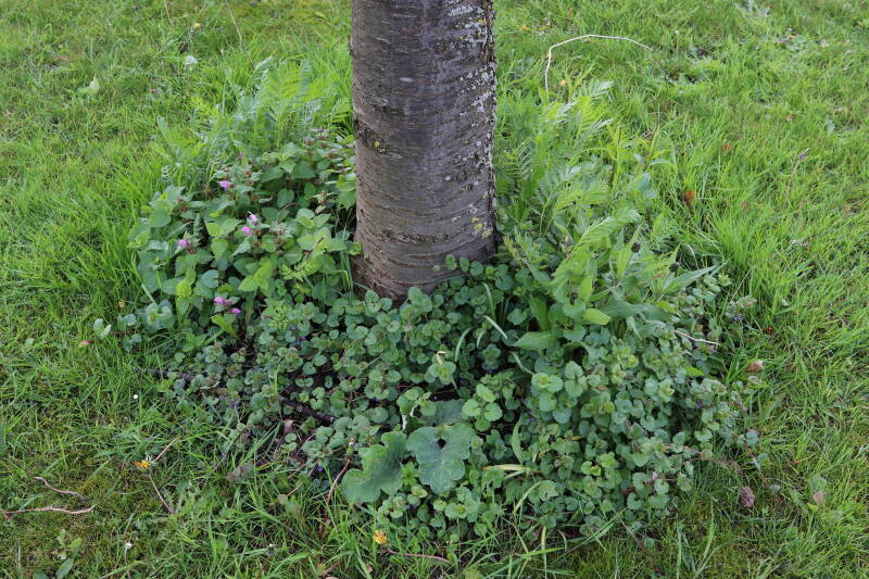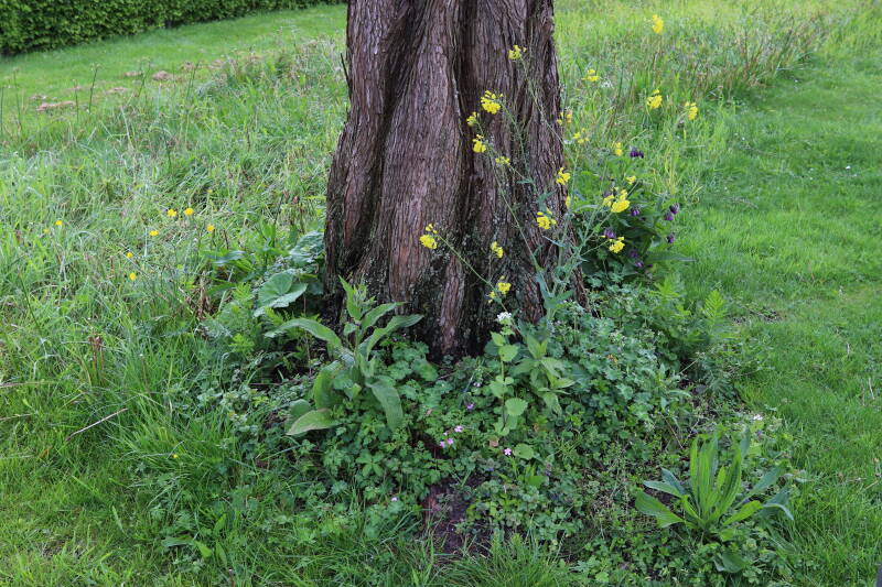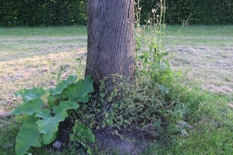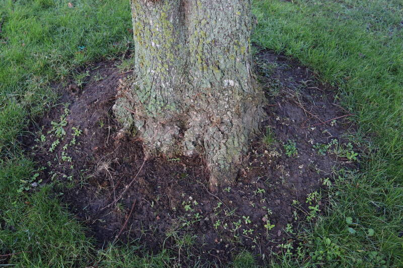 Na het omzagen van een boom in het laantje heb ik de beplanting er om heen verspreid over andere boomspiegels, plus een andere loofboom Prunus avium (zoete kers) van een boomspiegel voorzien, om het aantal voor dit jaar gelijk te houden met waar ik het afgelopen jaar mee ben geëindigd. Ik verwacht op kort termijn dat de stobbe van de Metasequoia glyptostroboides (Chinese moerascypres) tot onder het maaiveld wordt gefreesd en dan blijft er niets over van de bolgewassen en kruidachtige planten die er hebben gestaan. Het gefreesde afval zal in dat geval worden afgevoerd en het ontstane gat worden gedicht met grond, waar de maaier straks over heen zal rijden om het gras kort te houden. Er zal dan bovengronds geen spoor meer te bekennen zijn van de boom die er ooit heeft gestaan.