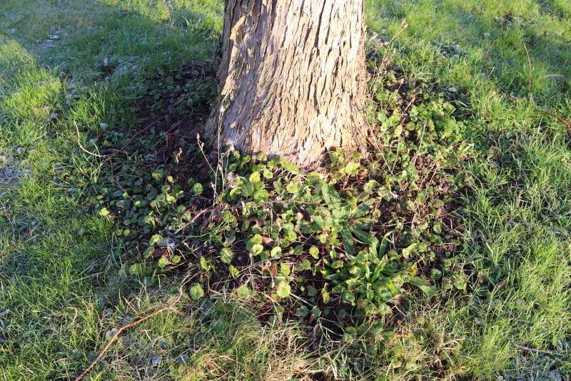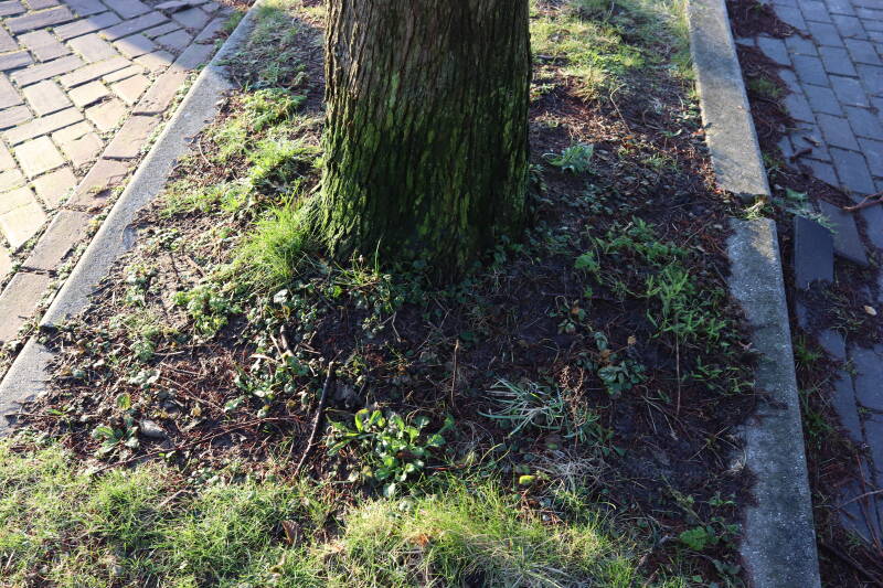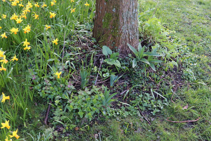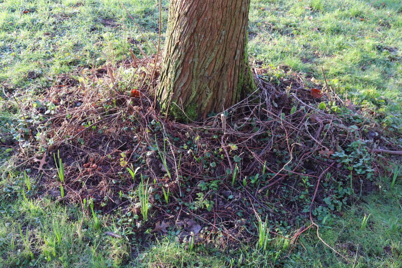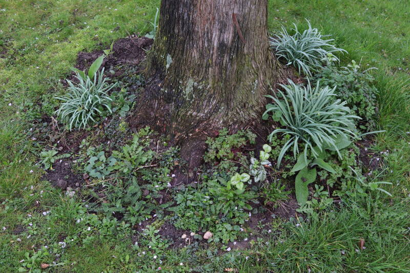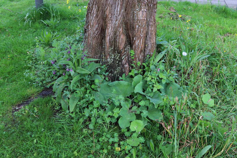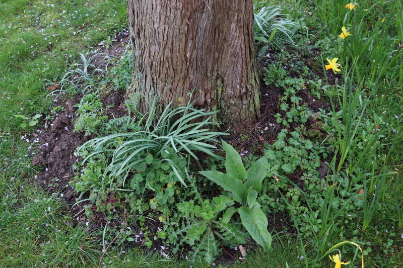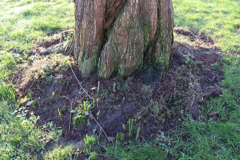 De eerste onderhoudsronde van het jaar bestaat voor mij uit het verwijderen van grassen en terugzetten van uitgegraven bollen en planten. De boomspiegels rondom de Metasequoia glyptostroboides (Chinese moerascipres) die al eerder zijn beplant bevatte aanzienlijk minder grassen dan de recent aangelegde boomspiegels. De vormen van de boomspiegels verschilt ook per boom. Ik heb nu meer opgelet waar de chauffeur op de grasmaaier precies rijdt en daar waar hij niet of slecht met de machine bij kan komen de boomspiegel verder uitgebreid. Ik hoop hiermee te bereiken dat meer kruidachtige planten ongemoeid worden gelaten tijdens de maaiwerkzaamheden, die later van het jaar weer van start gaan. Hier en daar waren er graafsporen te bekennen en lagen wat bolletjes in het zonlicht te verdrogen. Deze heb ik weer aan de koude grond toevertrouwd. Een paar planten die niet zo lang geleden waren verplant lagen op z'n kop naast de ondiepe gaten waar ik deze had ingezet. Ik heb in het laatste geval vogels hiermee bezig gezien tijdens de oneindige zoektocht naar voedsel. Welk dier verantwoordelijk is voor de uitgegraven bollen is mij onbekend.