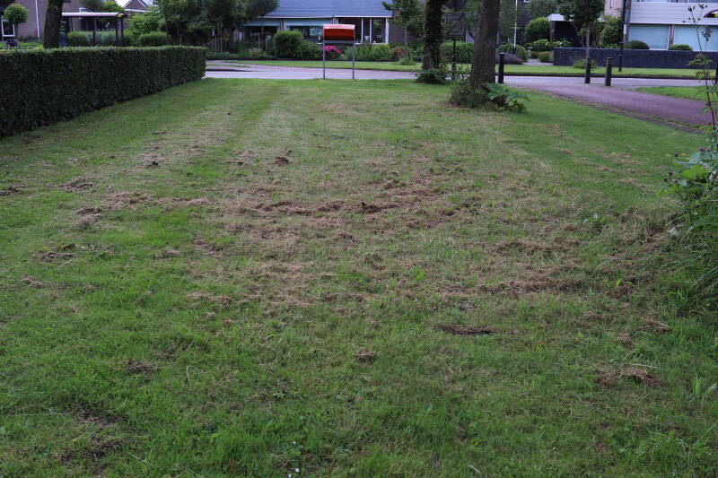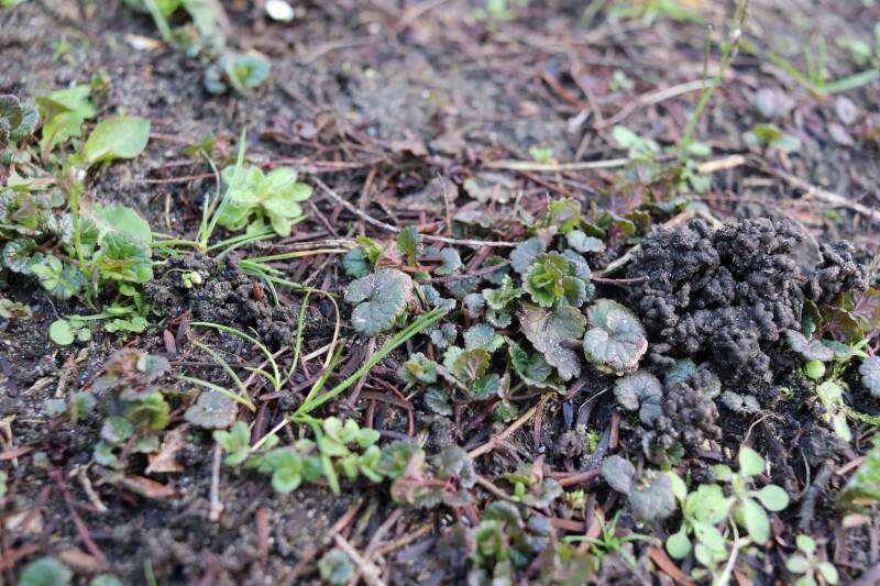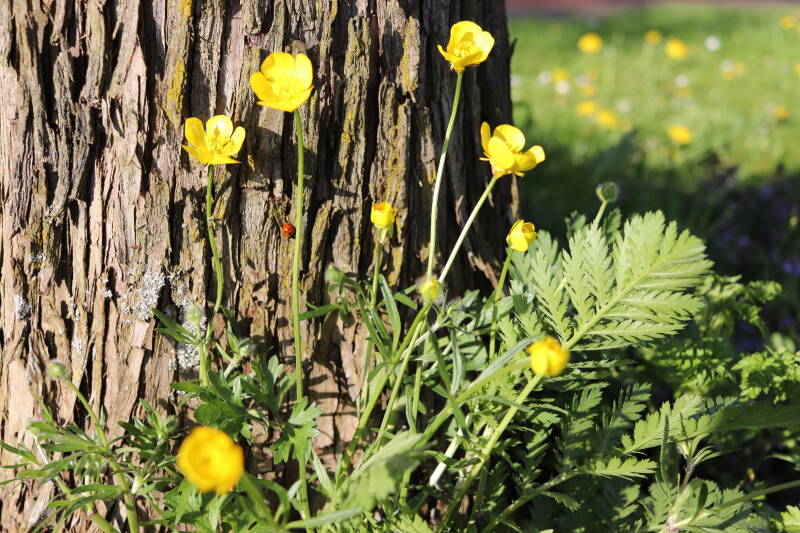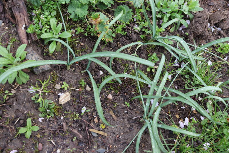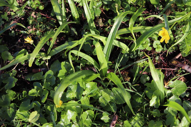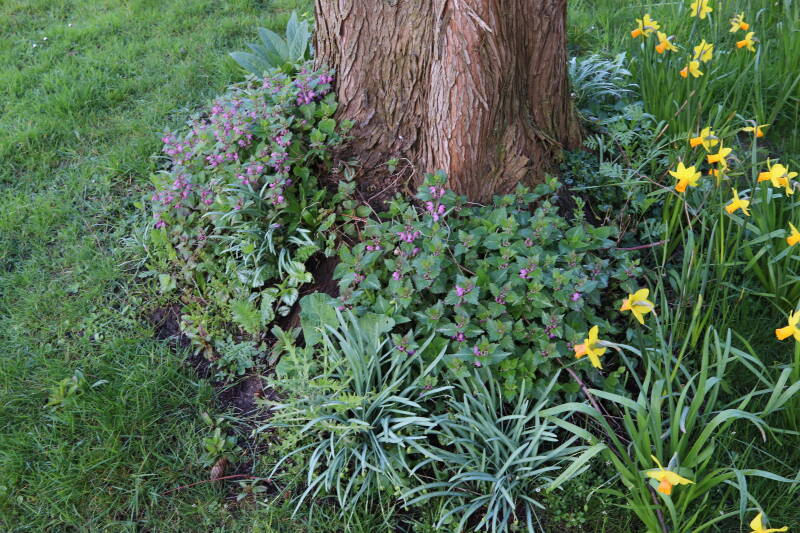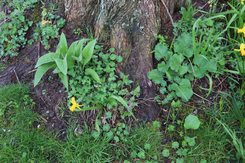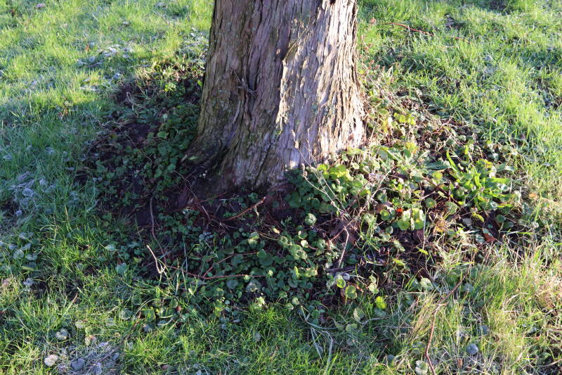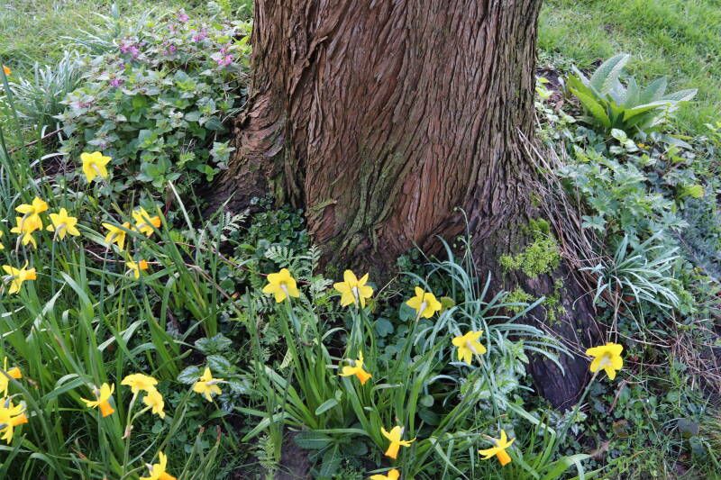 De eerste onderhoudsronde van het jaar bestaat voor mij uit het verwijderen van grassen en terugzetten van uitgegraven bollen en planten. De boomspiegels rondom de Metasequoia glyptostroboides (Chinese moerascipres) die al eerder zijn beplant bevatte aanzienlijk minder grassen dan de recent aangelegde boomspiegels. De vormen van de boomspiegels verschilt ook per boom. Ik heb nu meer opgelet waar de chauffeur op de grasmaaier precies rijdt en daar waar hij niet of slecht met de machine bij kan komen de boomspiegel verder uitgebreid. Ik hoop hiermee te bereiken dat meer kruidachtige planten ongemoeid worden gelaten tijdens de maaiwerkzaamheden, die later van het jaar weer van start gaan. Hier en daar waren er graafsporen te bekennen en lagen wat bolletjes in het zonlicht te verdrogen. Deze heb ik weer aan de koude grond toevertrouwd. Een paar planten die niet zo lang geleden waren verplant lagen op z'n kop naast de ondiepe gaten waar ik deze had ingezet. Ik heb in het laatste geval vogels hiermee bezig gezien tijdens de oneindige zoektocht naar voedsel. Welk dier verantwoordelijk is voor de uitgegraven bollen is mij onbekend.