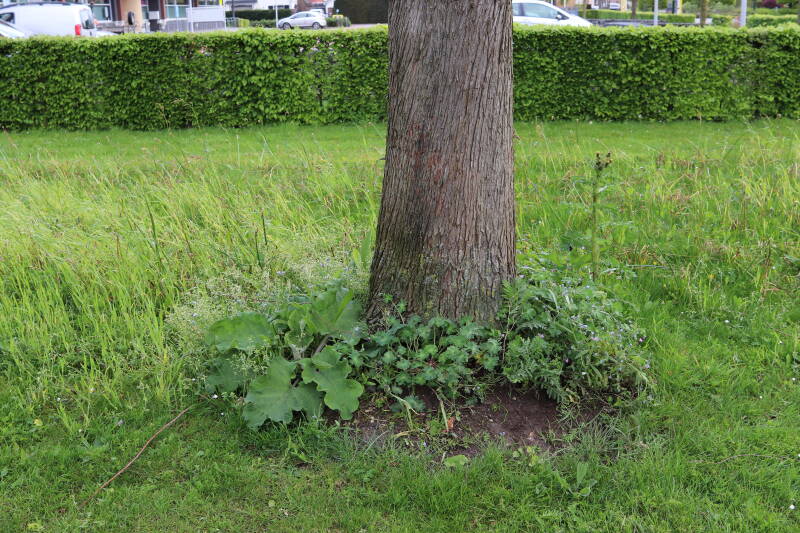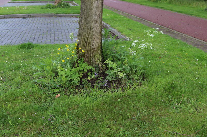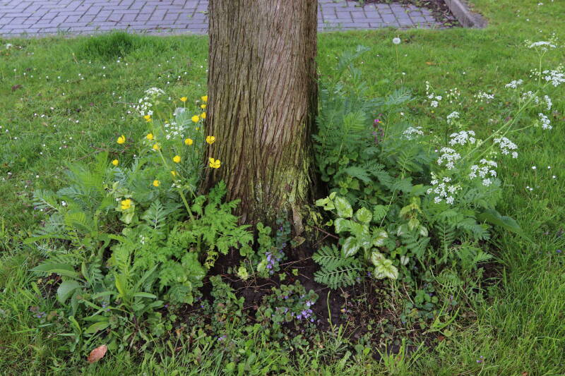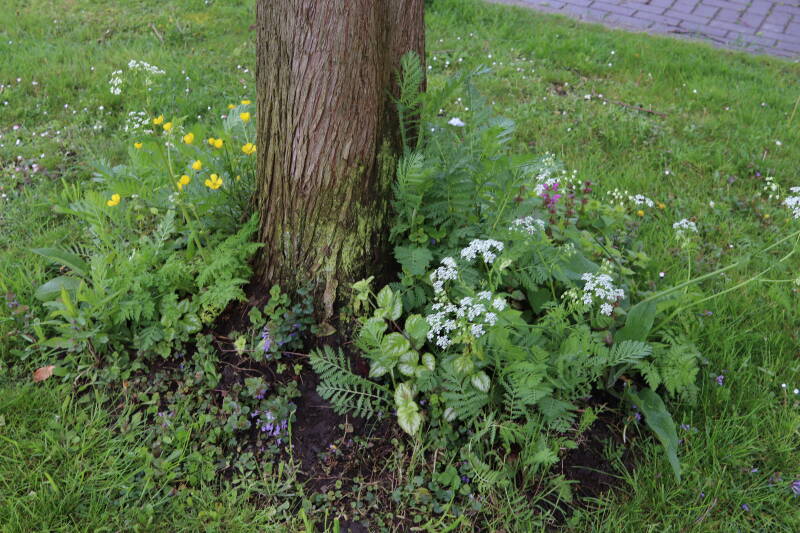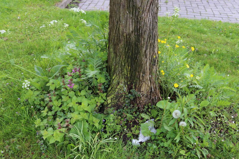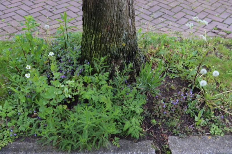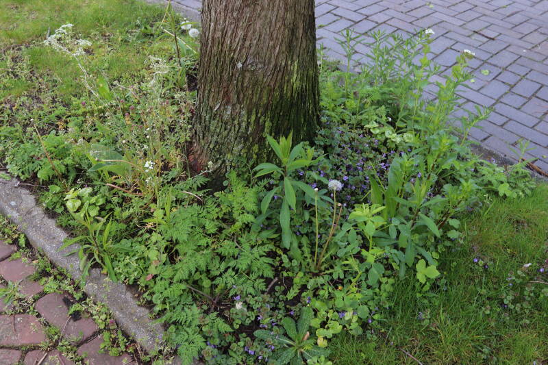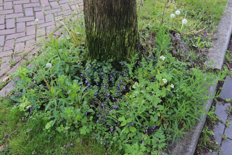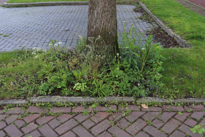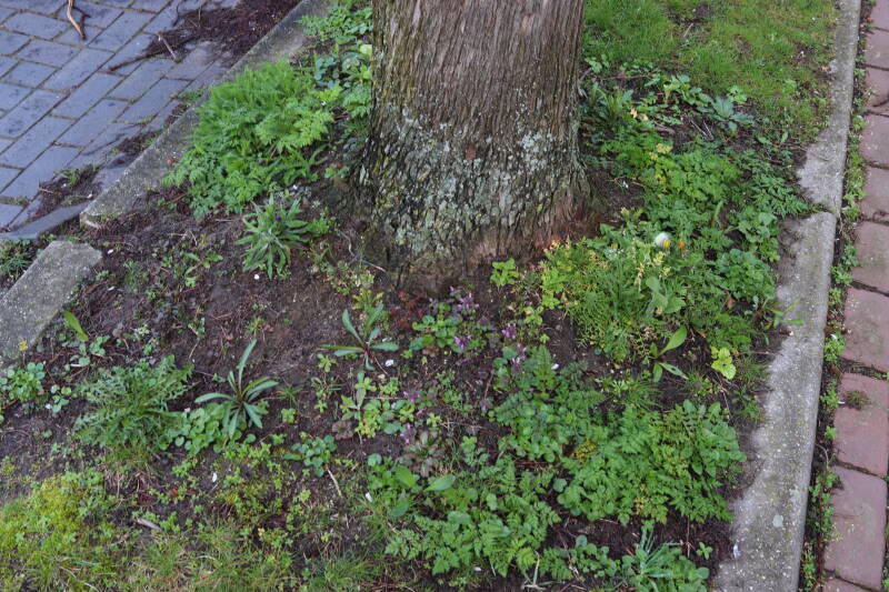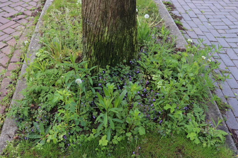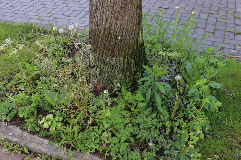 Op 20 april is al goed te zien hoe de planten zich ontwikkelen in de boomspiegels en wat de grasmaaier tot zover ongemoeid heeft gelaten. De regelmatige regenval heeft hier in grote mate aan bijgedragen. Het grondwater moet inmiddels wel op peil zijn geraakt, ondanks dat de bomen dagelijks een grote hoeveelheid water aan de grond onttrekken, en kan bij extreme weersomstandigheden straks als buffer gaan dienen. Wat een leuke bijkomstigheid is dat ik nu nog meer soorten zie die me blijkbaar eerder waren ontgaan.