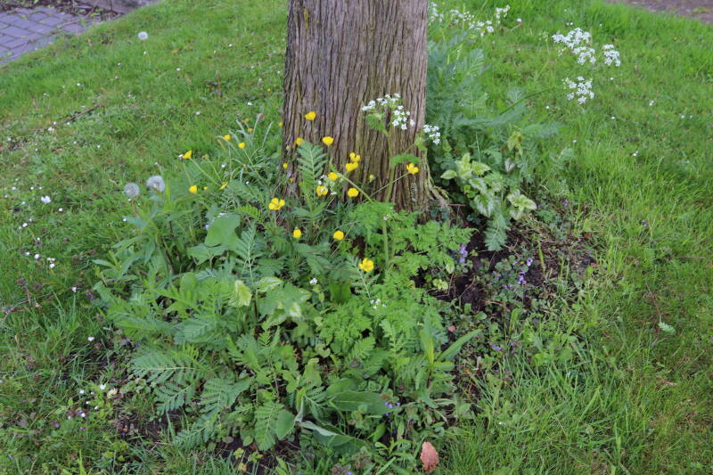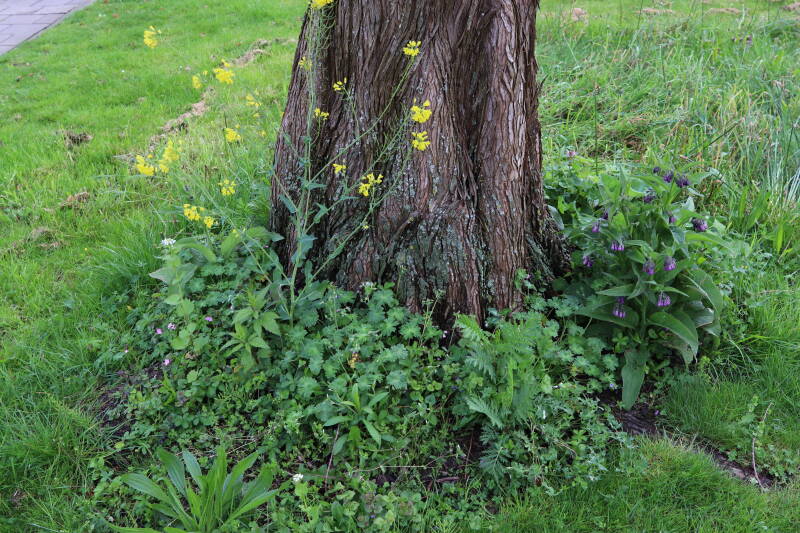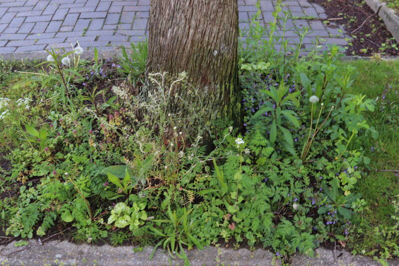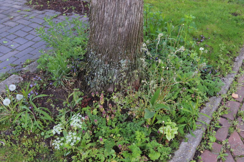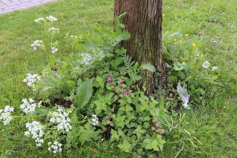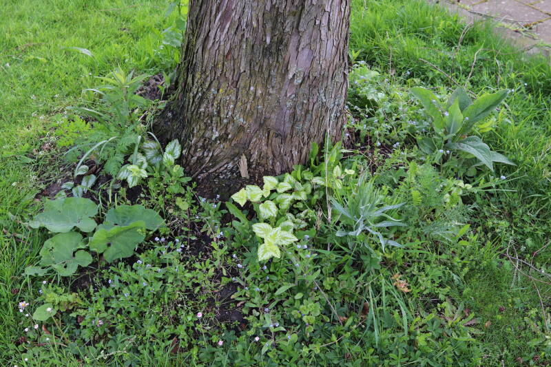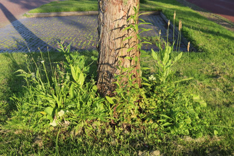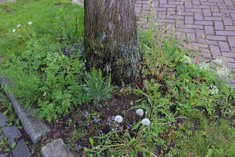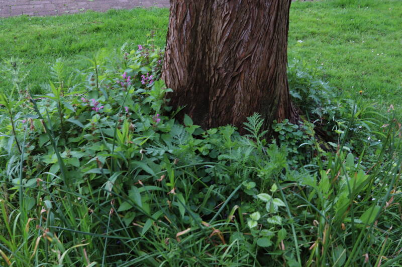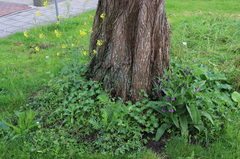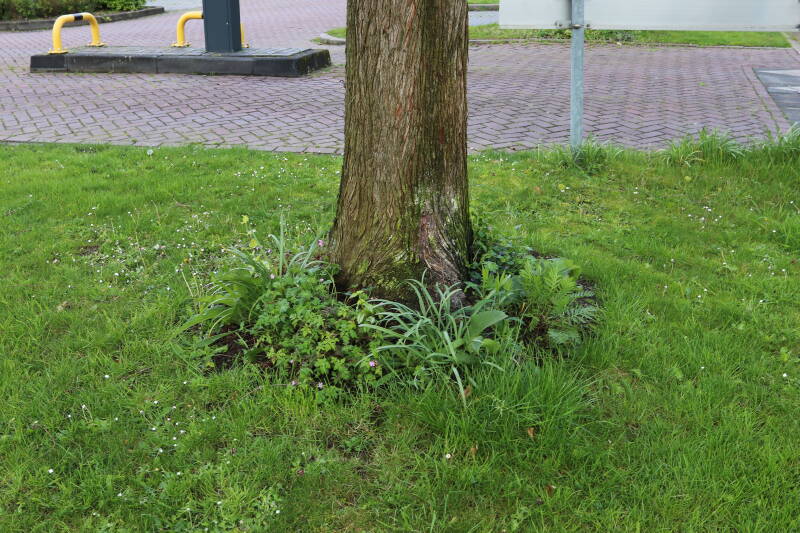 Op 20 april is al goed te zien hoe de planten zich ontwikkelen in de boomspiegels en wat de grasmaaier tot zover ongemoeid heeft gelaten. De regelmatige regenval heeft hier in grote mate aan bijgedragen. Het grondwater moet inmiddels wel op peil zijn geraakt, ondanks dat de bomen dagelijks een grote hoeveelheid water aan de grond onttrekken, en kan bij extreme weersomstandigheden straks als buffer gaan dienen. Wat een leuke bijkomstigheid is dat ik nu nog meer soorten zie die me blijkbaar eerder waren ontgaan.