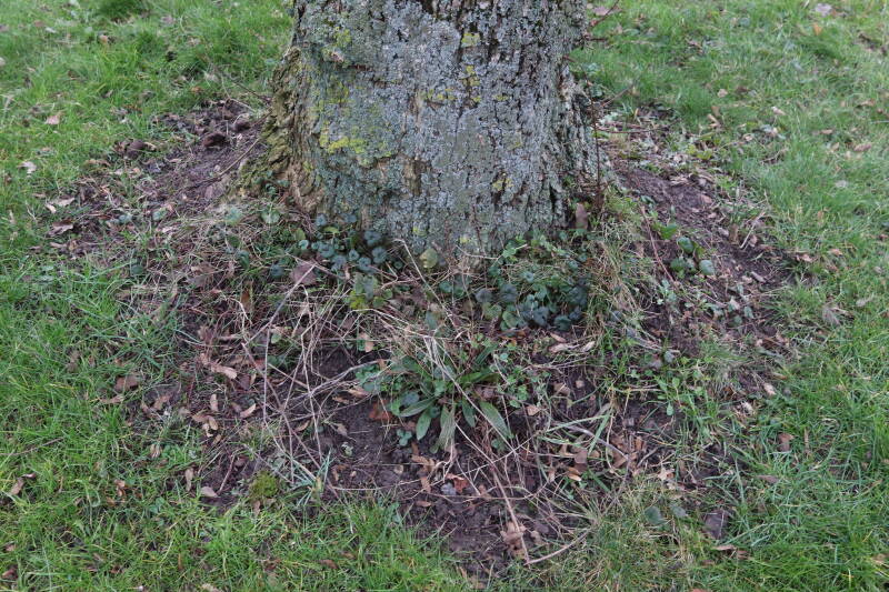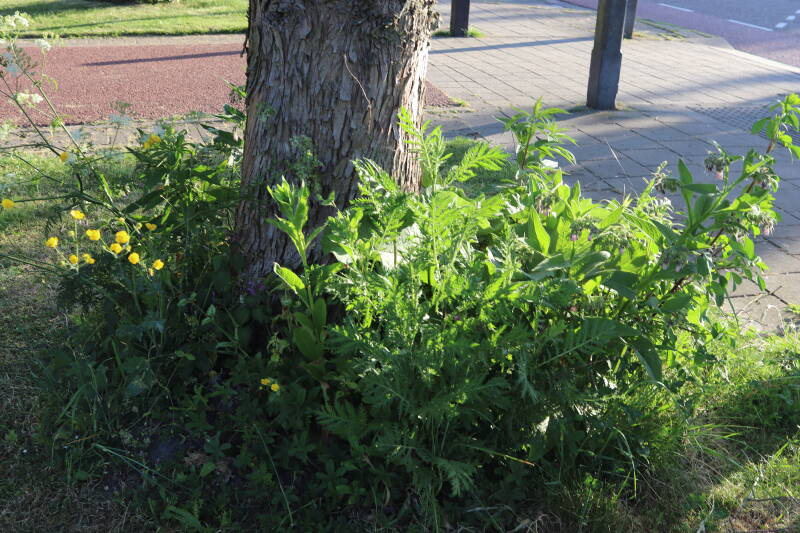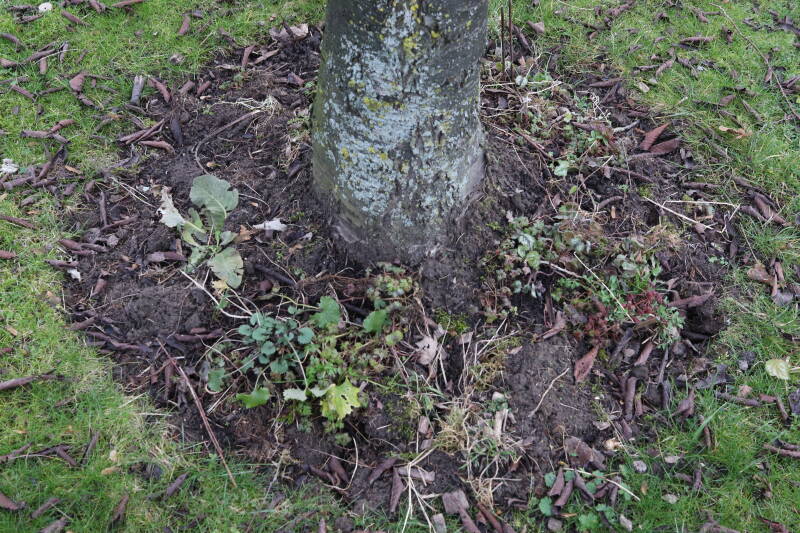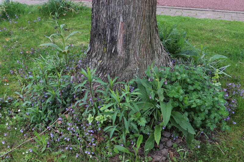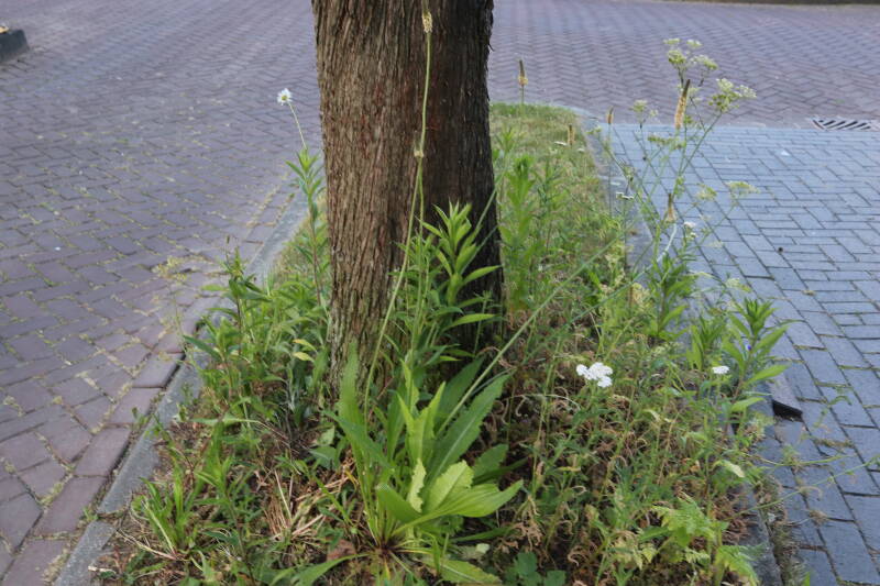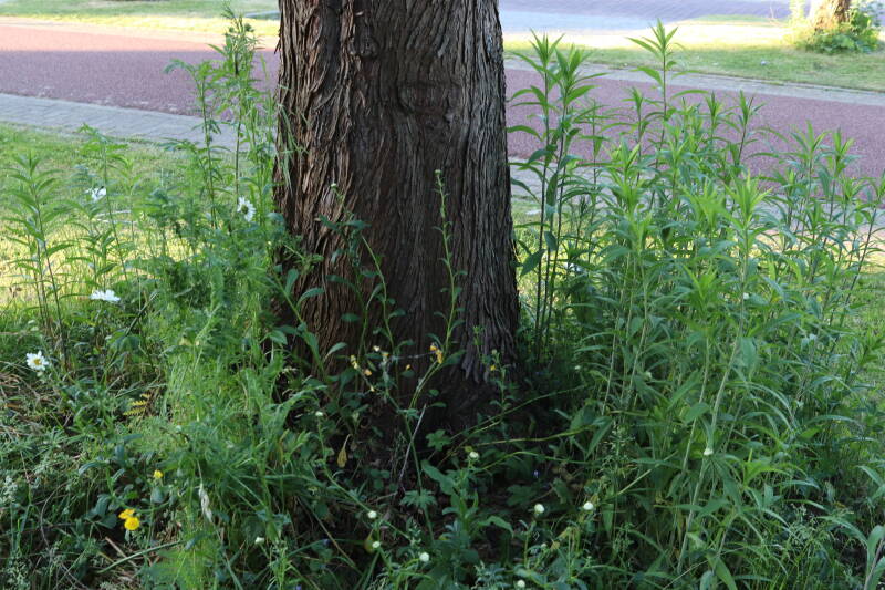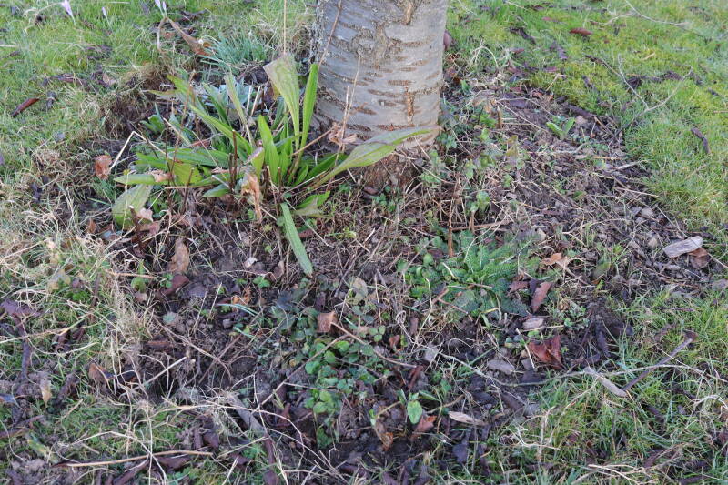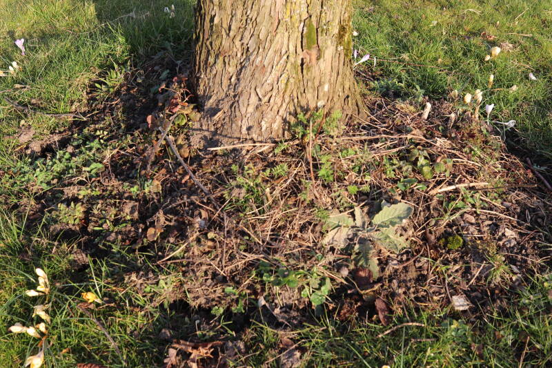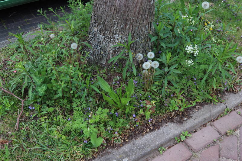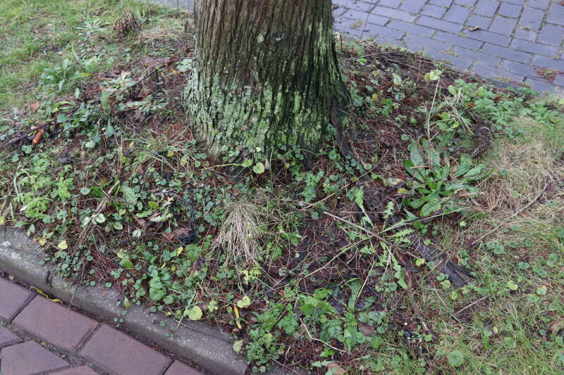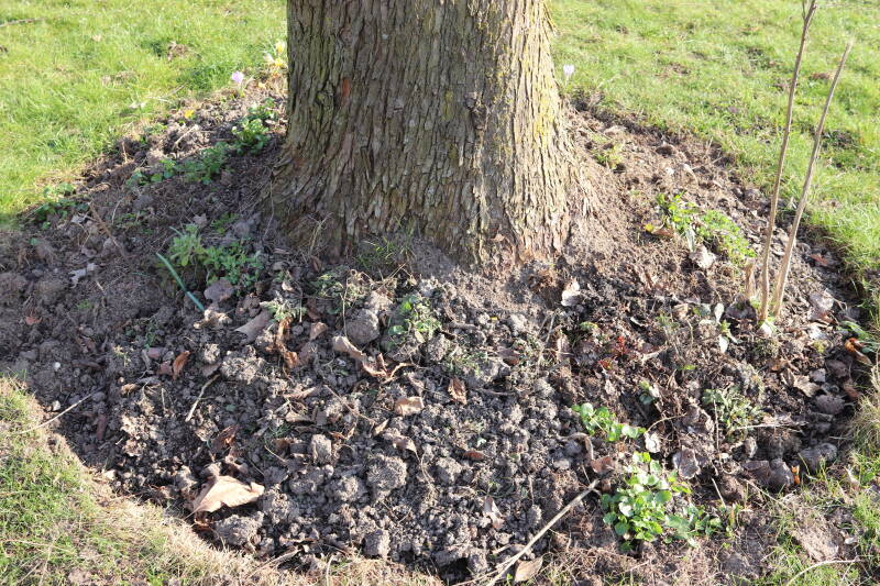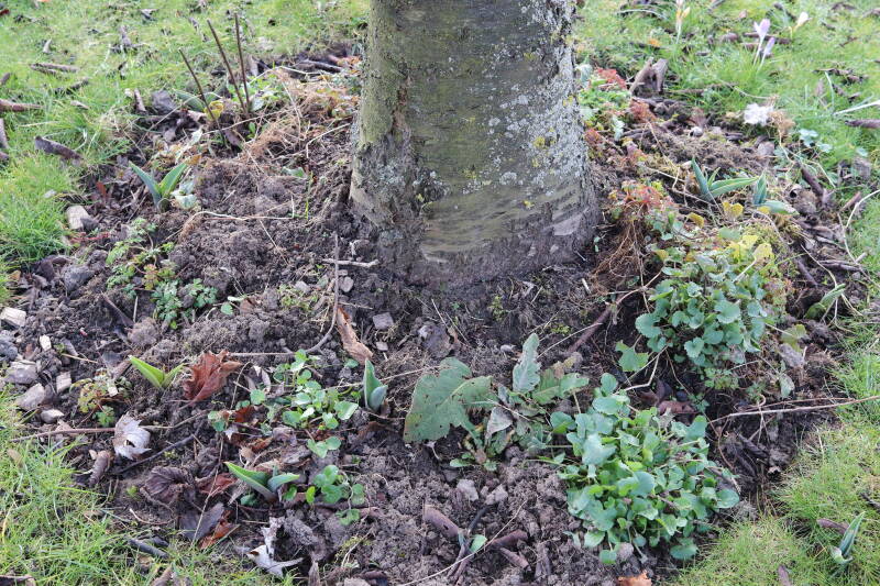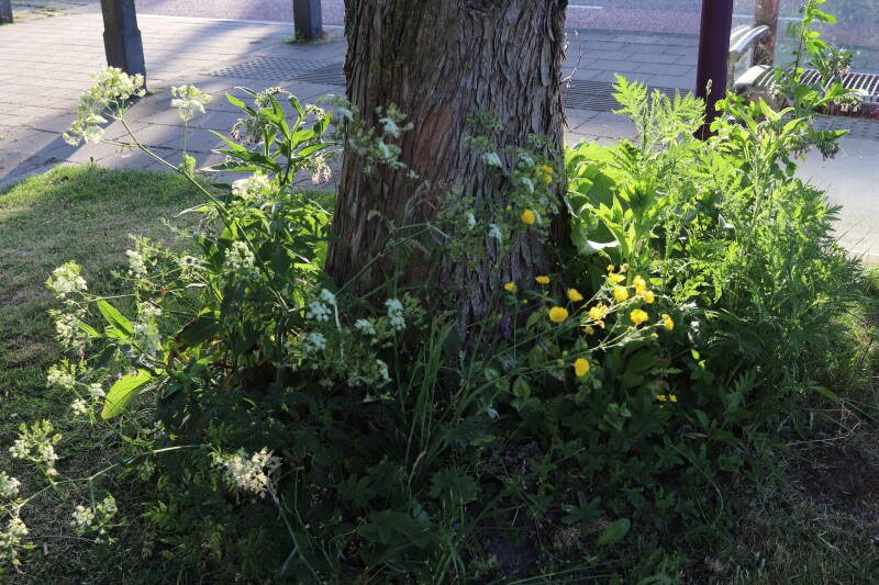 Het eerste onderhoud aan de boomspiegels is gedurende de eerste week van maart gepleegd door de grassen te verwijderen en een enkele brandnetel. In deze maand zijn ook de laatste boomspiegels van gras ontdaan en deels ingeplant. Het moet de komende weken tot maanden verder vorm krijgen en dan is het afwachten wat ervan de moeilijke omstandigheden rondom de boomstam overleeft. Ik ben selectiever geworden in de soorten die ik wil gaan toepassen en de natuur komt dit jaar wat later op gang vanwege de lage temperaturen, waardoor bepaalde soorten zich nog niet hebben laten zien.