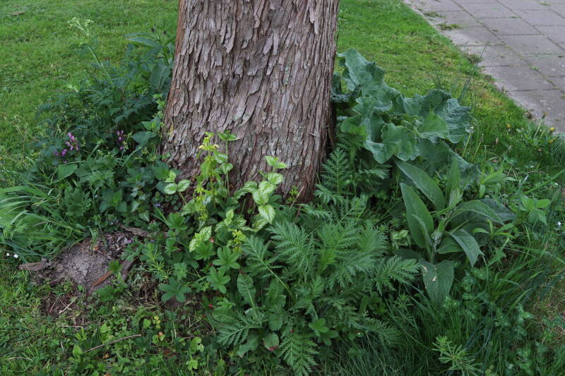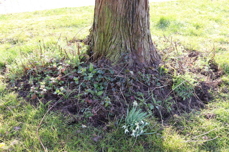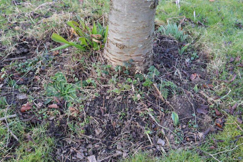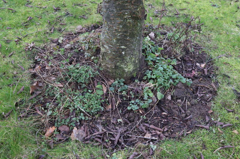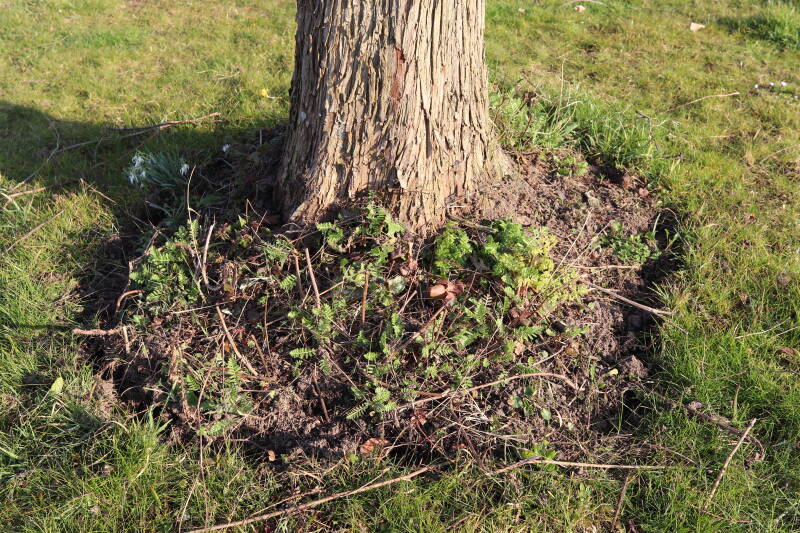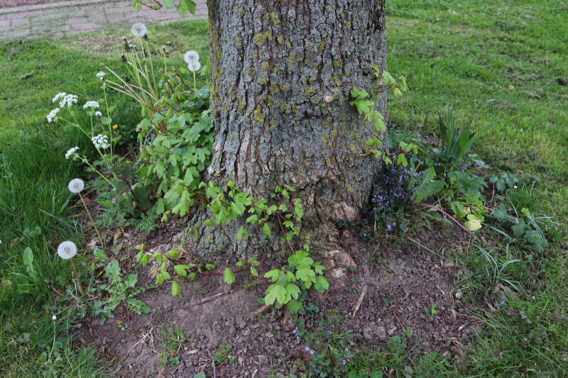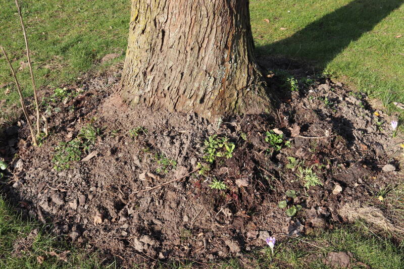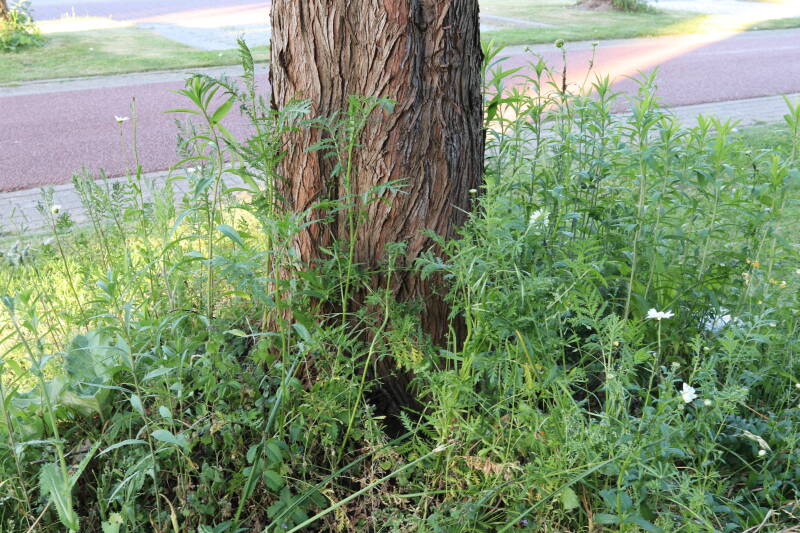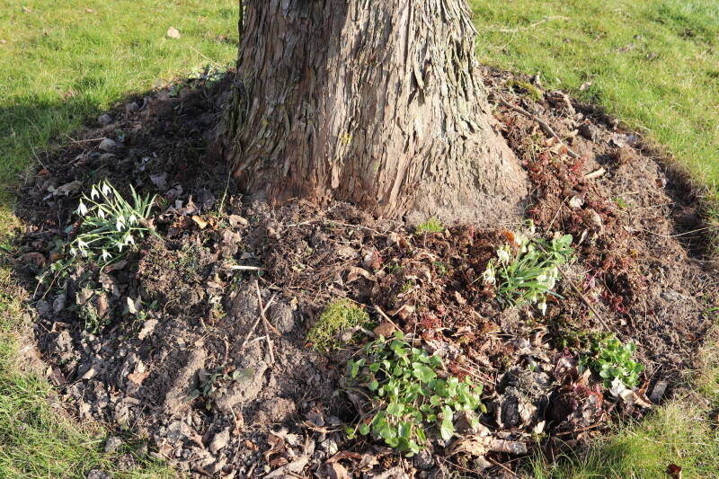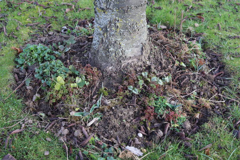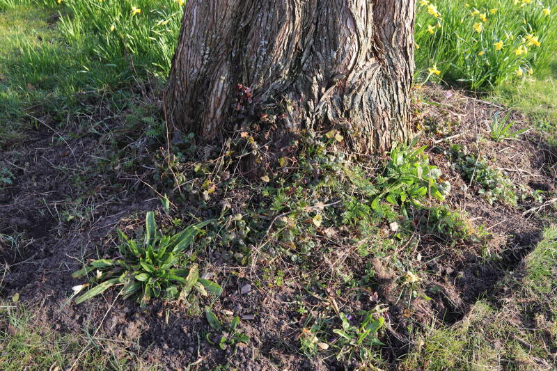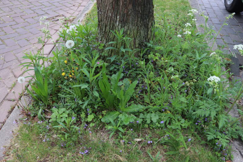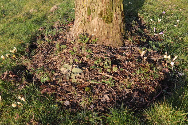 Het eerste onderhoud aan de boomspiegels is gedurende de eerste week van maart gepleegd door de grassen te verwijderen en een enkele brandnetel. In deze maand zijn ook de laatste boomspiegels van gras ontdaan en deels ingeplant. Het moet de komende weken tot maanden verder vorm krijgen en dan is het afwachten wat ervan de moeilijke omstandigheden rondom de boomstam overleeft. Ik ben selectiever geworden in de soorten die ik wil gaan toepassen en de natuur komt dit jaar wat later op gang vanwege de lage temperaturen, waardoor bepaalde soorten zich nog niet hebben laten zien.