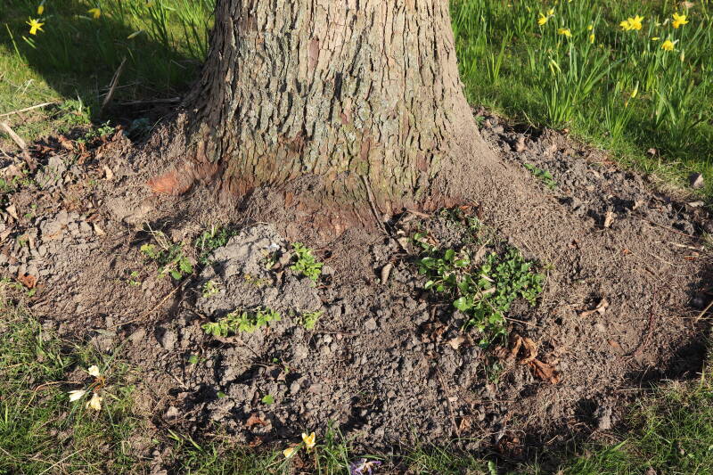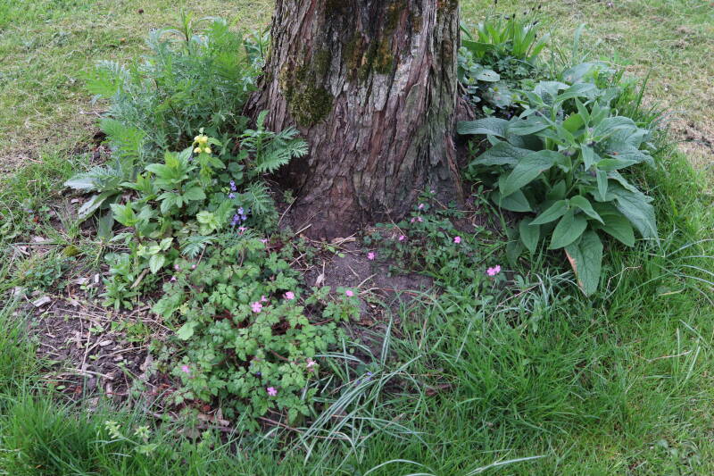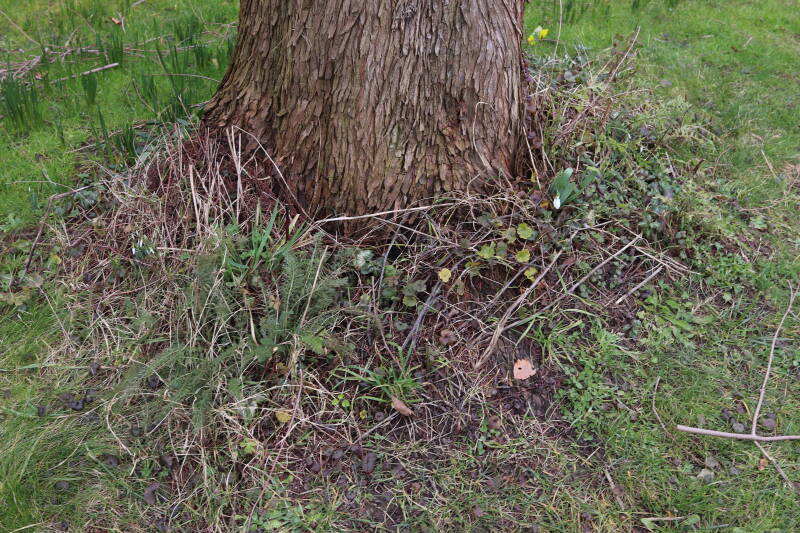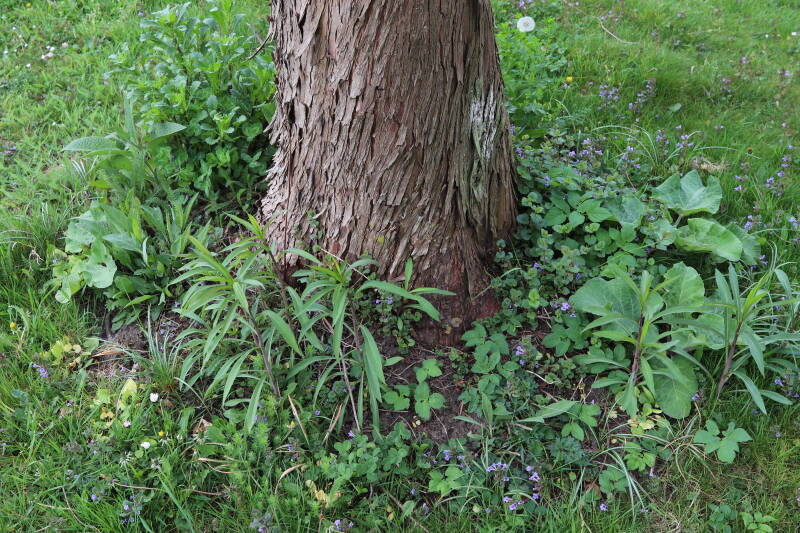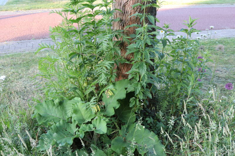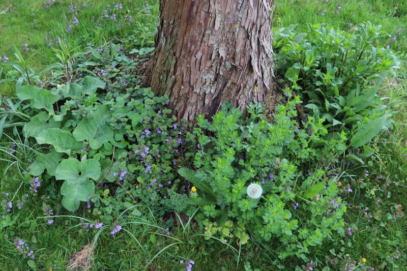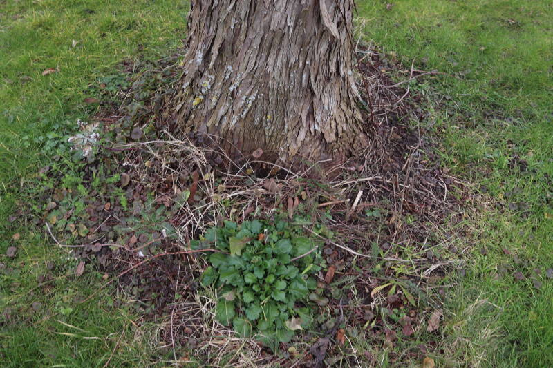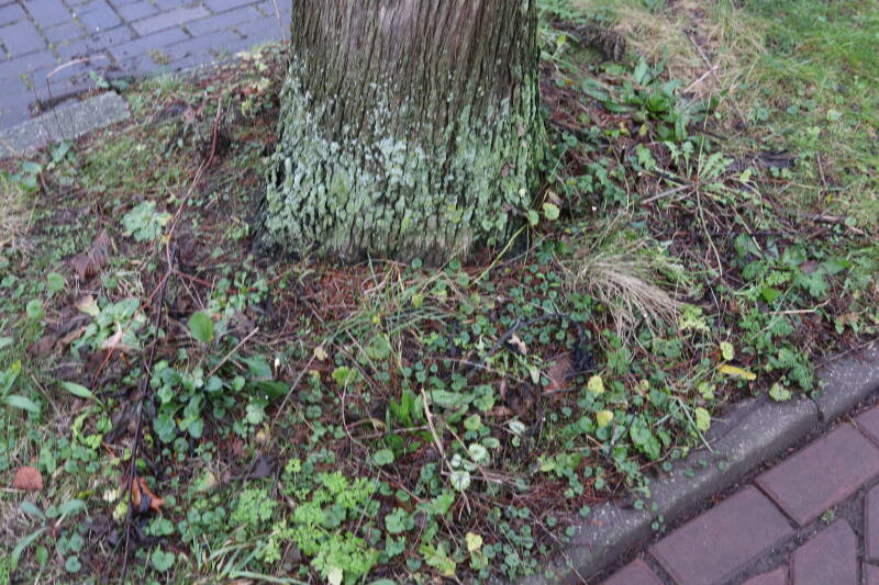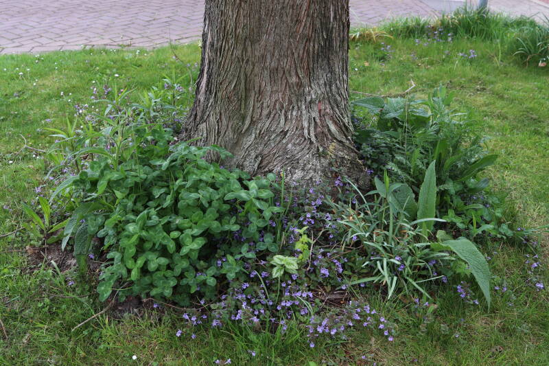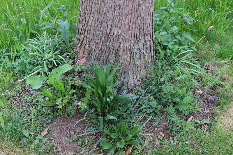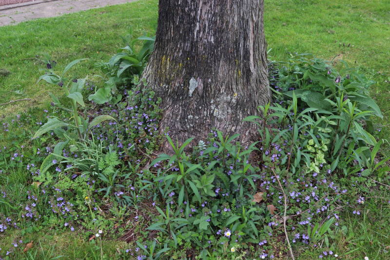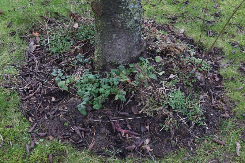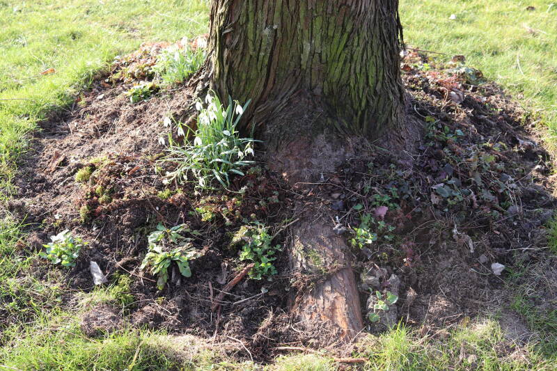 Het eerste onderhoud aan de boomspiegels is gedurende de eerste week van maart gepleegd door de grassen te verwijderen en een enkele brandnetel. In deze maand zijn ook de laatste boomspiegels van gras ontdaan en deels ingeplant. Het moet de komende weken tot maanden verder vorm krijgen en dan is het afwachten wat ervan de moeilijke omstandigheden rondom de boomstam overleeft. Ik ben selectiever geworden in de soorten die ik wil gaan toepassen en de natuur komt dit jaar wat later op gang vanwege de lage temperaturen, waardoor bepaalde soorten zich nog niet hebben laten zien.