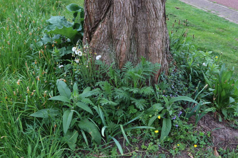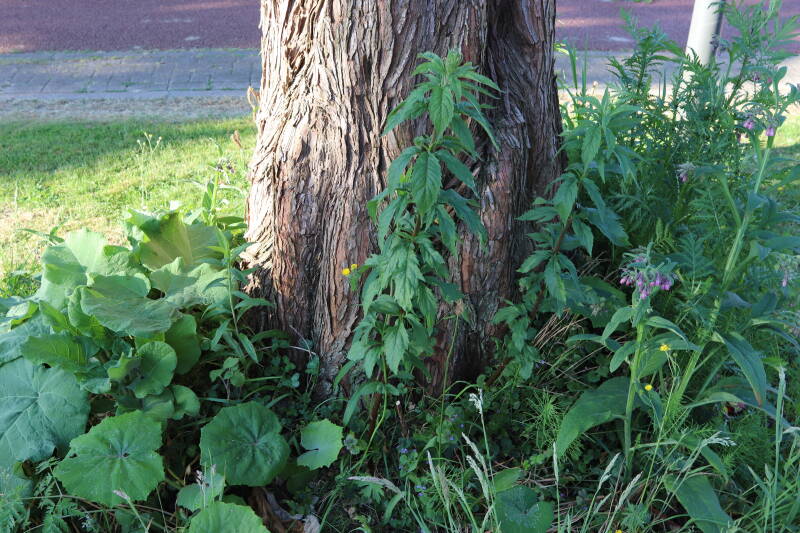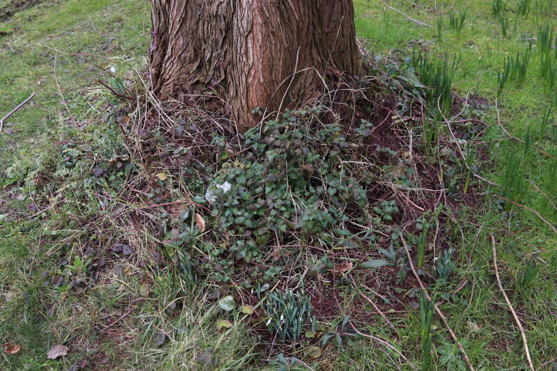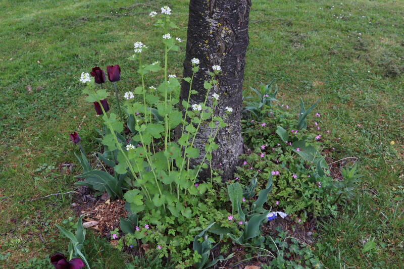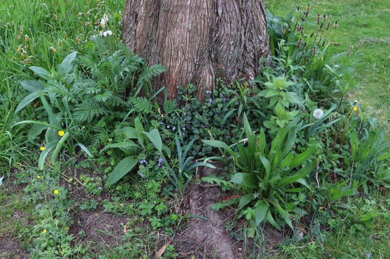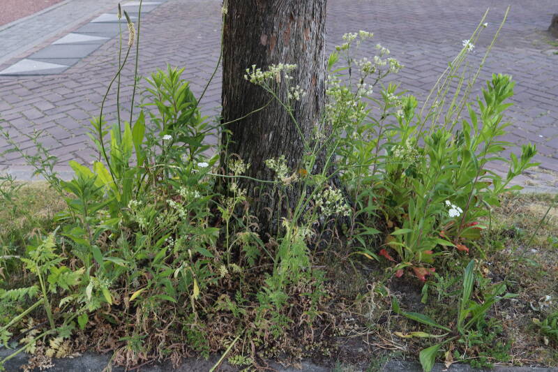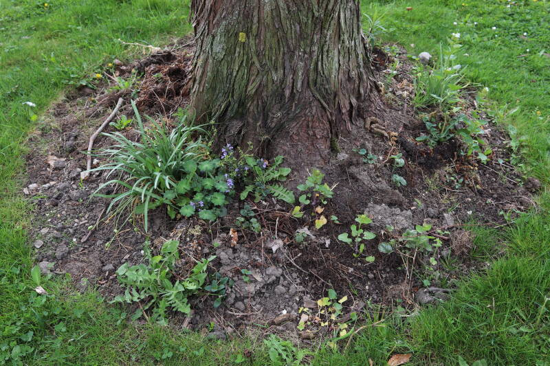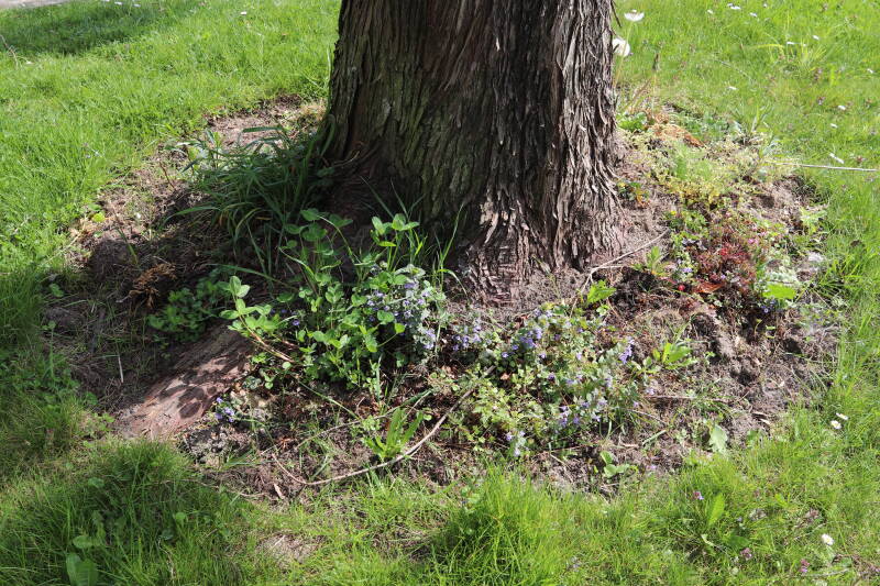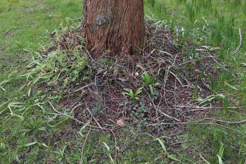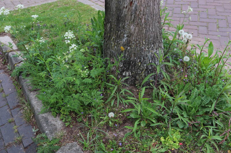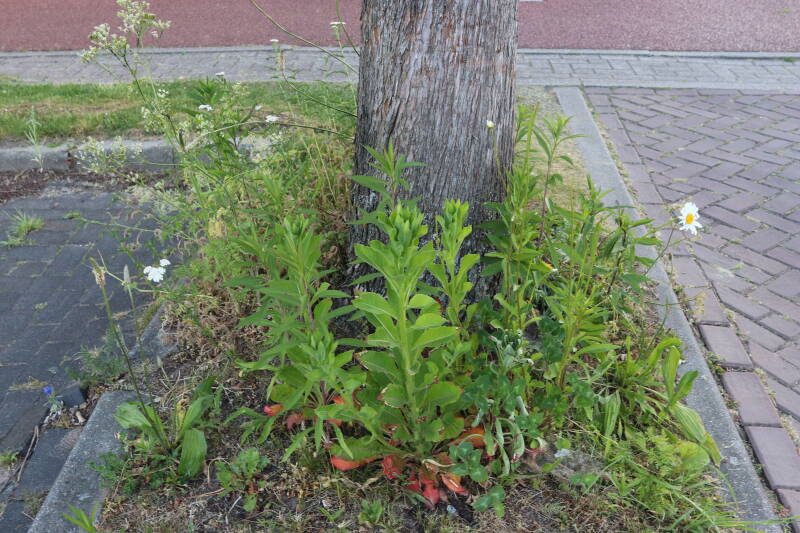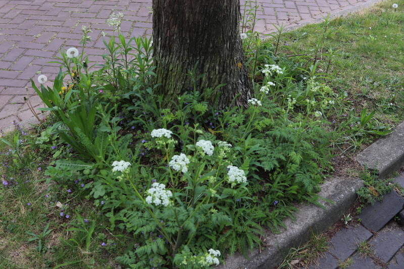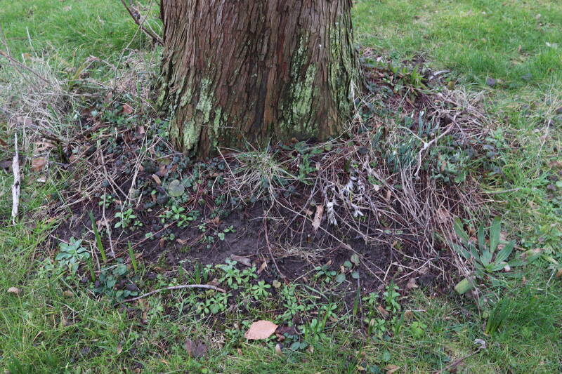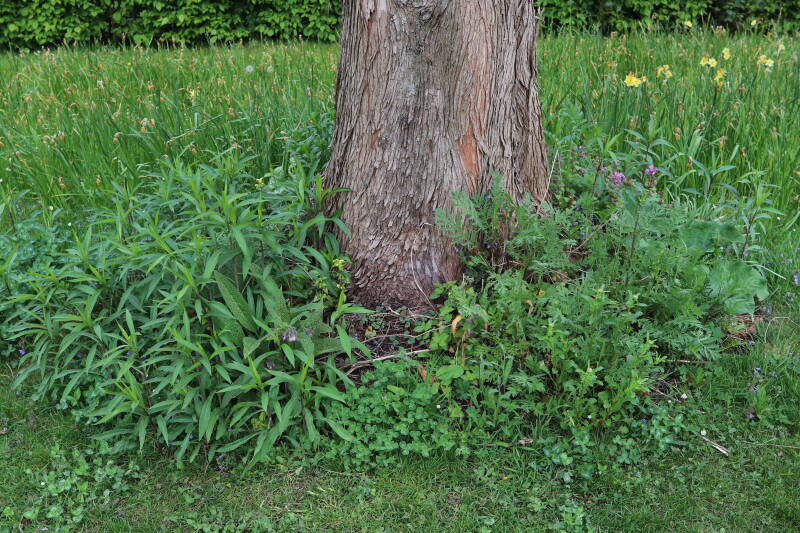 Het eerste onderhoud aan de boomspiegels is gedurende de eerste week van maart gepleegd door de grassen te verwijderen en een enkele brandnetel. In deze maand zijn ook de laatste boomspiegels van gras ontdaan en deels ingeplant. Het moet de komende weken tot maanden verder vorm krijgen en dan is het afwachten wat ervan de moeilijke omstandigheden rondom de boomstam overleeft. Ik ben selectiever geworden in de soorten die ik wil gaan toepassen en de natuur komt dit jaar wat later op gang vanwege de lage temperaturen, waardoor bepaalde soorten zich nog niet hebben laten zien.
