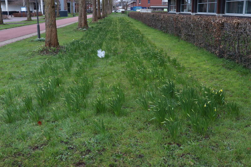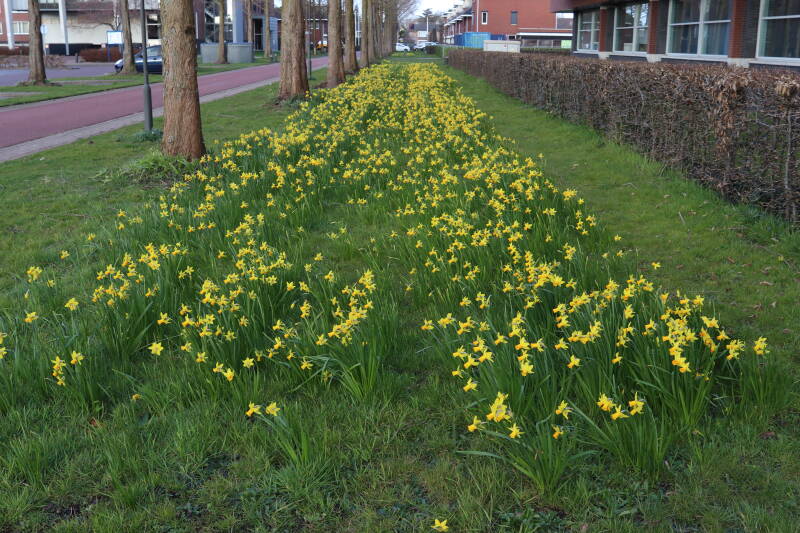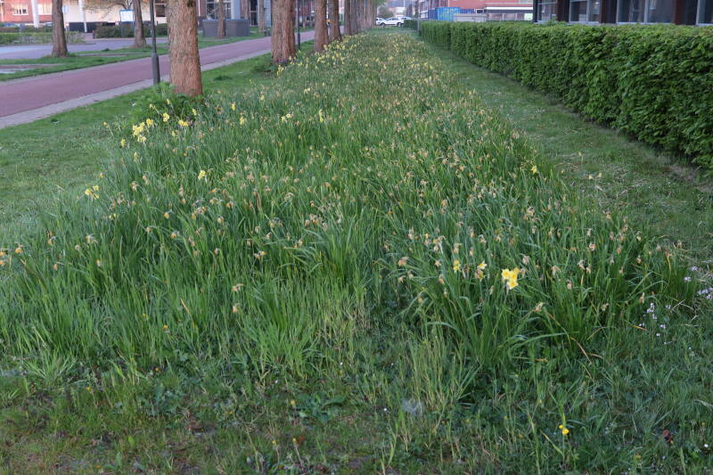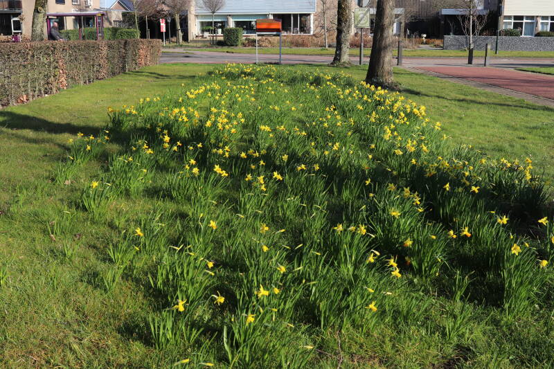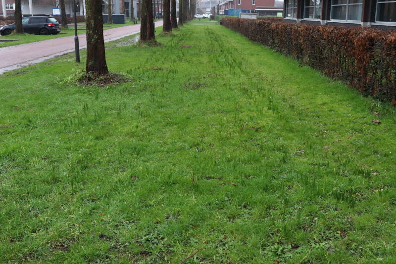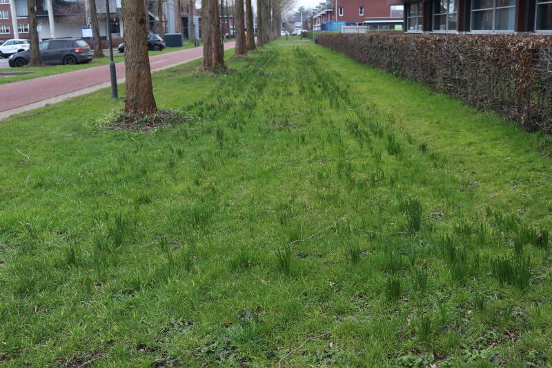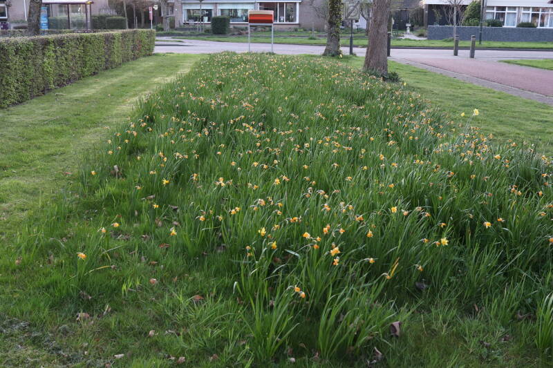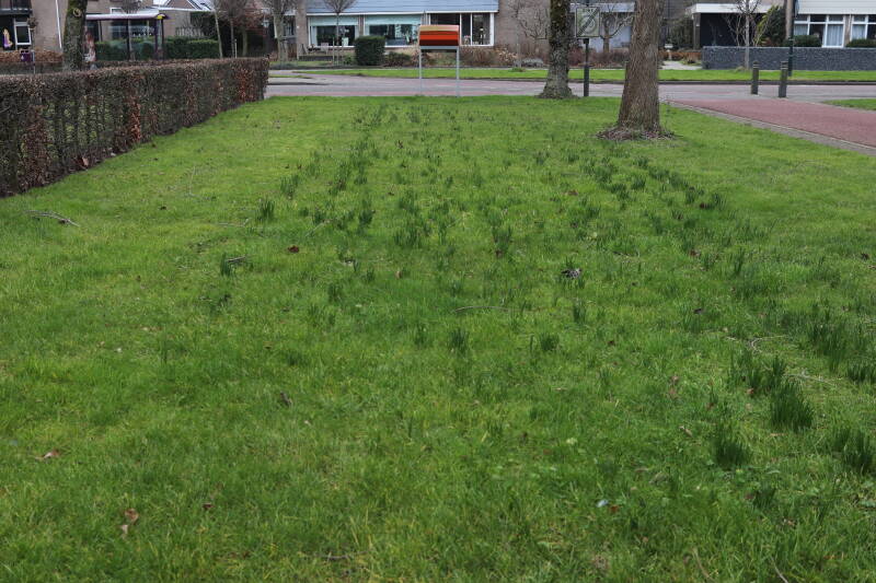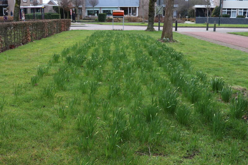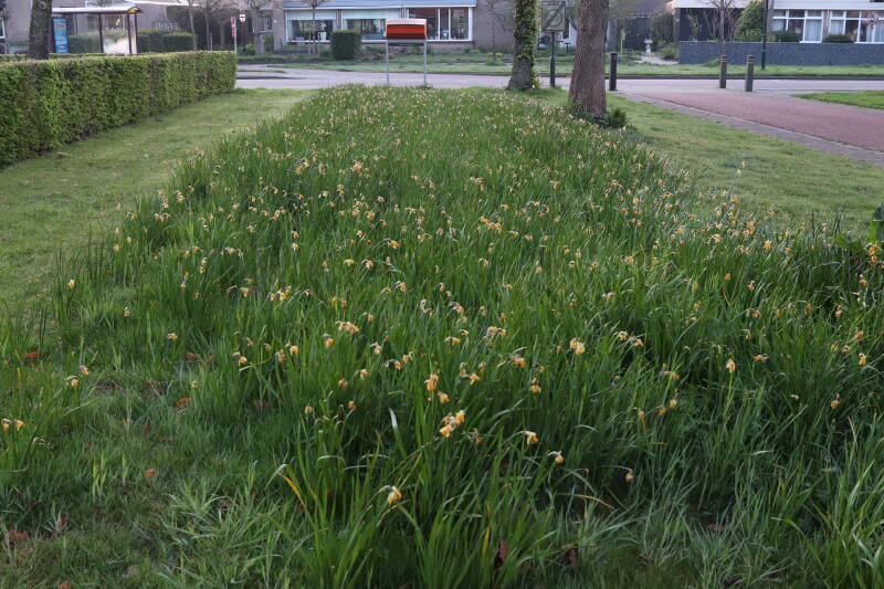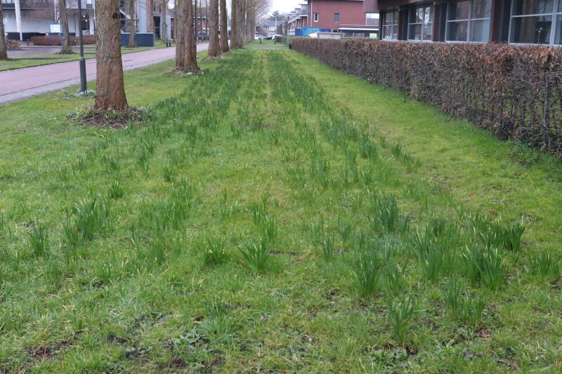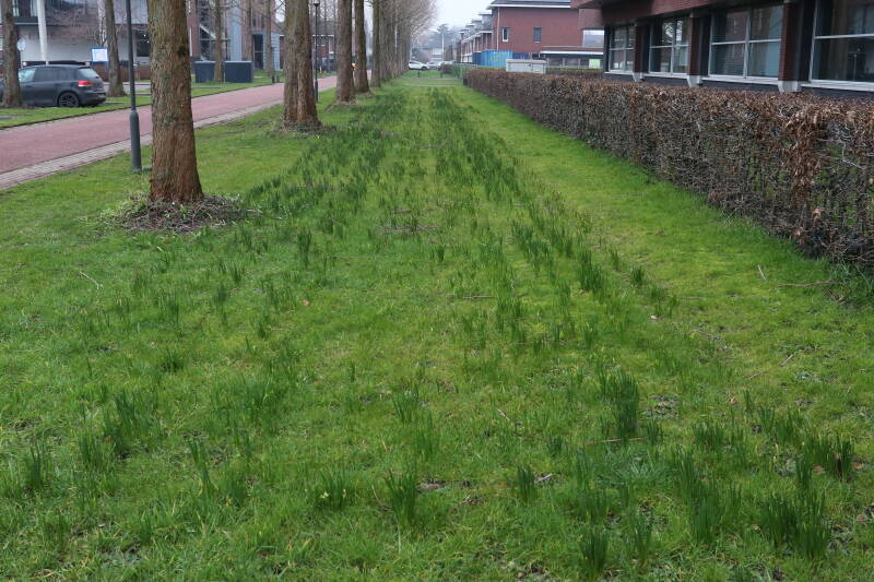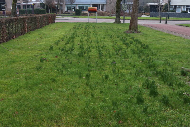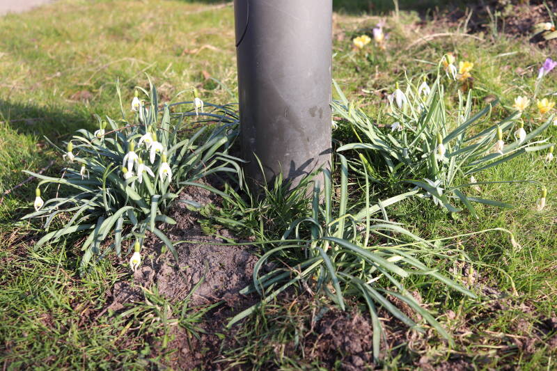 Rondom diverse bomen, bij lantaarnpalen, verkeersborden en een schrikhek is een enkele soort bollen aangeplant. Veel vroegbloeiende bollen rondom de obstakels moeten al afgestorven zijn tegen de tijd dat er periodiek zal worden gebosmaaid, om deze bollen de kans te geven zich hier te handhaven. Het beperkt de soorten die ik hier kan toepassen, maar in de toekomst wel wens uit te breiden. Ik hoop dat de bollen rondom de boomspiegels langer ongemoeid worden gelaten en de mogelijkheid krijgen voldoende reserves op te bouwen om ook de komende jaren te kunnen schitteren.