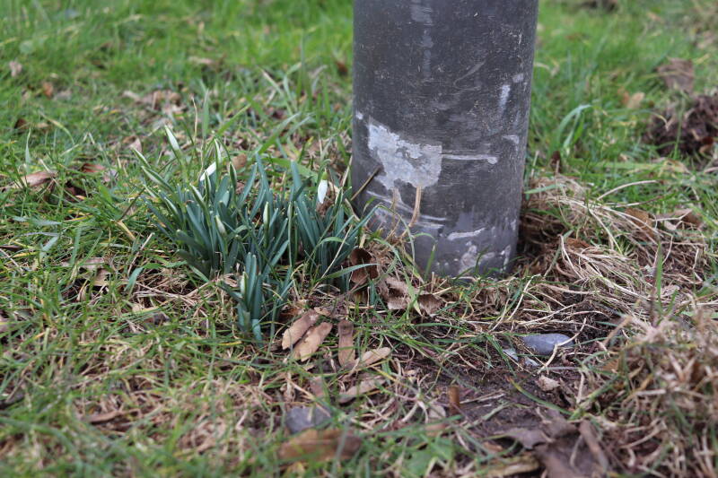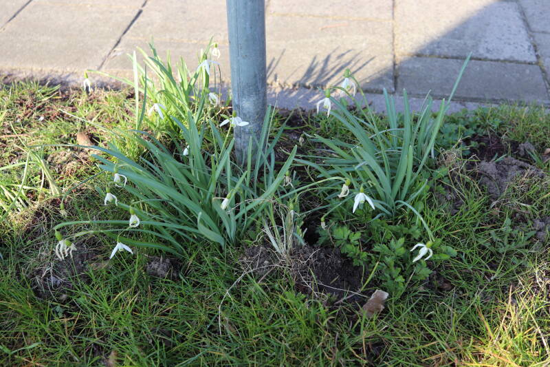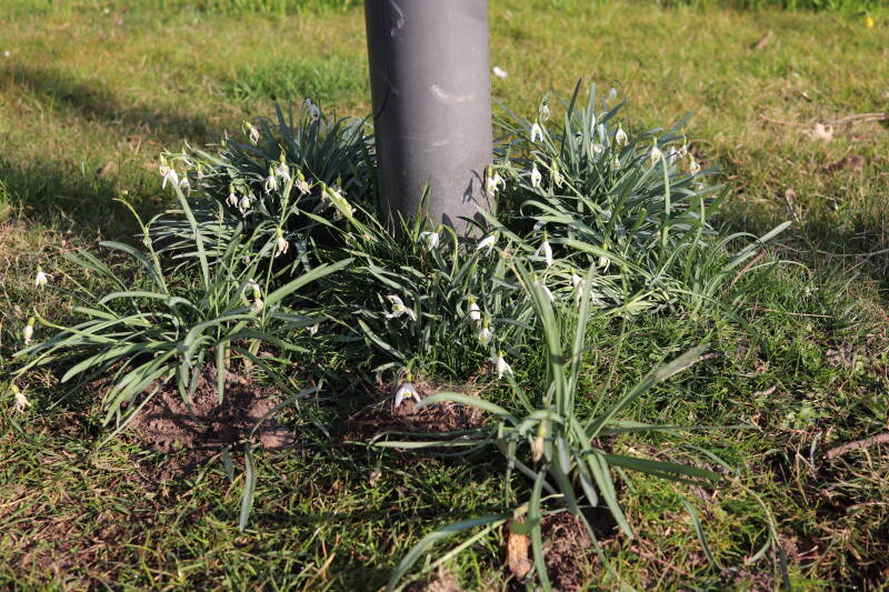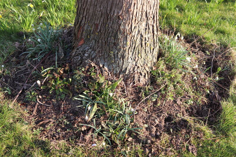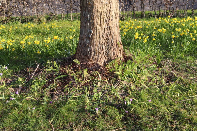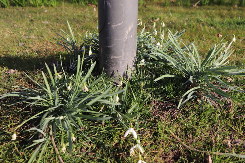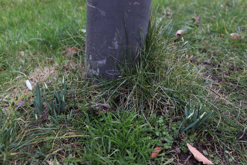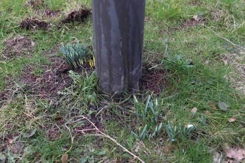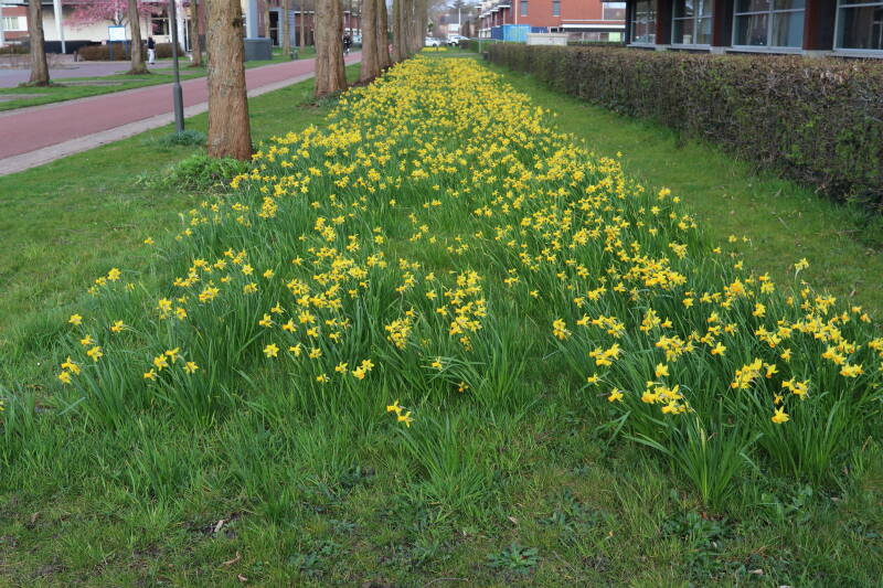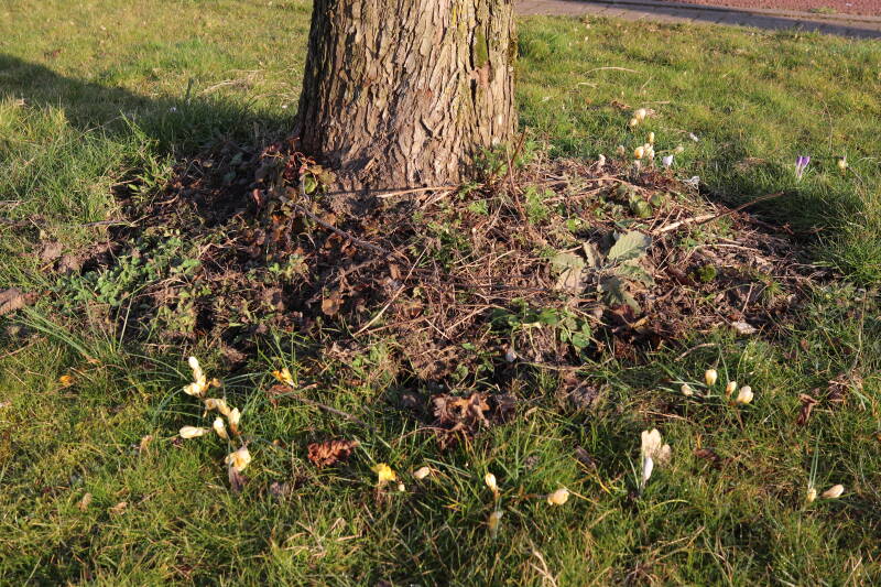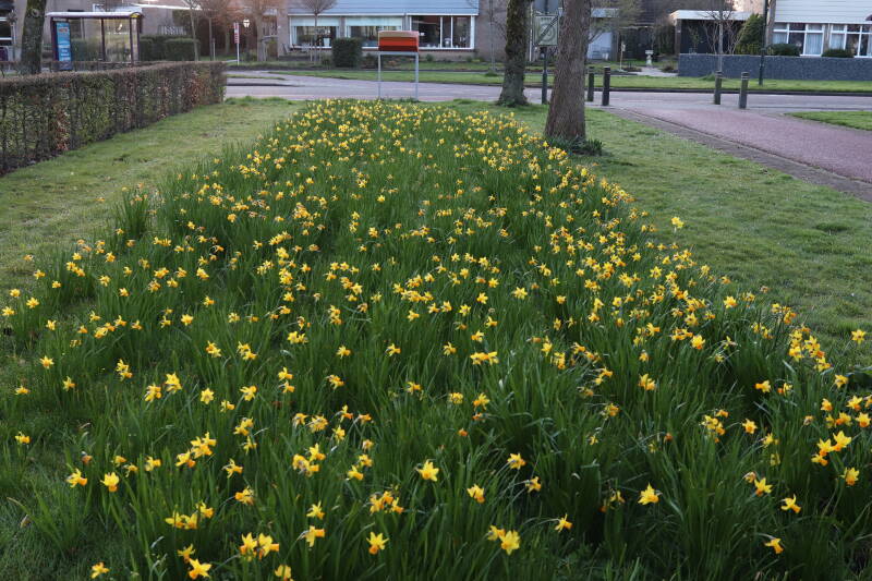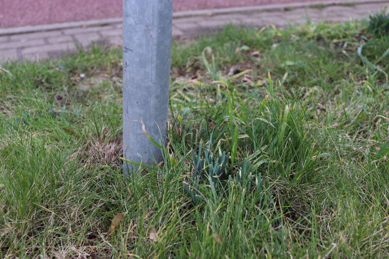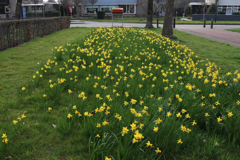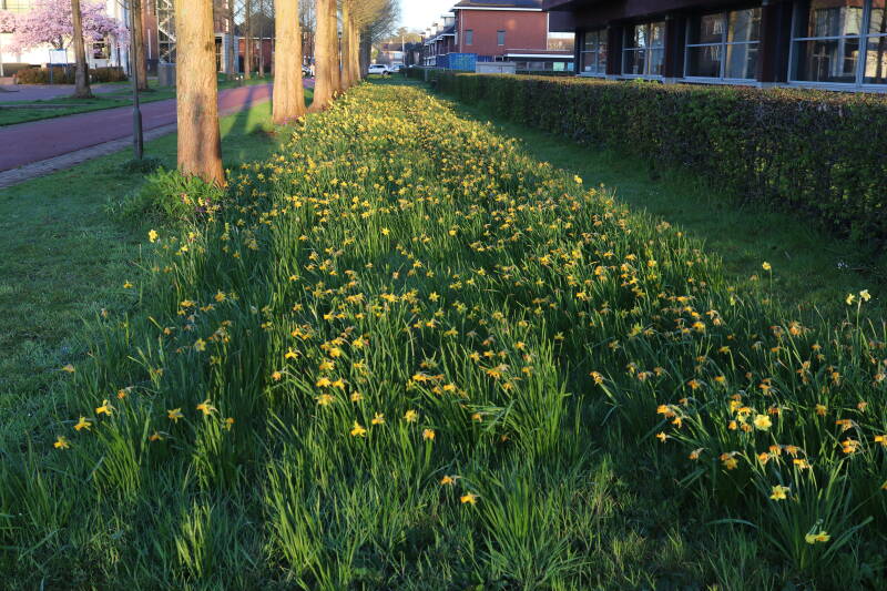 Rondom diverse bomen, bij lantaarnpalen, verkeersborden en een schrikhek is een enkele soort bollen aangeplant. Veel vroegbloeiende bollen rondom de obstakels moeten al afgestorven zijn tegen de tijd dat er periodiek zal worden gebosmaaid, om deze bollen de kans te geven zich hier te handhaven. Het beperkt de soorten die ik hier kan toepassen, maar in de toekomst wel wens uit te breiden. Ik hoop dat de bollen rondom de boomspiegels langer ongemoeid worden gelaten en de mogelijkheid krijgen voldoende reserves op te bouwen om ook de komende jaren te kunnen schitteren.