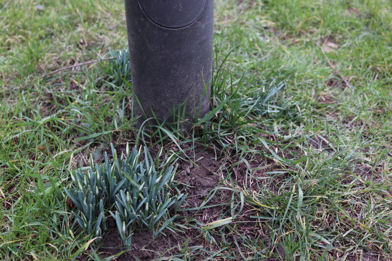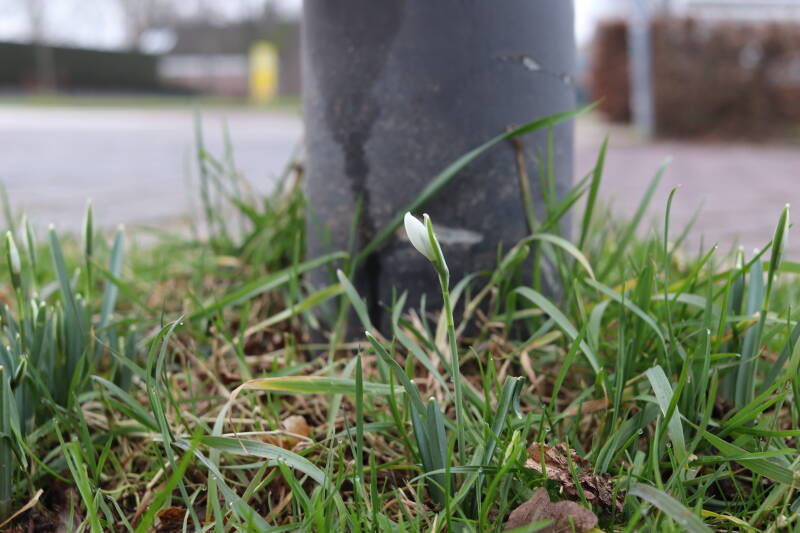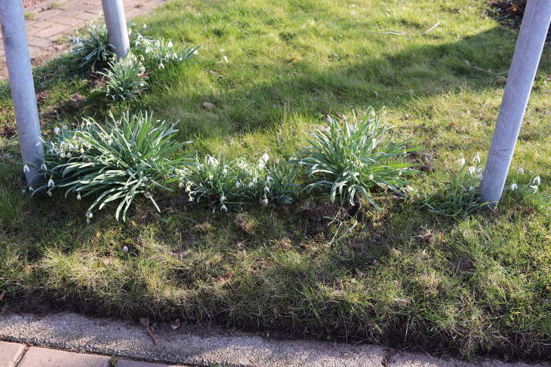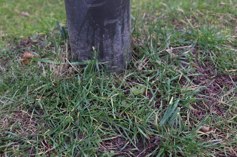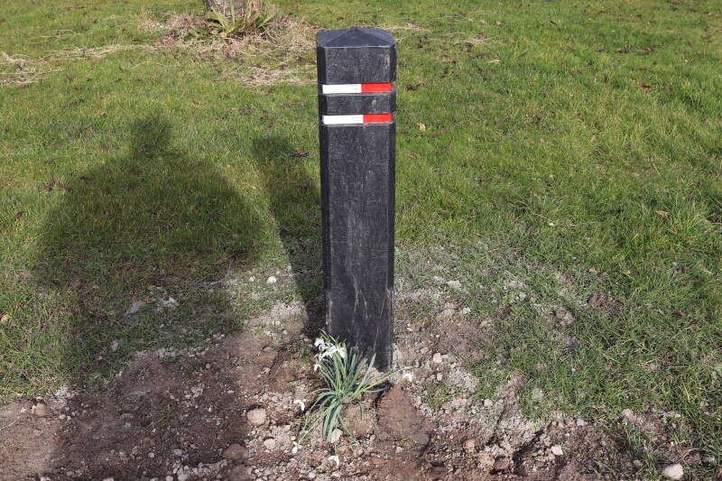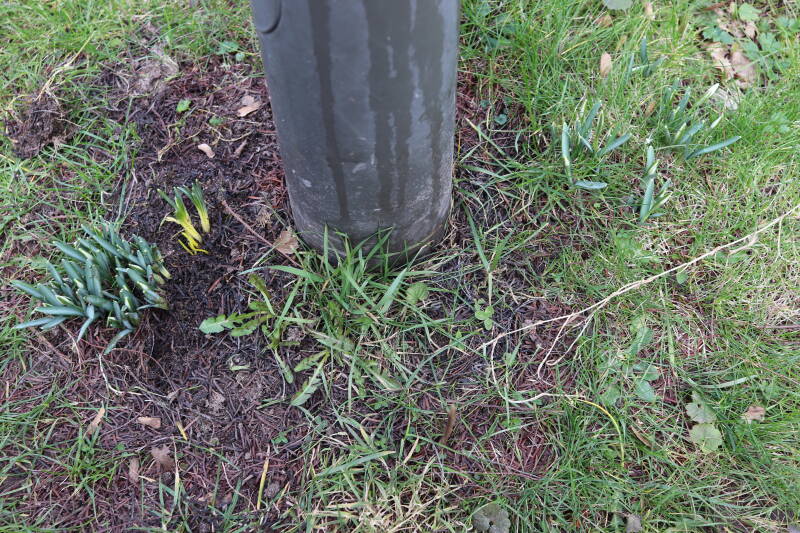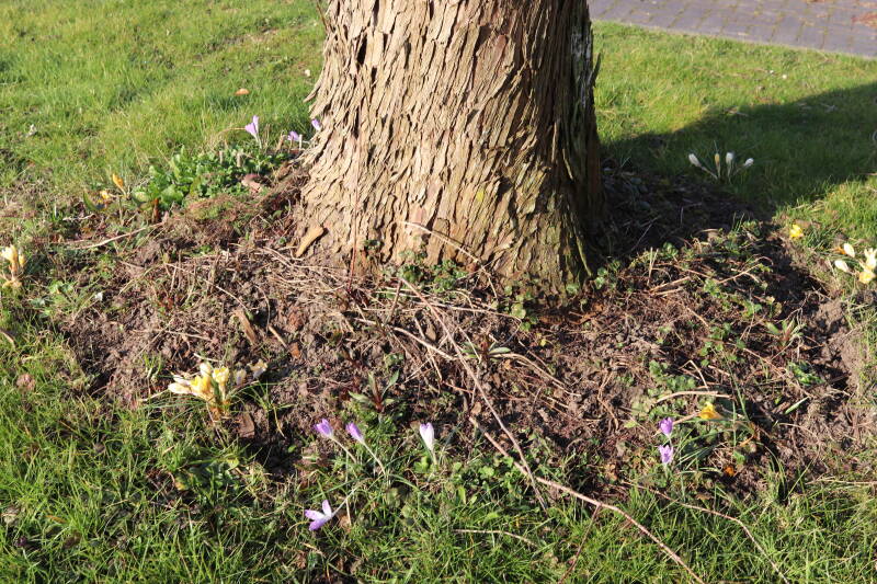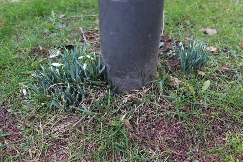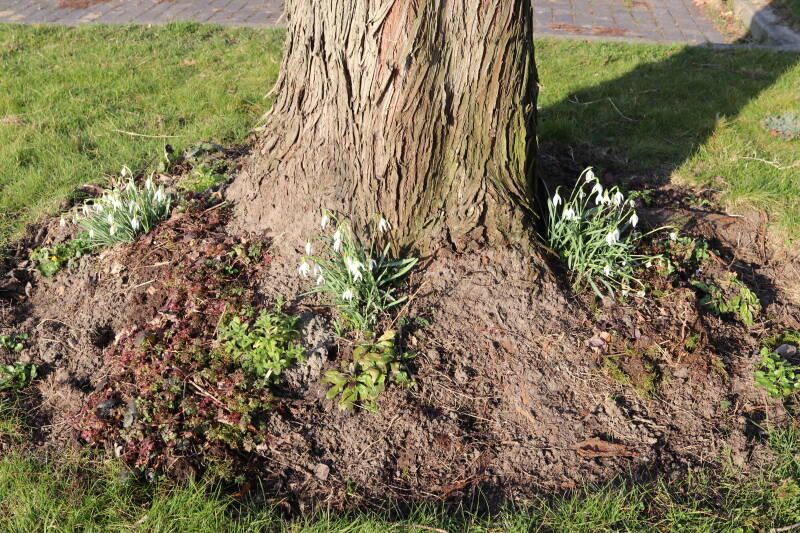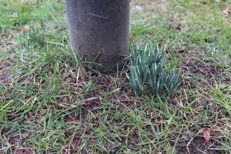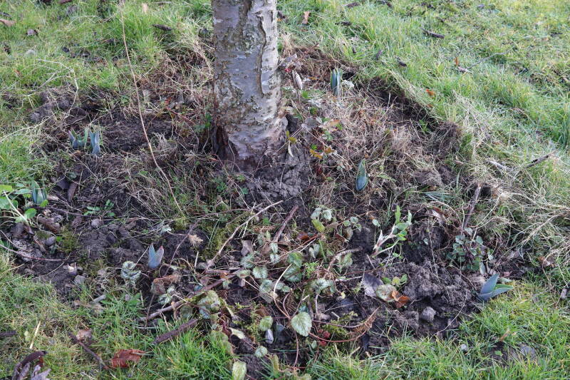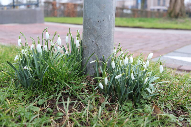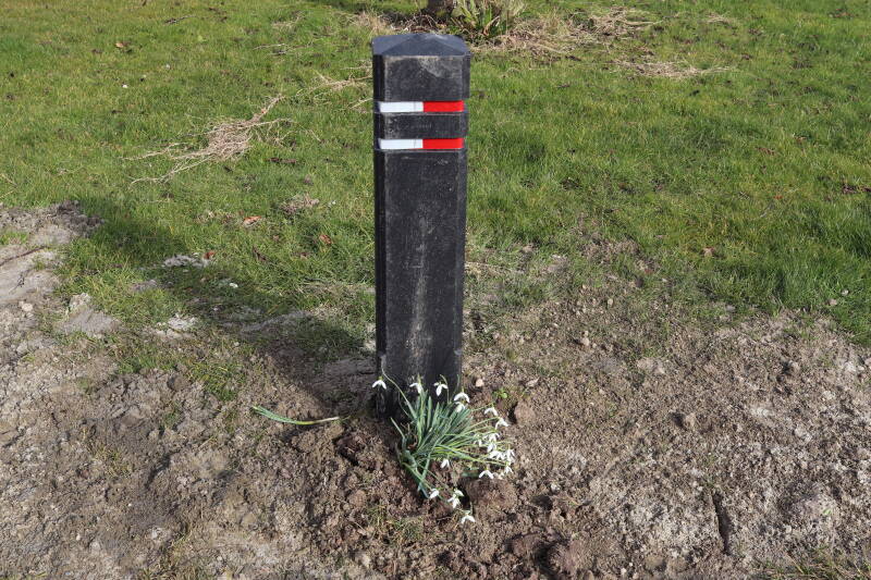 Rondom diverse bomen, bij lantaarnpalen, verkeersborden en een schrikhek is een enkele soort bollen aangeplant. Veel vroegbloeiende bollen rondom de obstakels moeten al afgestorven zijn tegen de tijd dat er periodiek zal worden gebosmaaid, om deze bollen de kans te geven zich hier te handhaven. Het beperkt de soorten die ik hier kan toepassen, maar in de toekomst wel wens uit te breiden. Ik hoop dat de bollen rondom de boomspiegels langer ongemoeid worden gelaten en de mogelijkheid krijgen voldoende reserves op te bouwen om ook de komende jaren te kunnen schitteren.