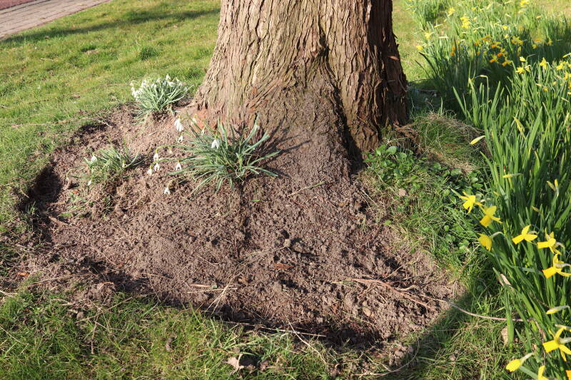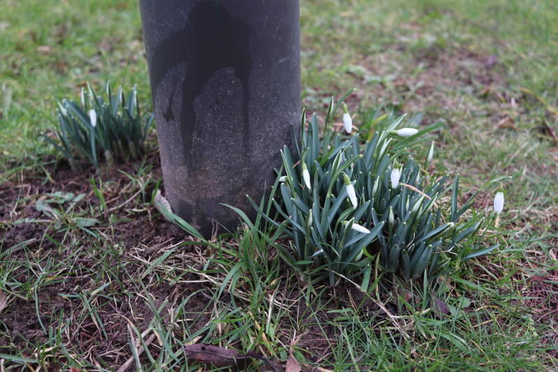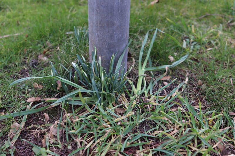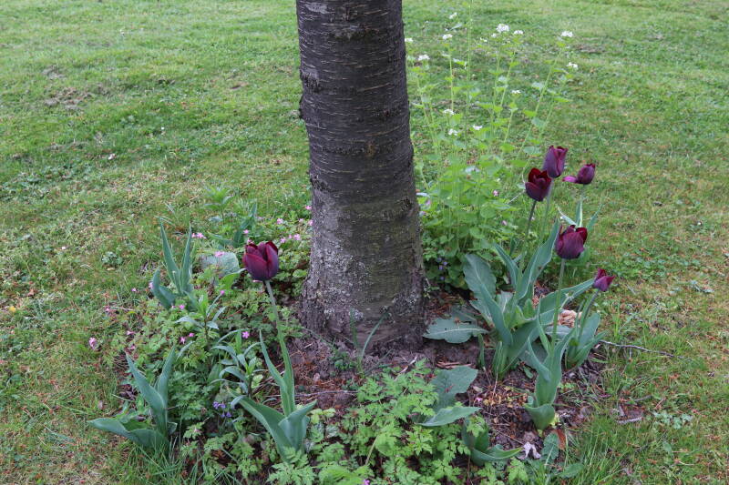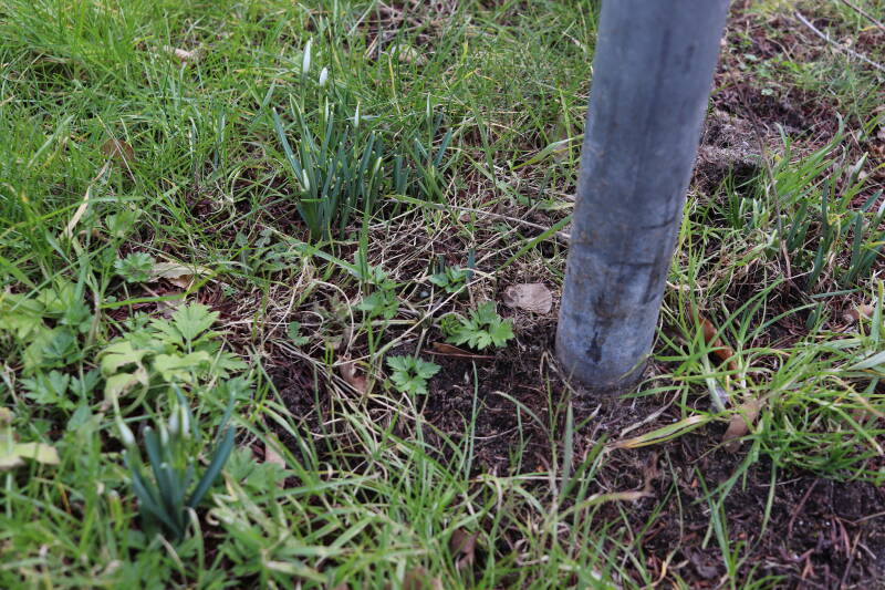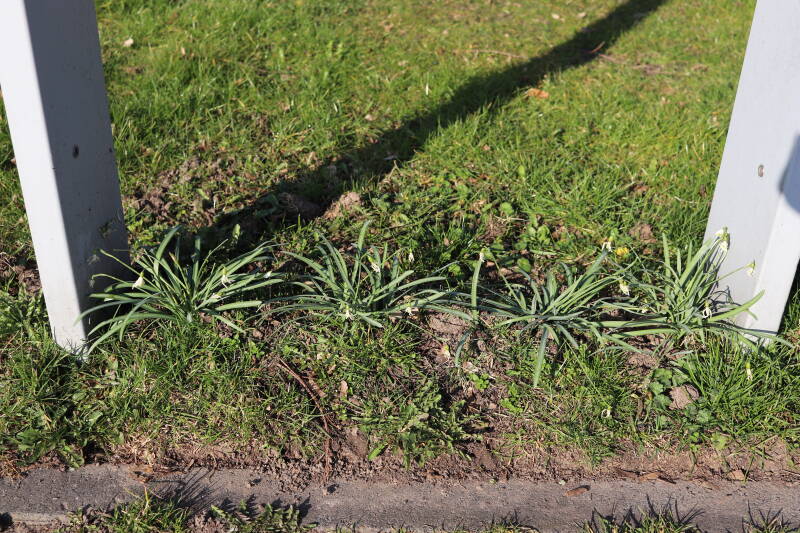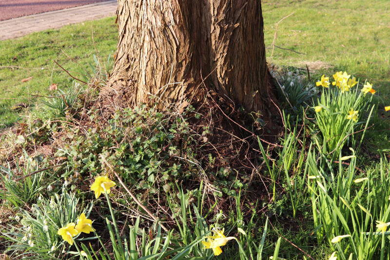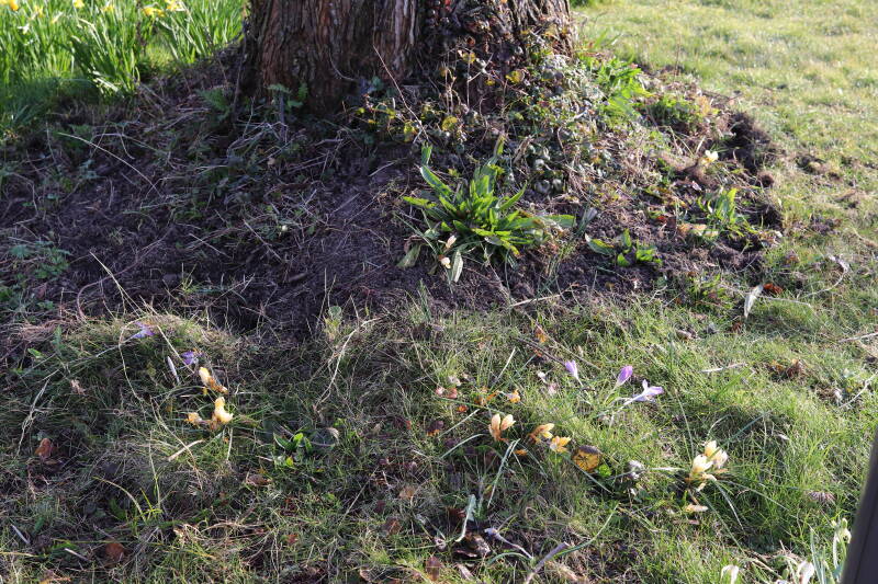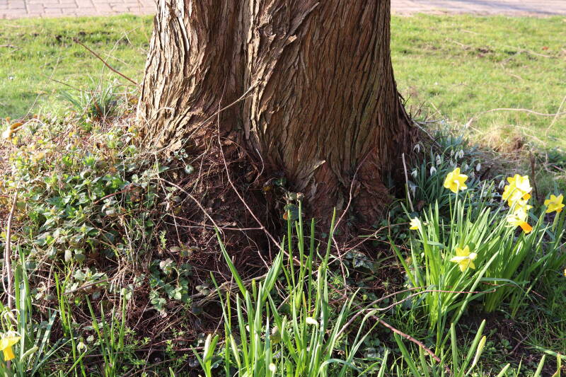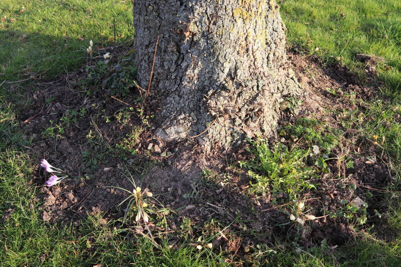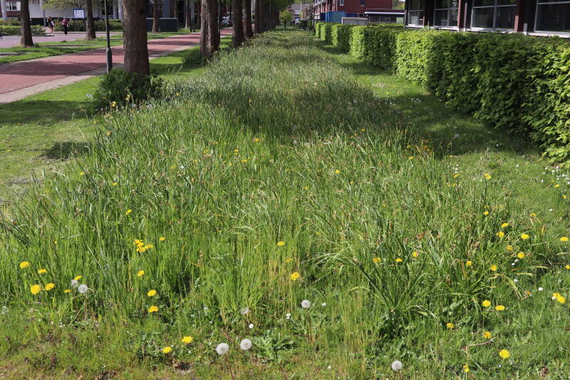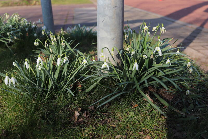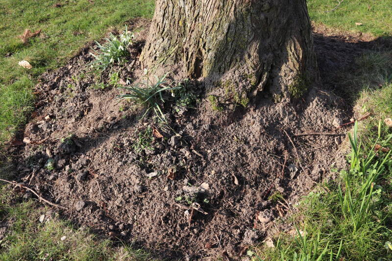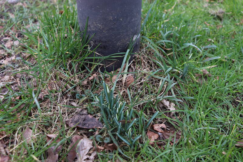 Rondom diverse bomen, bij lantaarnpalen, verkeersborden en een schrikhek is een enkele soort bollen aangeplant. Veel vroegbloeiende bollen rondom de obstakels moeten al afgestorven zijn tegen de tijd dat er periodiek zal worden gebosmaaid, om deze bollen de kans te geven zich hier te handhaven. Het beperkt de soorten die ik hier kan toepassen, maar in de toekomst wel wens uit te breiden. Ik hoop dat de bollen rondom de boomspiegels langer ongemoeid worden gelaten en de mogelijkheid krijgen voldoende reserves op te bouwen om ook de komende jaren te kunnen schitteren.