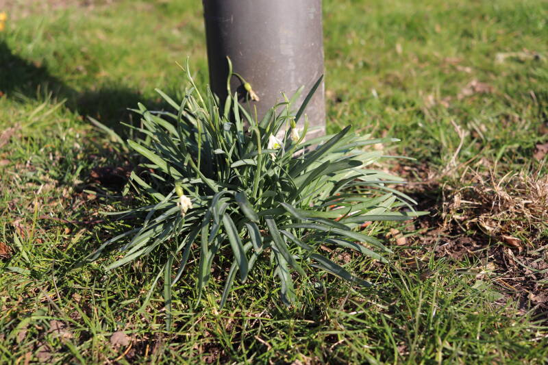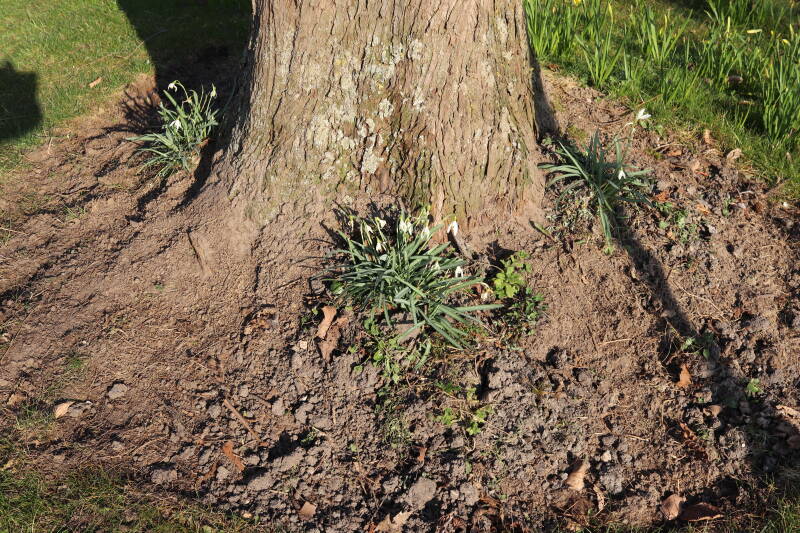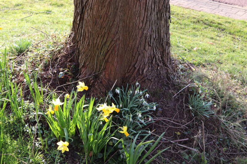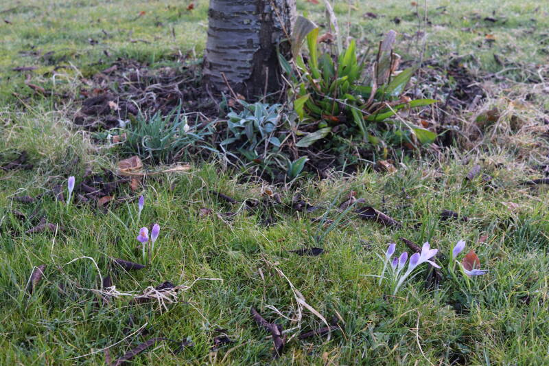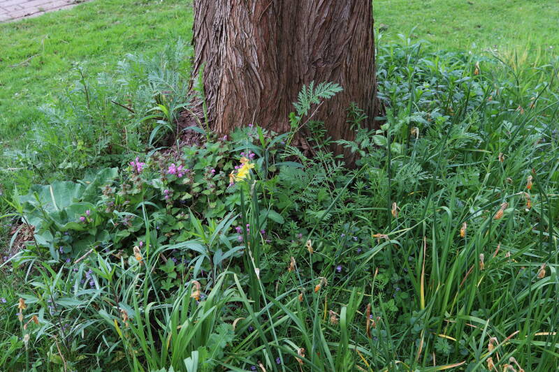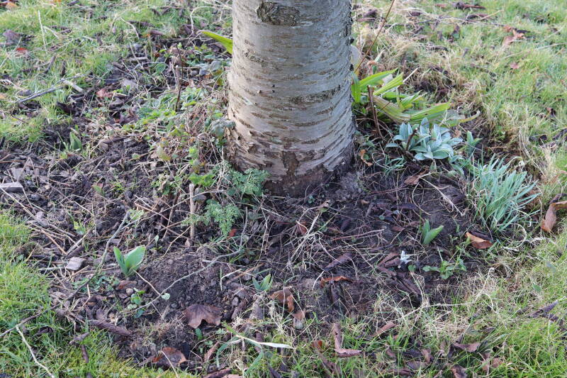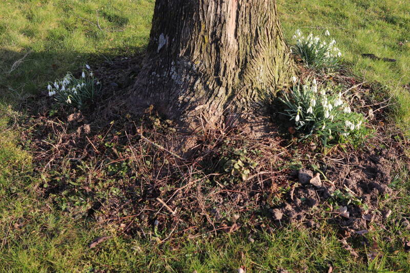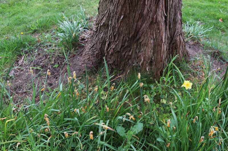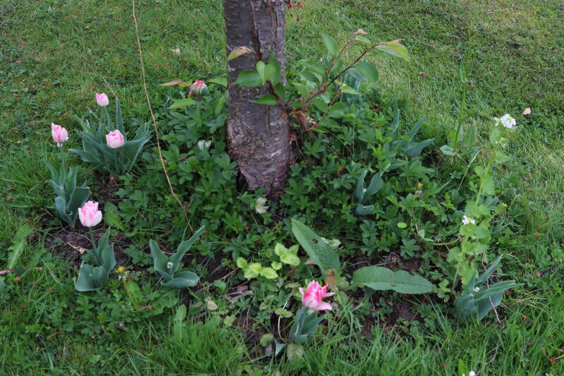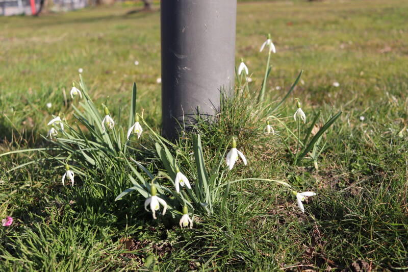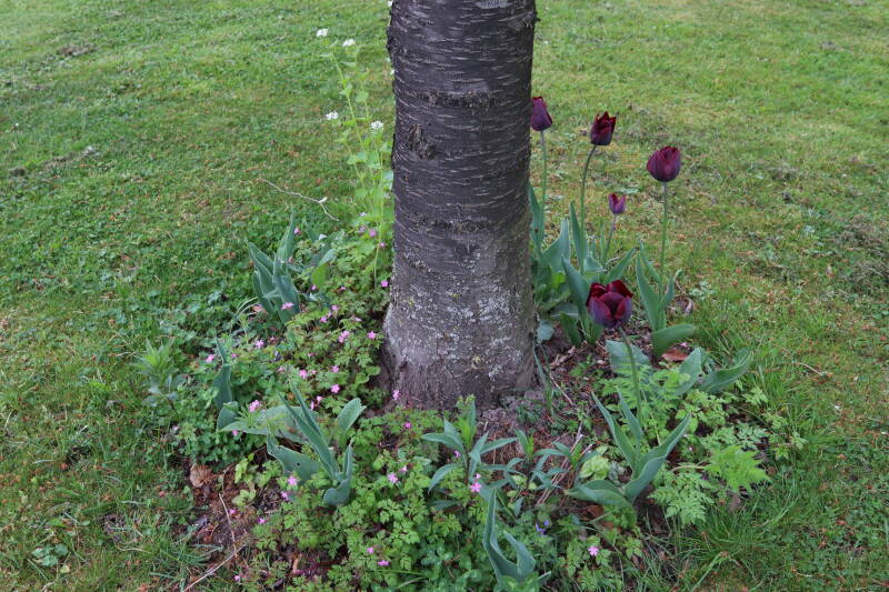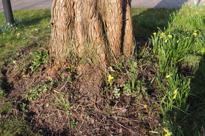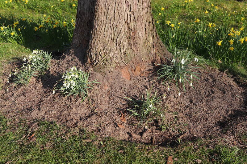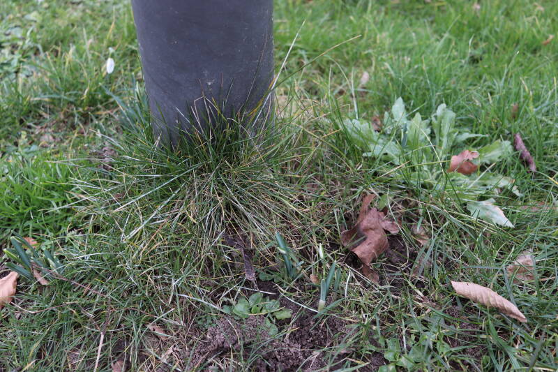Rondom diverse bomen, bij lantaarnpalen, verkeersborden en een schrikhek is een enkele soort bollen aangeplant. Veel vroegbloeiende bollen rondom de obstakels moeten al afgestorven zijn tegen de tijd dat er periodiek zal worden gebosmaaid, om deze bollen de kans te geven zich hier te handhaven. Het beperkt de soorten die ik hier kan toepassen, maar in de toekomst wel wens uit te breiden. Ik hoop dat de bollen rondom de boomspiegels langer ongemoeid worden gelaten en de mogelijkheid krijgen voldoende reserves op te bouwen om ook de komende jaren te kunnen schitteren.