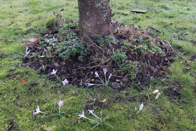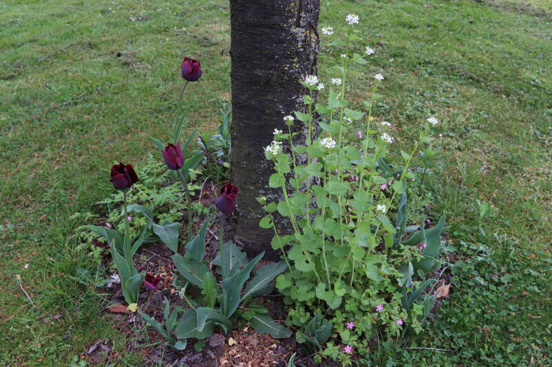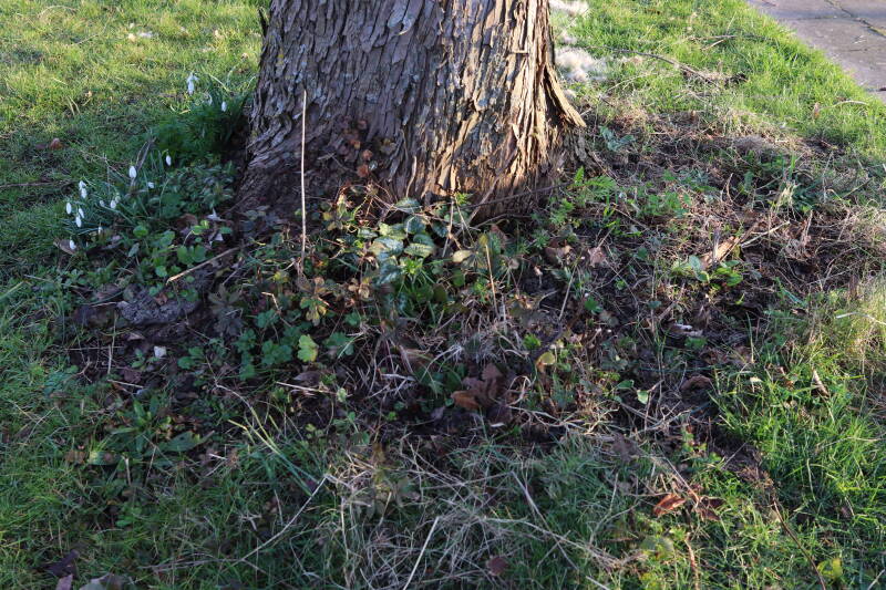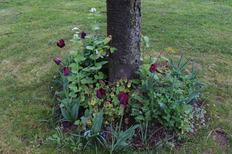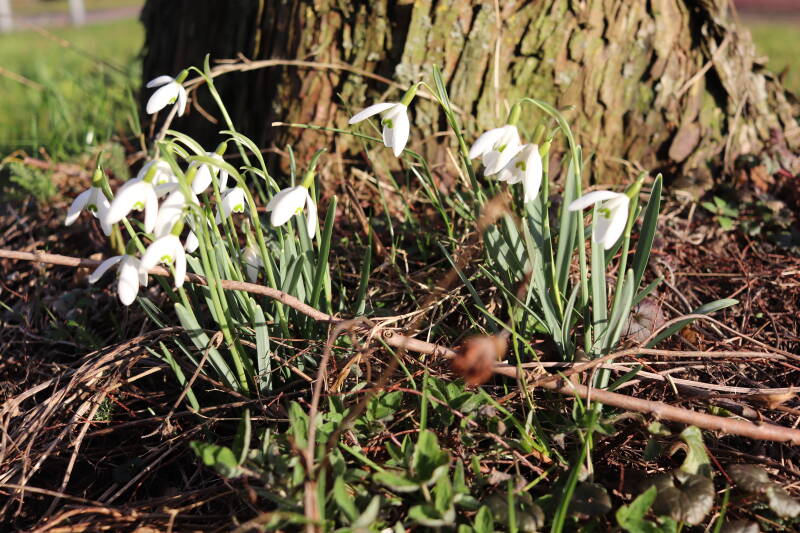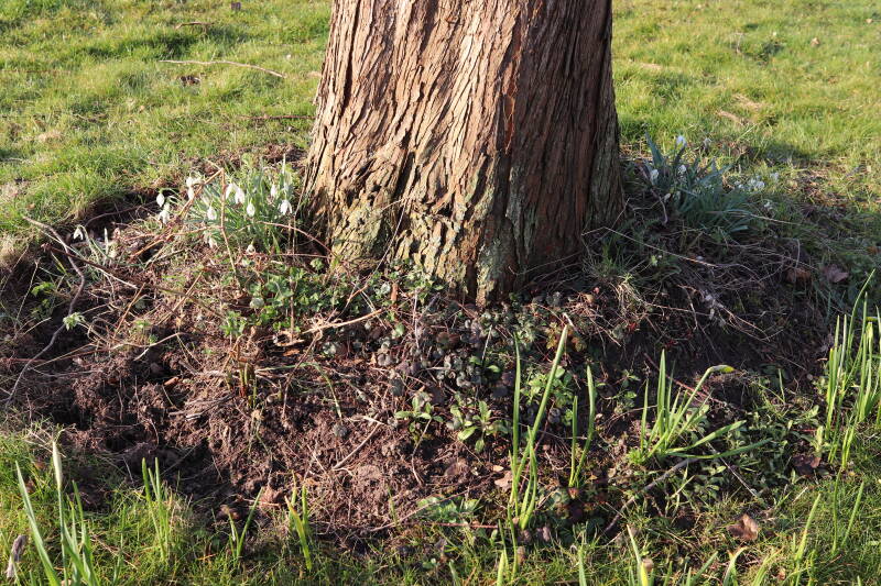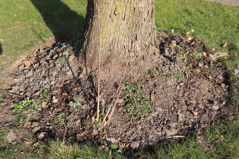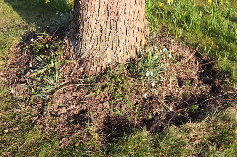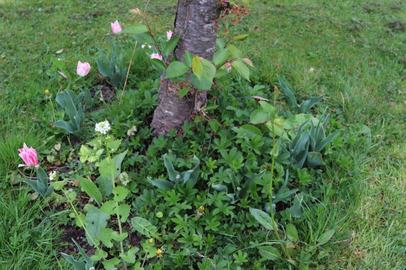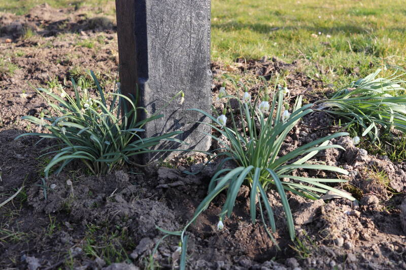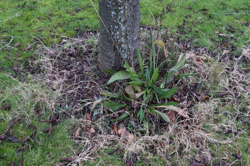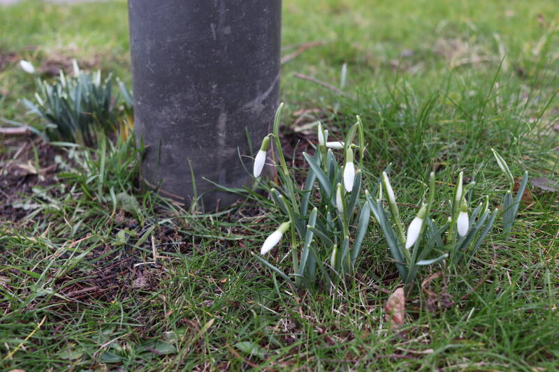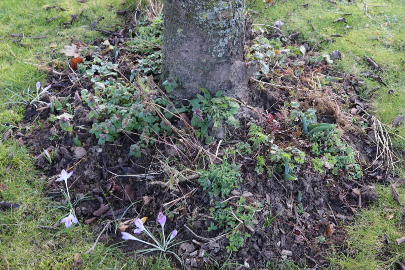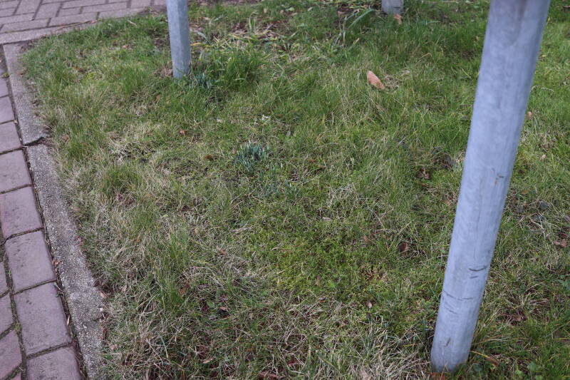 Rondom diverse bomen, bij lantaarnpalen, verkeersborden en een schrikhek is een enkele soort bollen aangeplant. Veel vroegbloeiende bollen rondom de obstakels moeten al afgestorven zijn tegen de tijd dat er periodiek zal worden gebosmaaid, om deze bollen de kans te geven zich hier te handhaven. Het beperkt de soorten die ik hier kan toepassen, maar in de toekomst wel wens uit te breiden. Ik hoop dat de bollen rondom de boomspiegels langer ongemoeid worden gelaten en de mogelijkheid krijgen voldoende reserves op te bouwen om ook de komende jaren te kunnen schitteren.