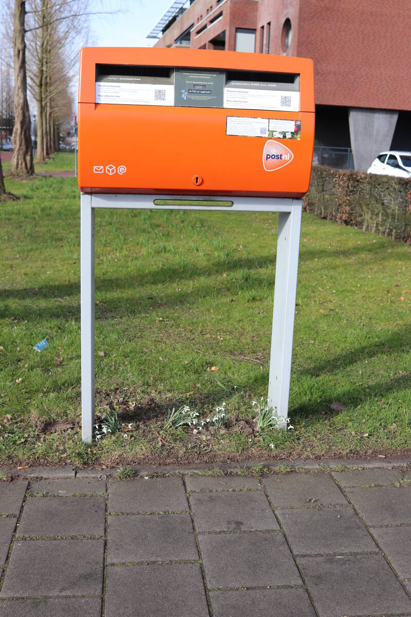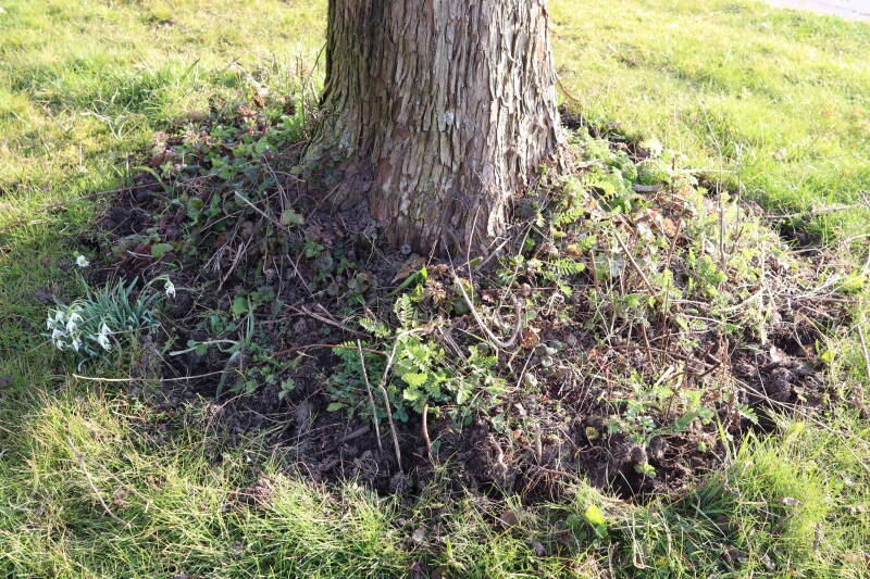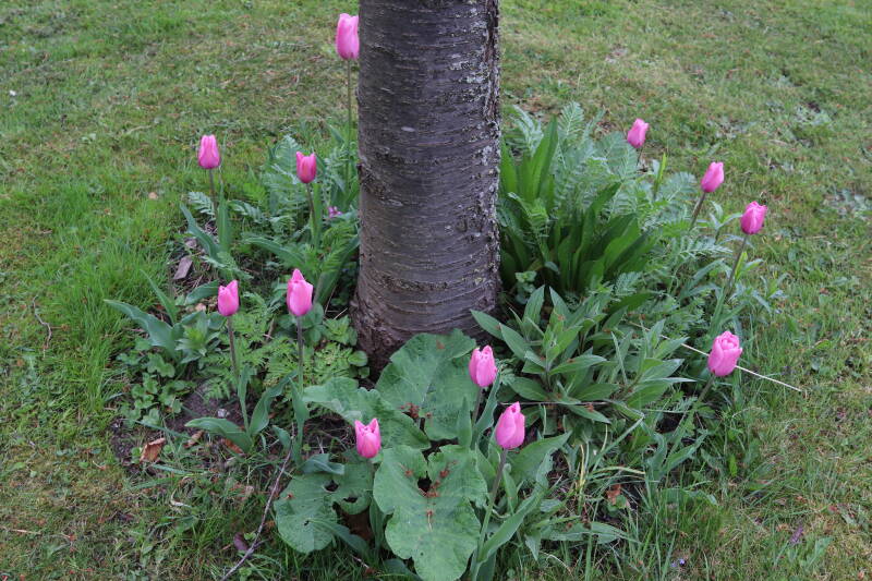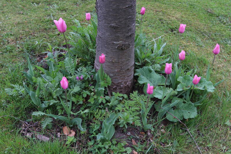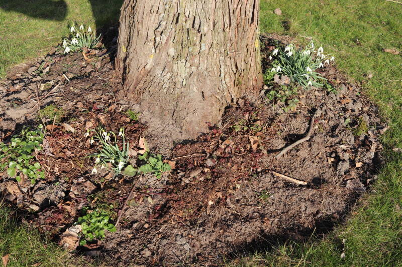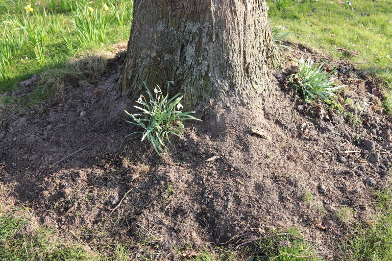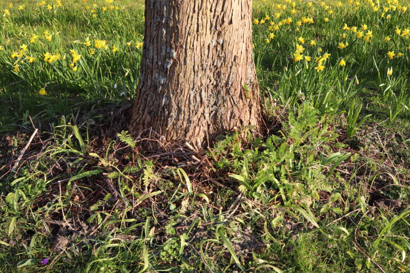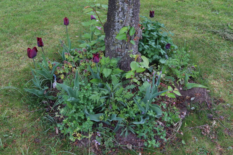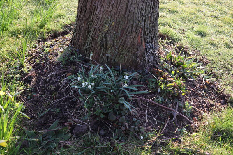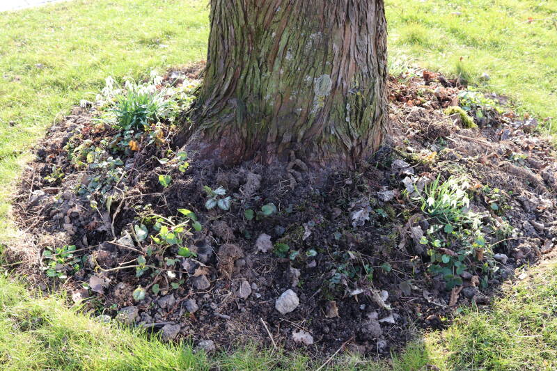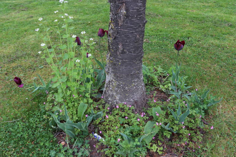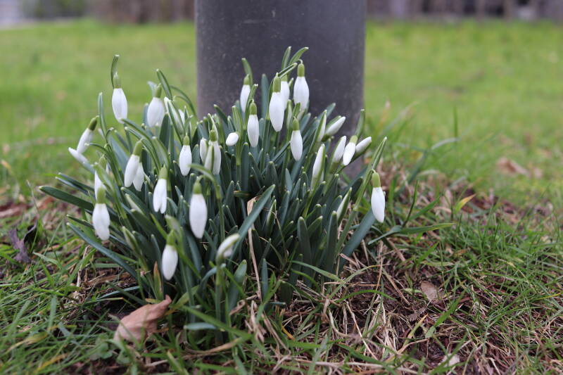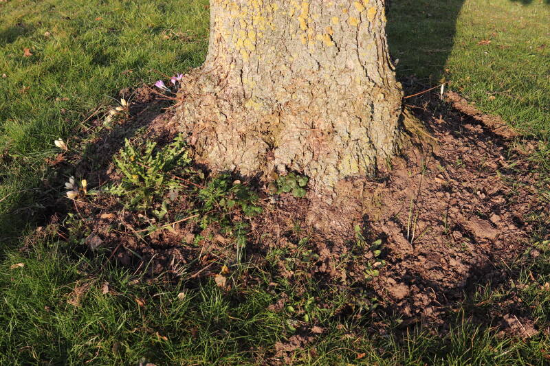Rondom diverse bomen, bij lantaarnpalen, verkeersborden en een schrikhek is een enkele soort bollen aangeplant. Veel vroegbloeiende bollen rondom de obstakels moeten al afgestorven zijn tegen de tijd dat er periodiek zal worden gebosmaaid, om deze bollen de kans te geven zich hier te handhaven. Het beperkt de soorten die ik hier kan toepassen, maar in de toekomst wel wens uit te breiden. Ik hoop dat de bollen rondom de boomspiegels langer ongemoeid worden gelaten en de mogelijkheid krijgen voldoende reserves op te bouwen om ook de komende jaren te kunnen schitteren.