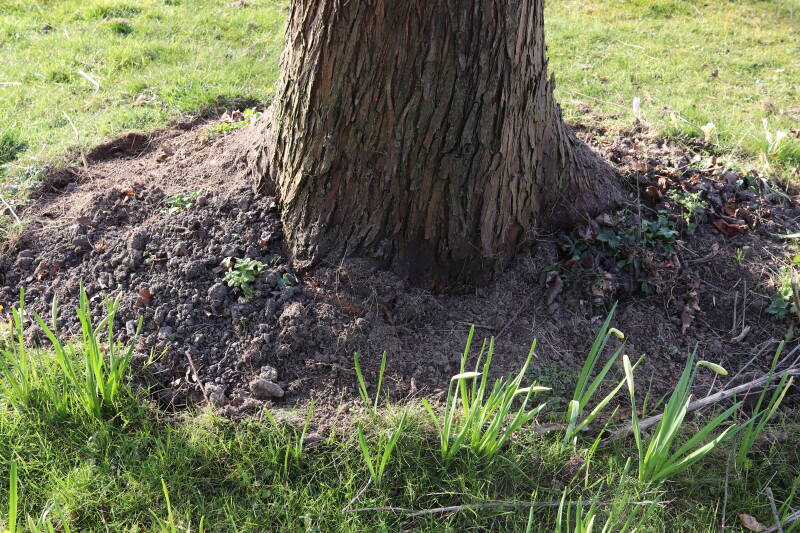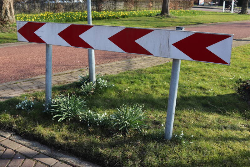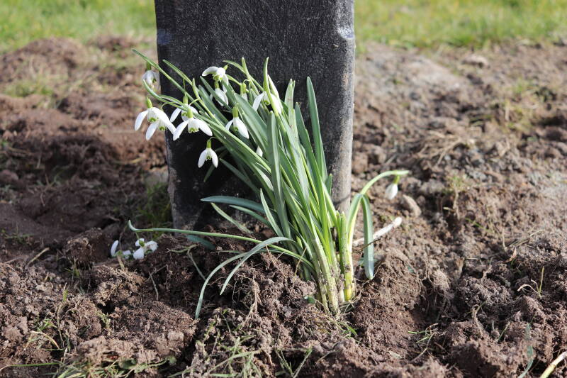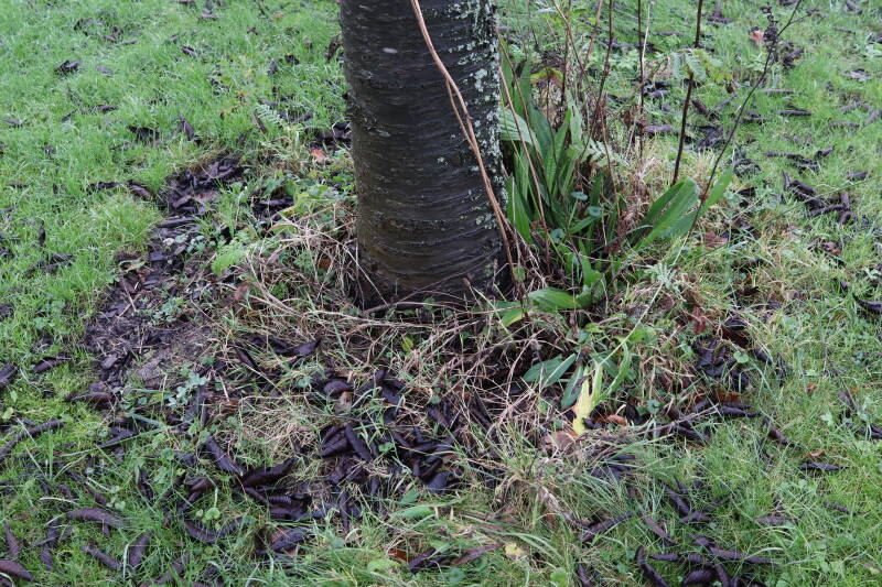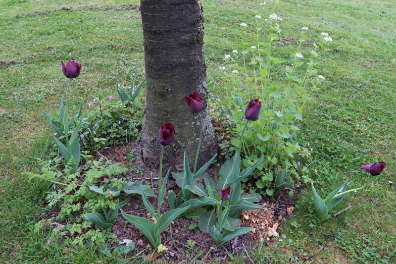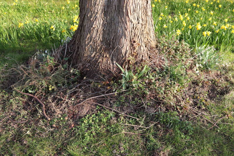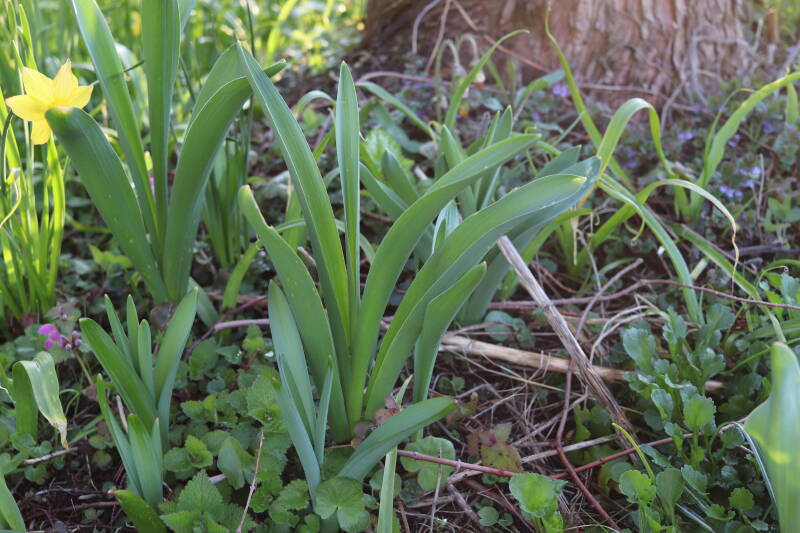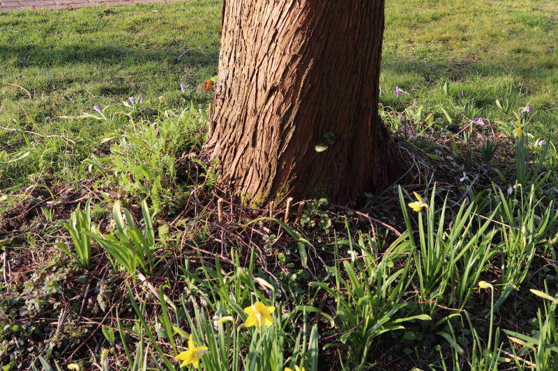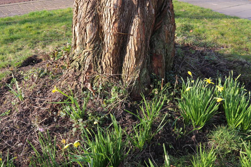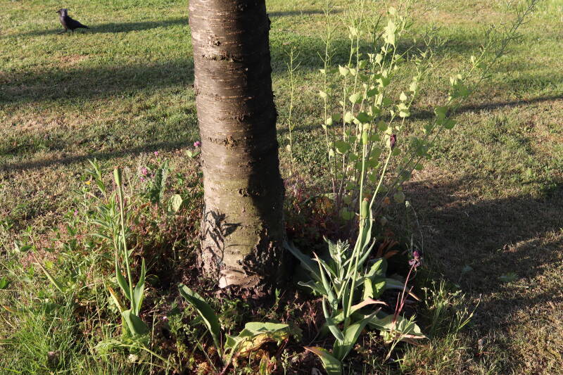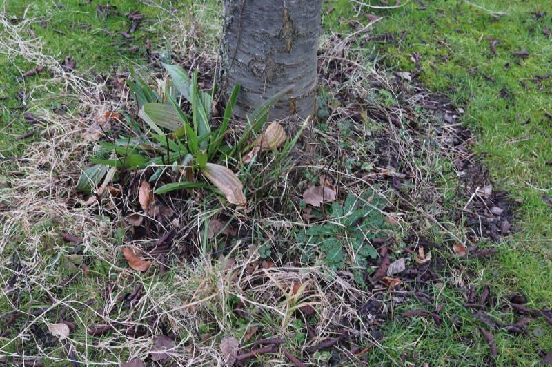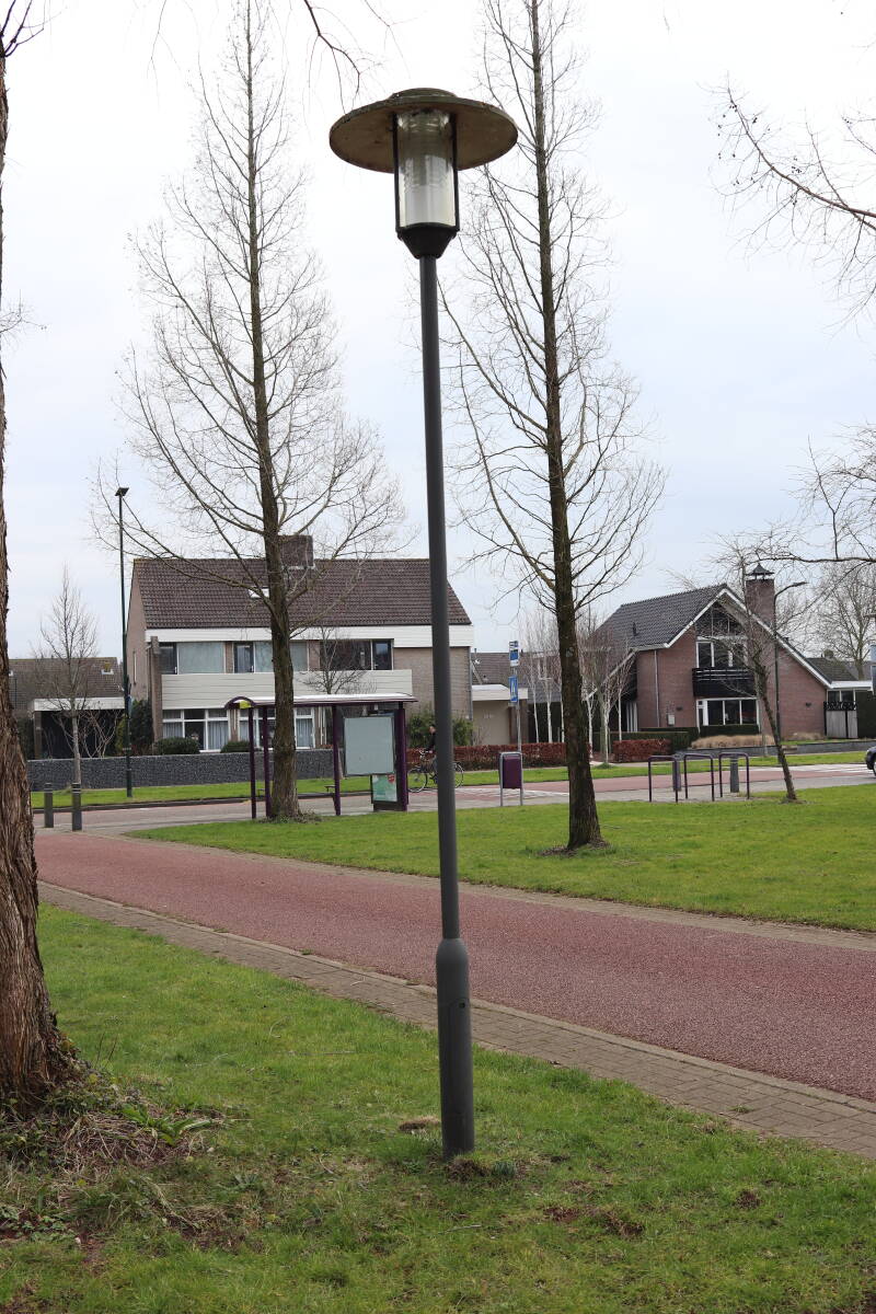 Rondom diverse bomen, bij lantaarnpalen, verkeersborden en een schrikhek is een enkele soort bollen aangeplant. Veel vroegbloeiende bollen rondom de obstakels moeten al afgestorven zijn tegen de tijd dat er periodiek zal worden gebosmaaid, om deze bollen de kans te geven zich hier te handhaven. Het beperkt de soorten die ik hier kan toepassen, maar in de toekomst wel wens uit te breiden. Ik hoop dat de bollen rondom de boomspiegels langer ongemoeid worden gelaten en de mogelijkheid krijgen voldoende reserves op te bouwen om ook de komende jaren te kunnen schitteren.