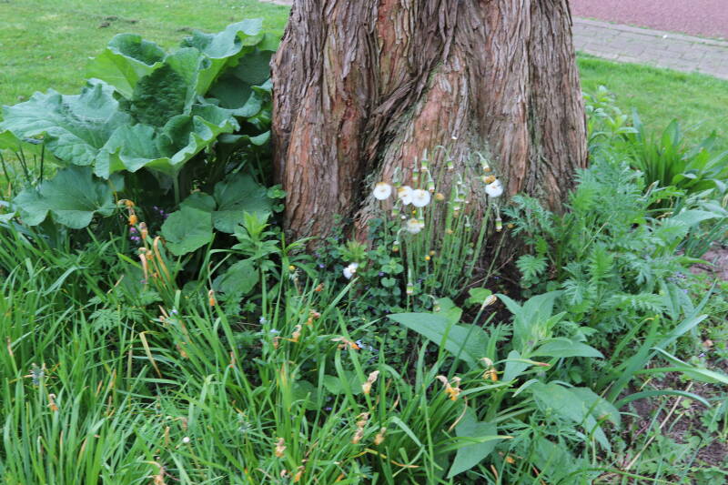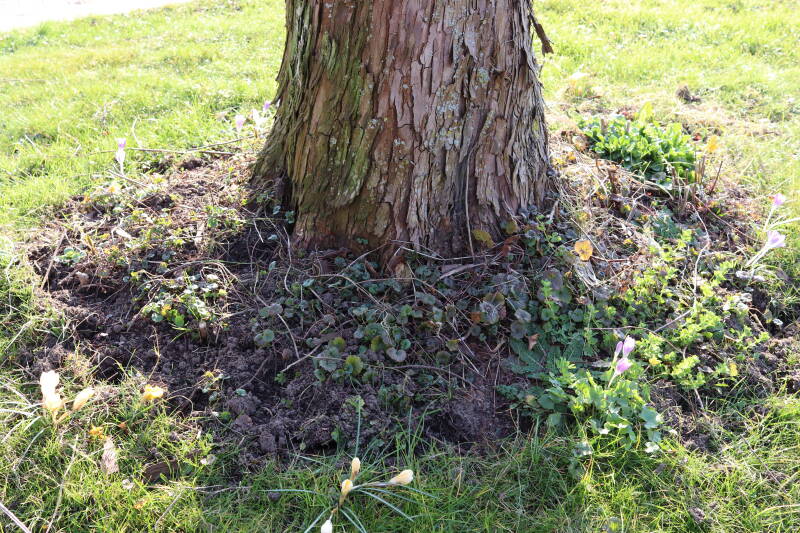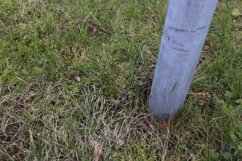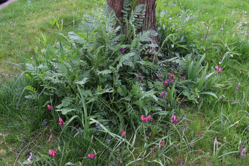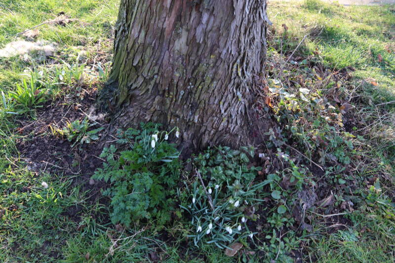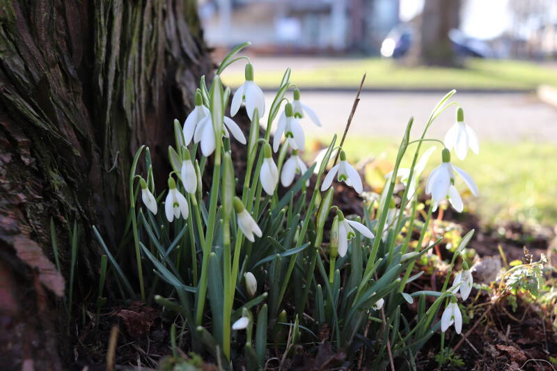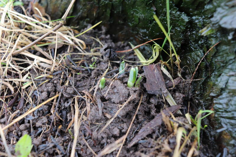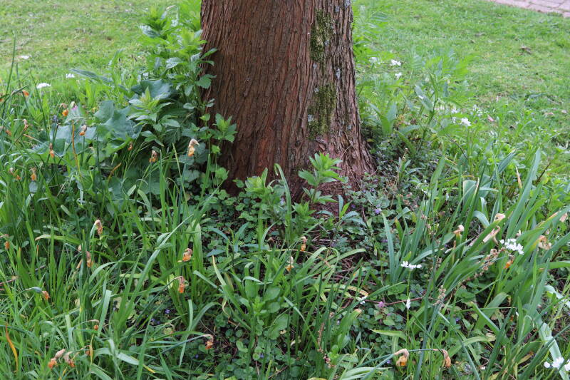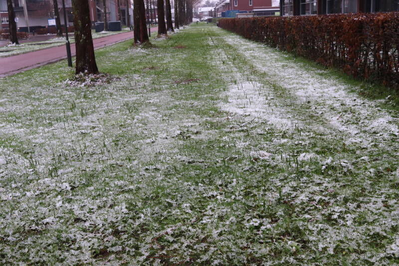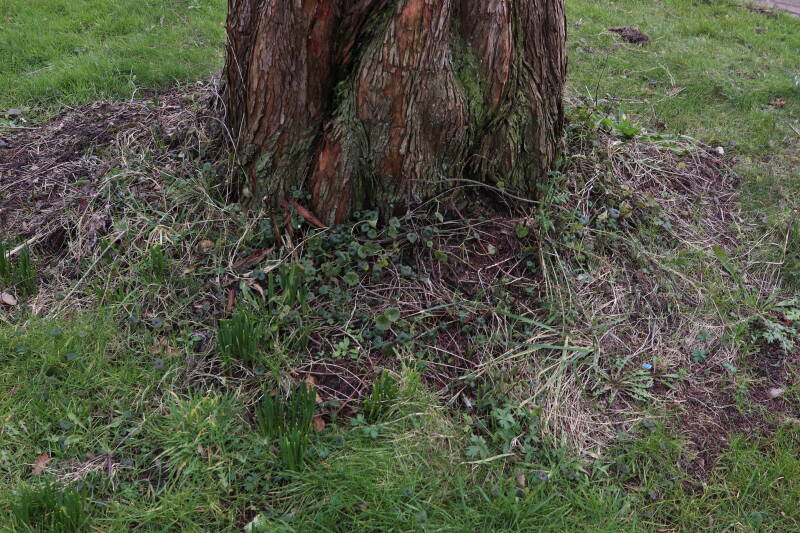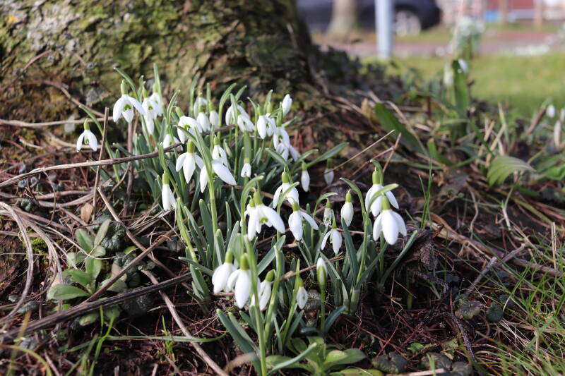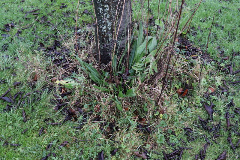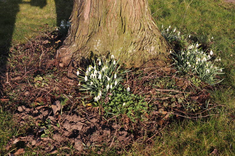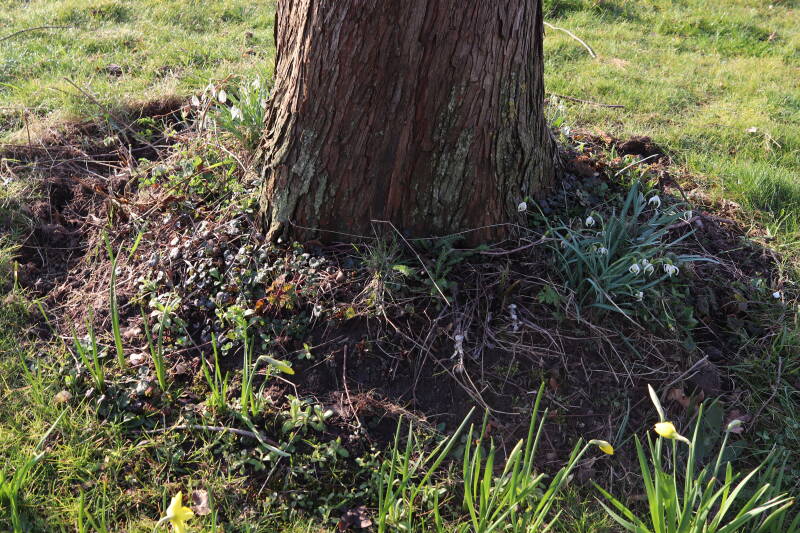 Rondom diverse bomen, bij lantaarnpalen, verkeersborden en een schrikhek is een enkele soort bollen aangeplant. Veel vroegbloeiende bollen rondom de obstakels moeten al afgestorven zijn tegen de tijd dat er periodiek zal worden gebosmaaid, om deze bollen de kans te geven zich hier te handhaven. Het beperkt de soorten die ik hier kan toepassen, maar in de toekomst wel wens uit te breiden. Ik hoop dat de bollen rondom de boomspiegels langer ongemoeid worden gelaten en de mogelijkheid krijgen voldoende reserves op te bouwen om ook de komende jaren te kunnen schitteren.