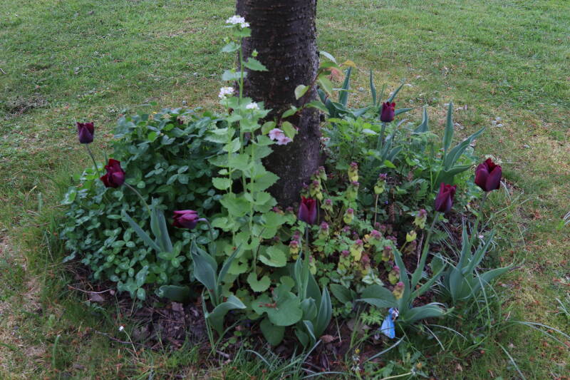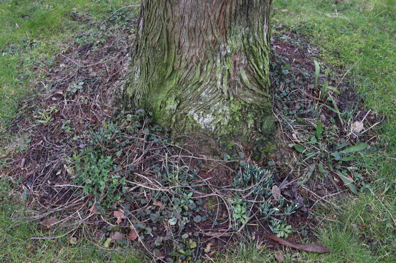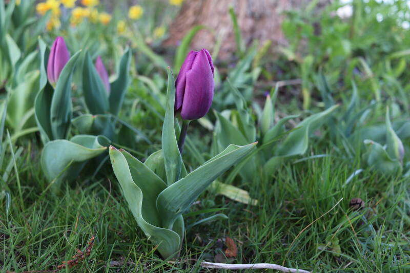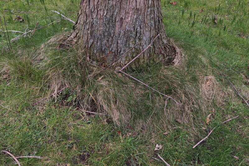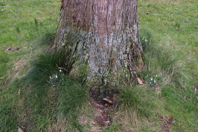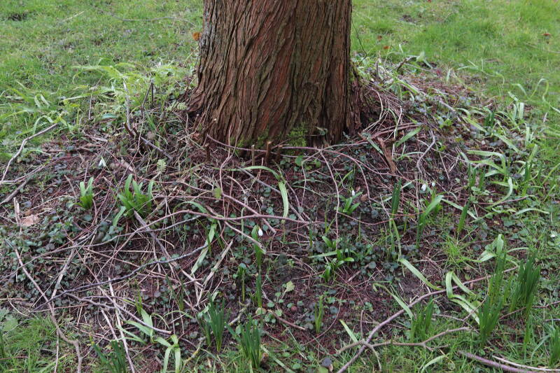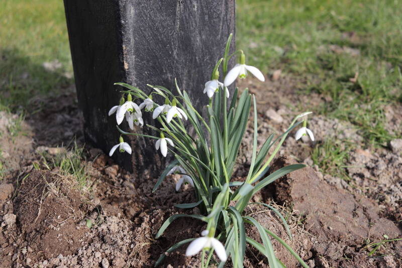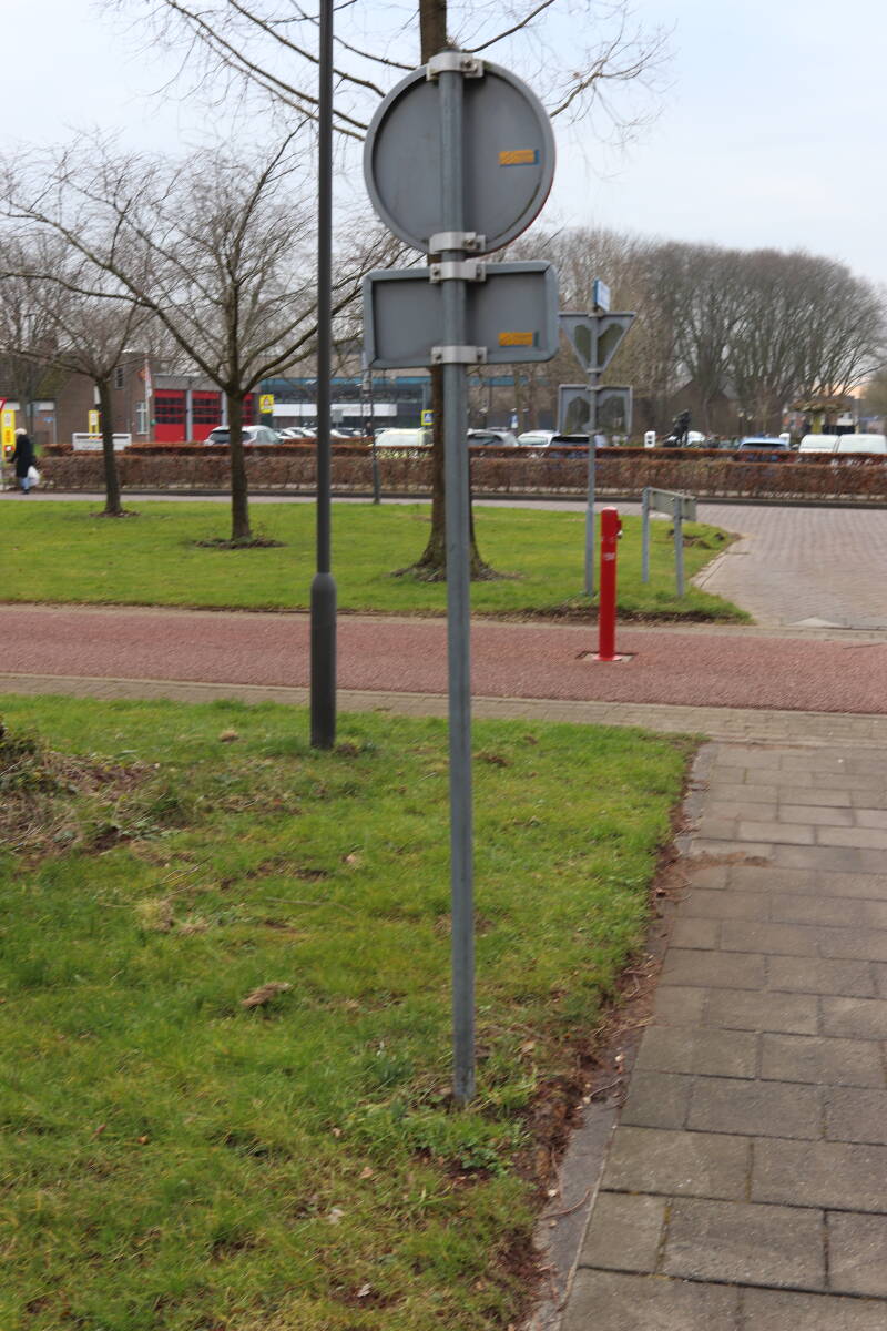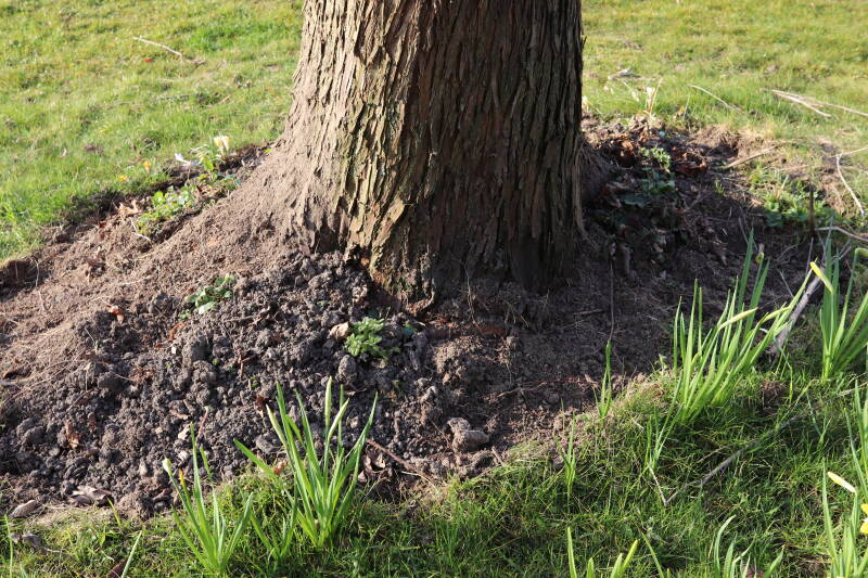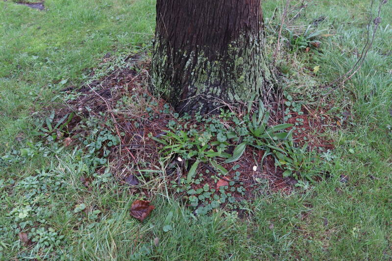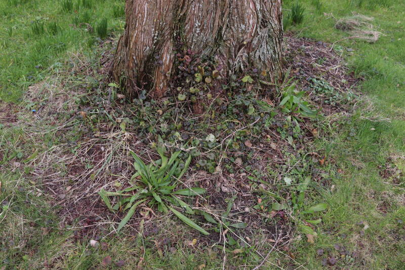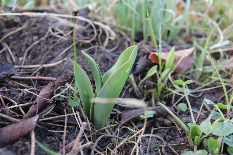Rondom diverse bomen, bij lantaarnpalen, verkeersborden en een schrikhek is een enkele soort bollen aangeplant. Veel vroegbloeiende bollen rondom de obstakels moeten al afgestorven zijn tegen de tijd dat er periodiek zal worden gebosmaaid, om deze bollen de kans te geven zich hier te handhaven. Het beperkt de soorten die ik hier kan toepassen, maar in de toekomst wel wens uit te breiden. Ik hoop dat de bollen rondom de boomspiegels langer ongemoeid worden gelaten en de mogelijkheid krijgen voldoende reserves op te bouwen om ook de komende jaren te kunnen schitteren.