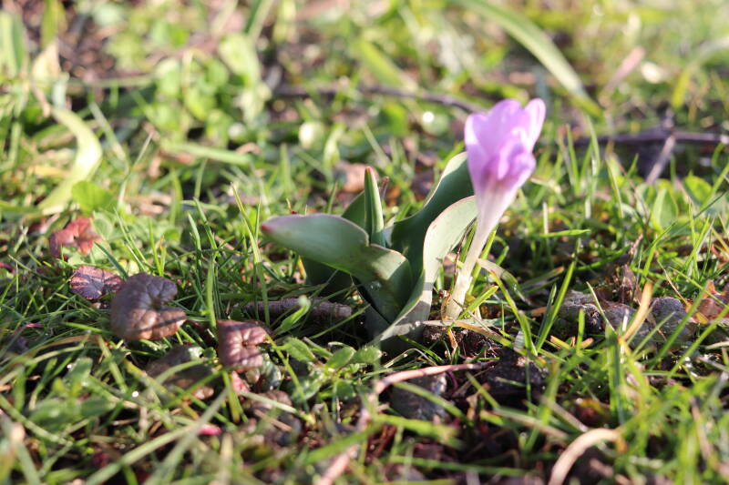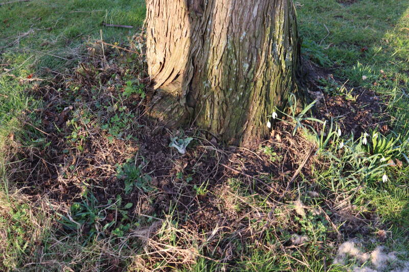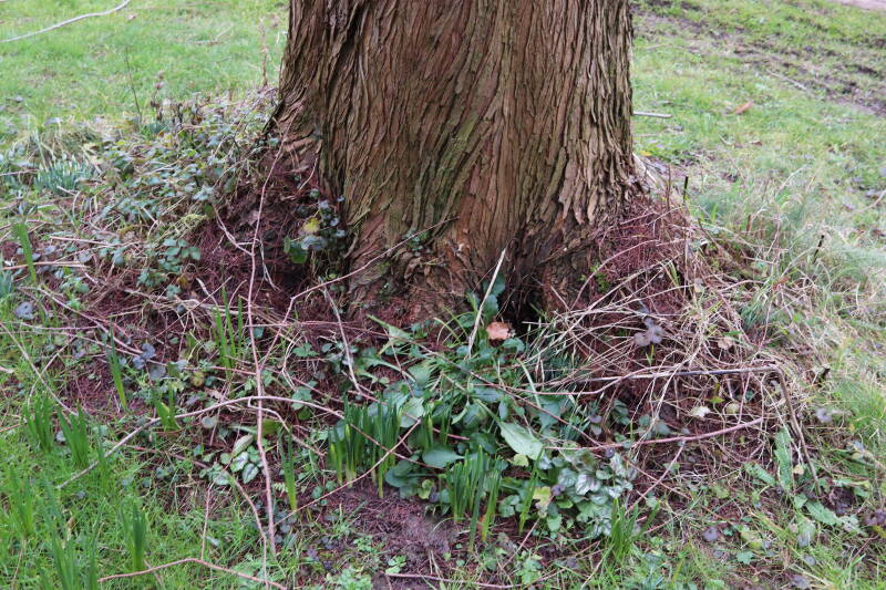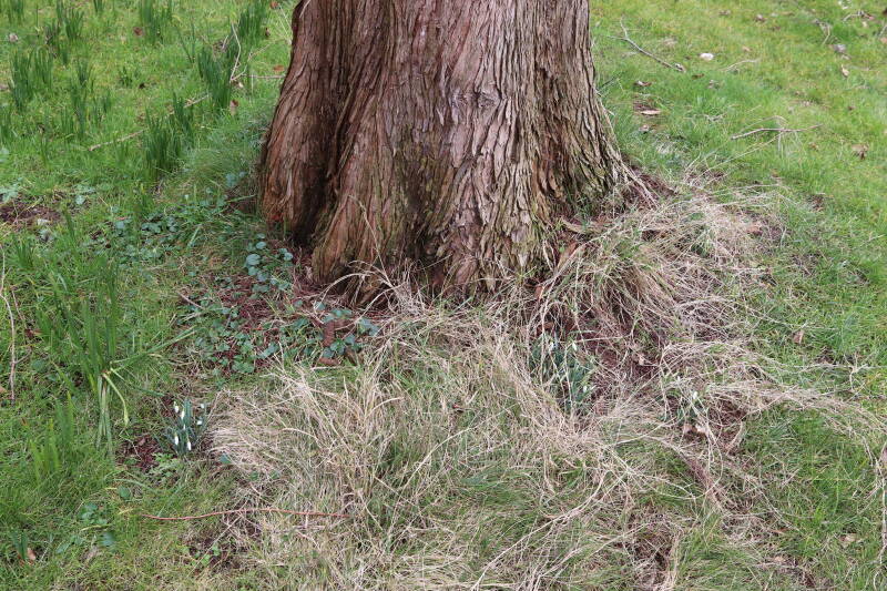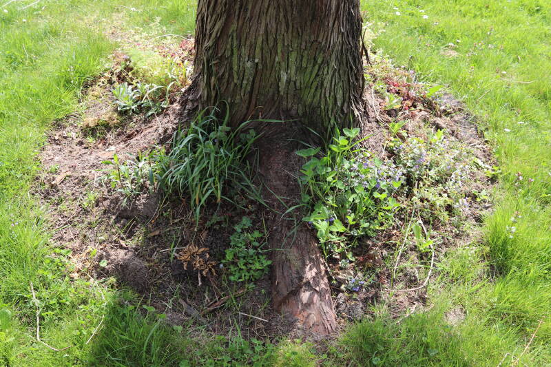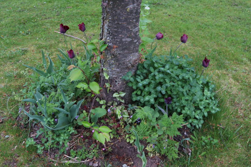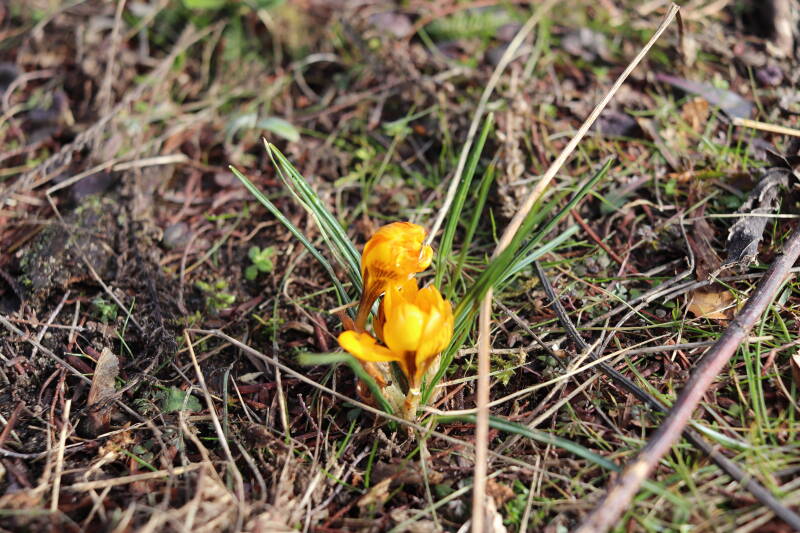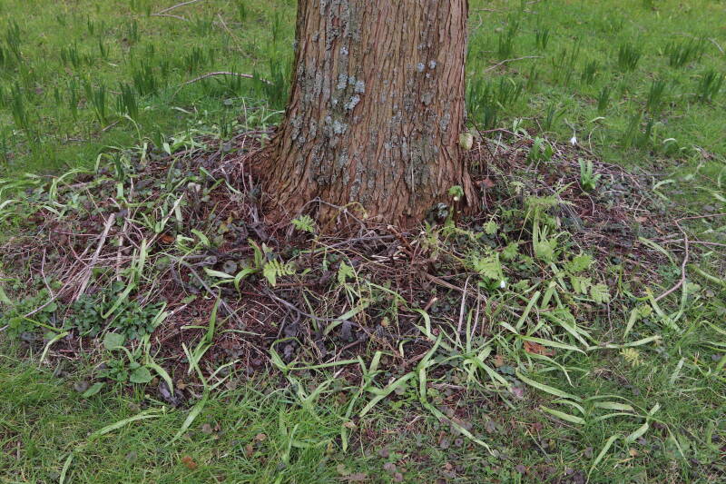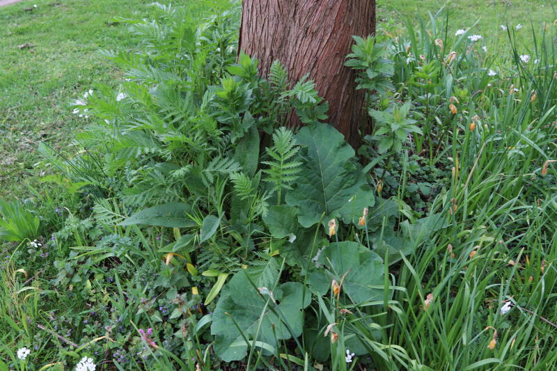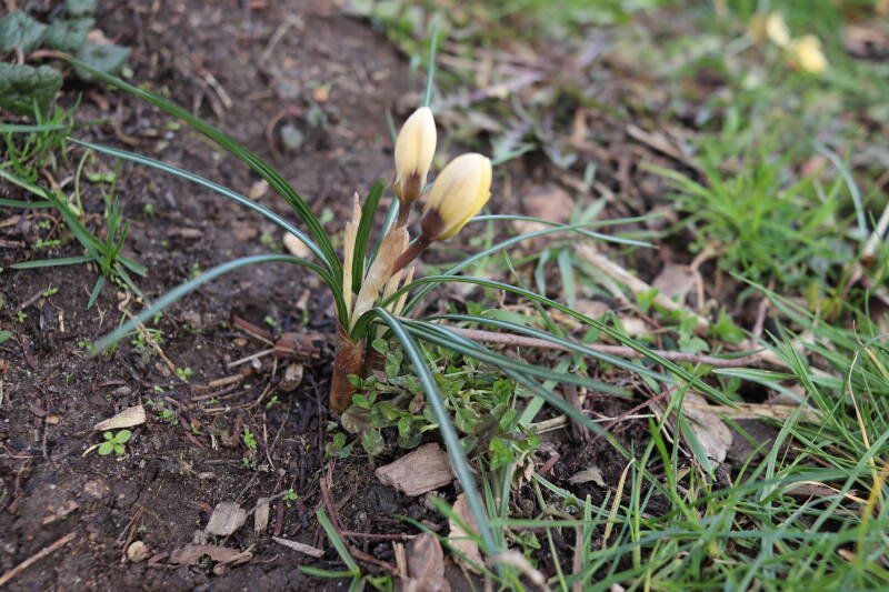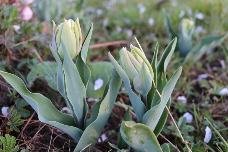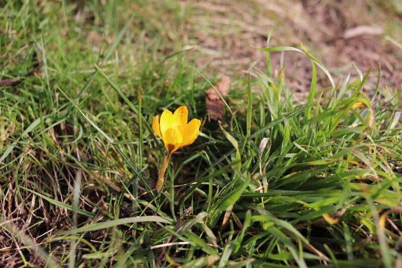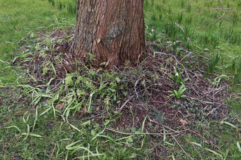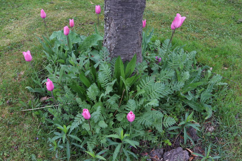 Rondom diverse bomen, bij lantaarnpalen, verkeersborden en een schrikhek is een enkele soort bollen aangeplant. Veel vroegbloeiende bollen rondom de obstakels moeten al afgestorven zijn tegen de tijd dat er periodiek zal worden gebosmaaid, om deze bollen de kans te geven zich hier te handhaven. Het beperkt de soorten die ik hier kan toepassen, maar in de toekomst wel wens uit te breiden. Ik hoop dat de bollen rondom de boomspiegels langer ongemoeid worden gelaten en de mogelijkheid krijgen voldoende reserves op te bouwen om ook de komende jaren te kunnen schitteren.