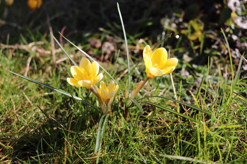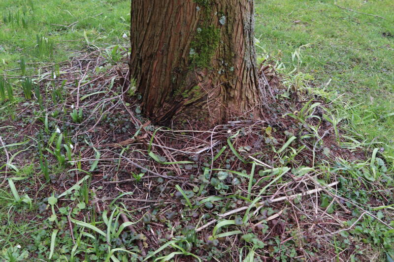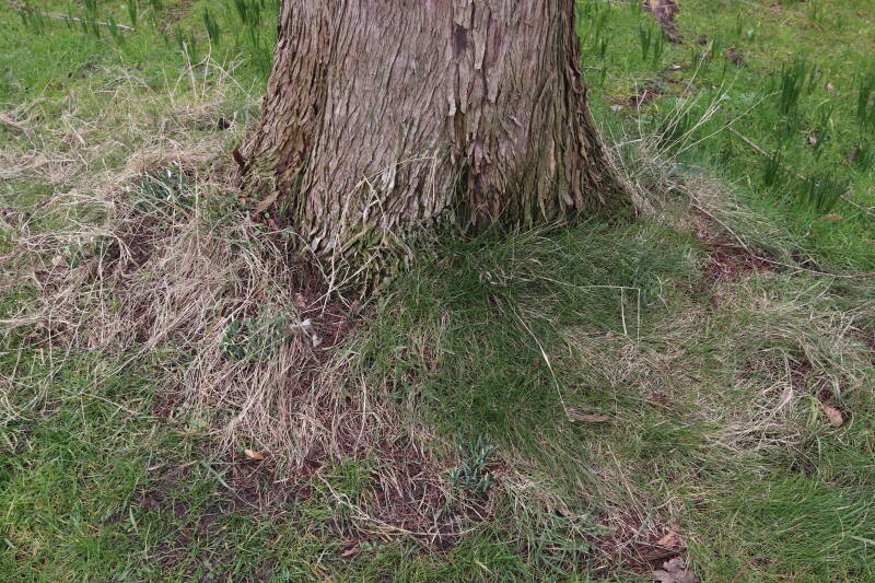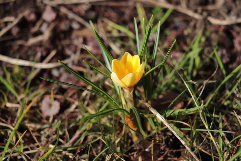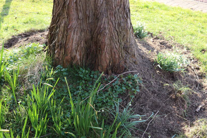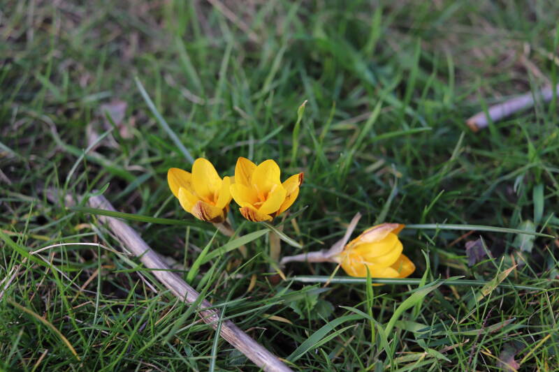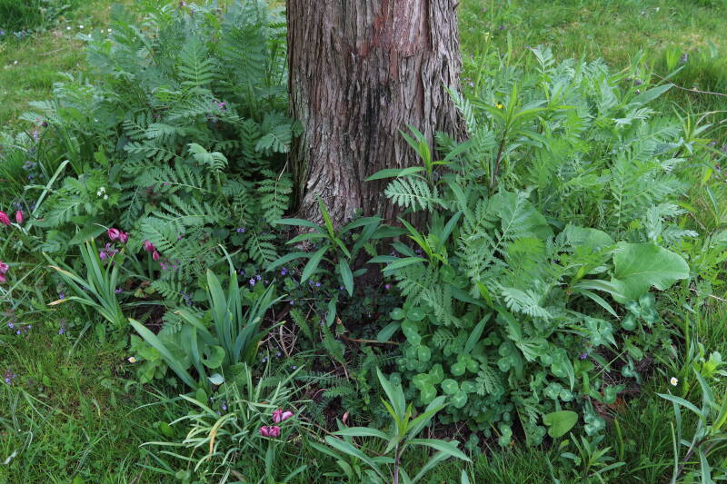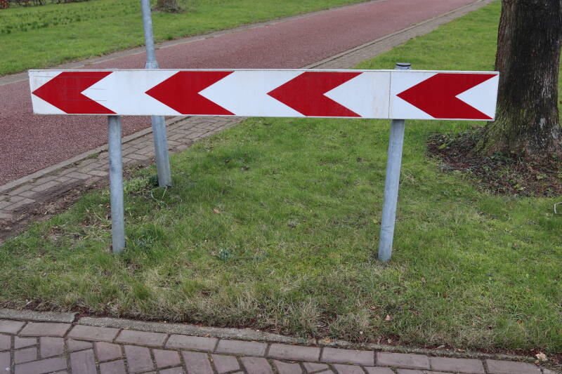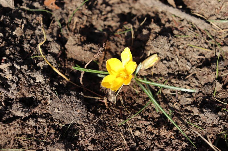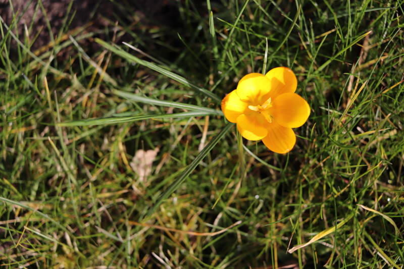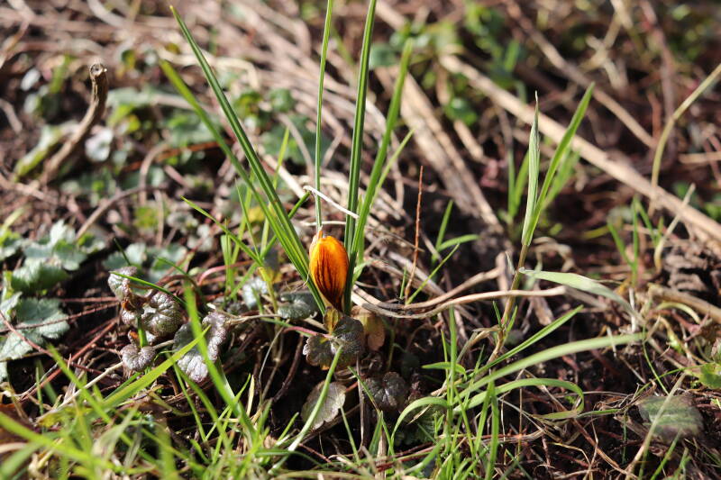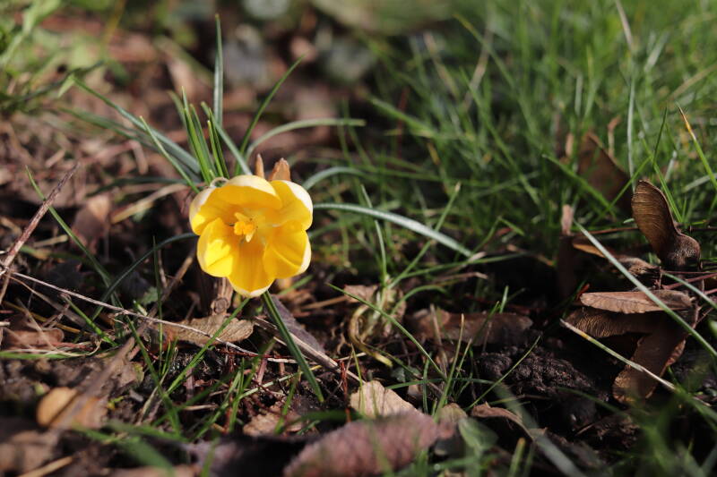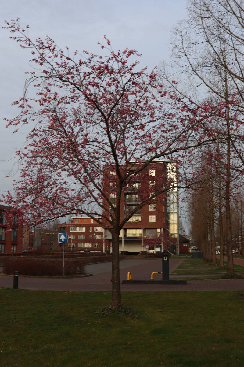 Rondom diverse bomen, bij lantaarnpalen, verkeersborden en een schrikhek is een enkele soort bollen aangeplant. Veel vroegbloeiende bollen rondom de obstakels moeten al afgestorven zijn tegen de tijd dat er periodiek zal worden gebosmaaid, om deze bollen de kans te geven zich hier te handhaven. Het beperkt de soorten die ik hier kan toepassen, maar in de toekomst wel wens uit te breiden. Ik hoop dat de bollen rondom de boomspiegels langer ongemoeid worden gelaten en de mogelijkheid krijgen voldoende reserves op te bouwen om ook de komende jaren te kunnen schitteren.