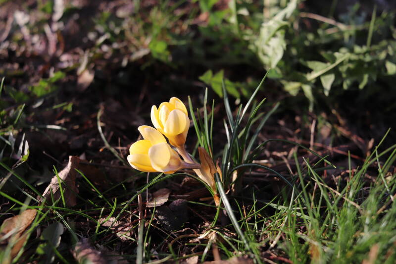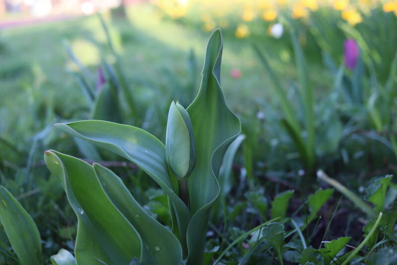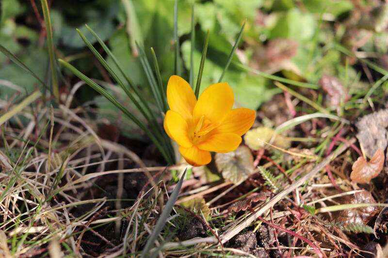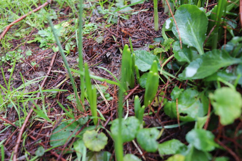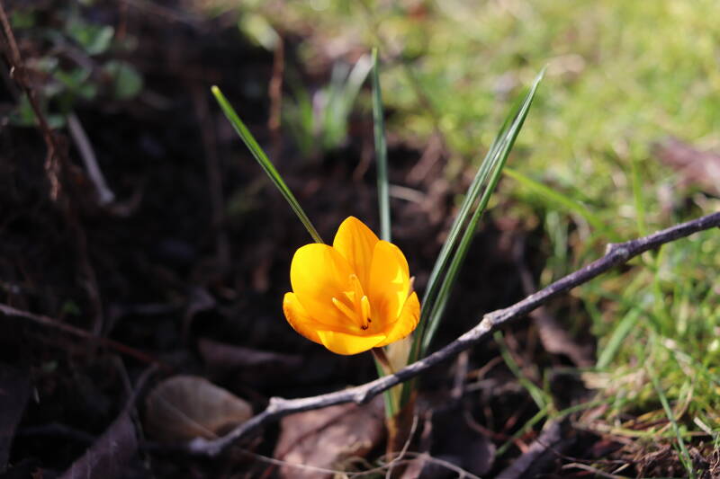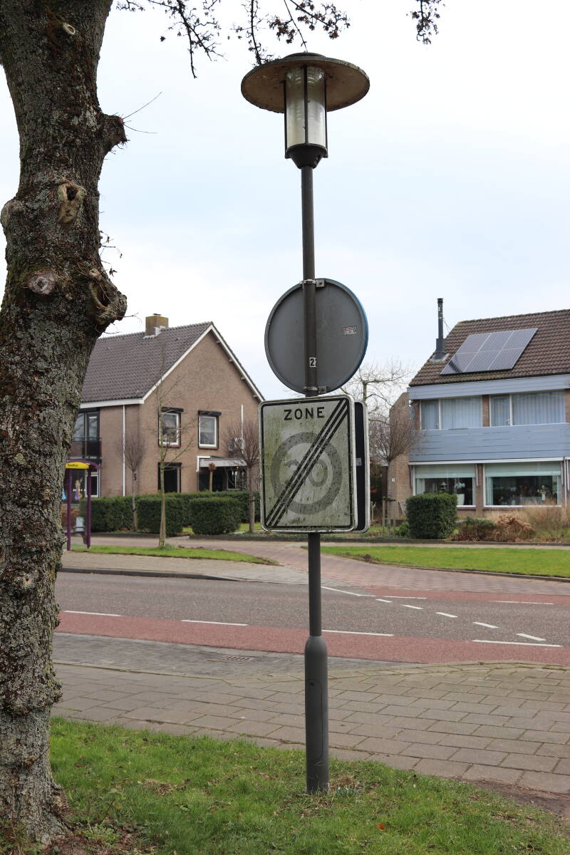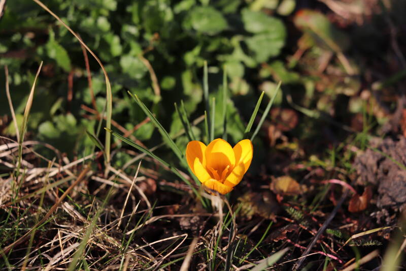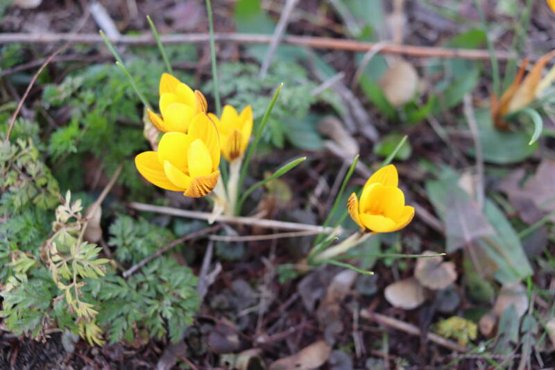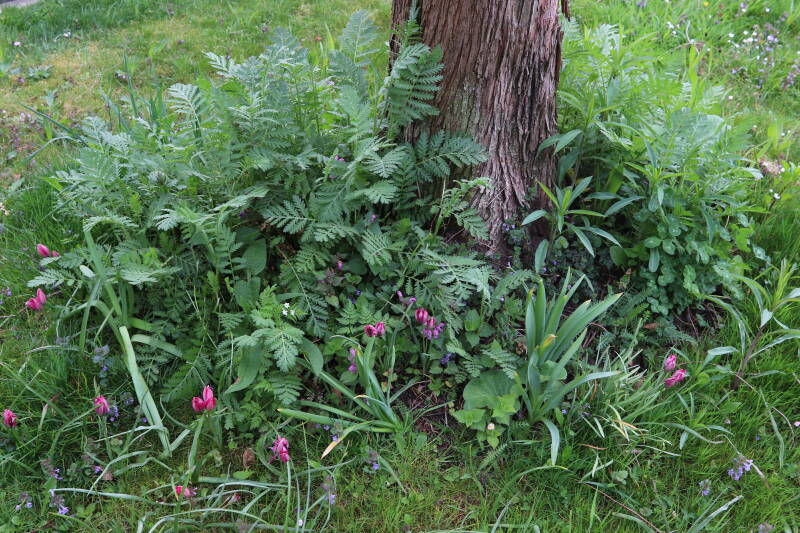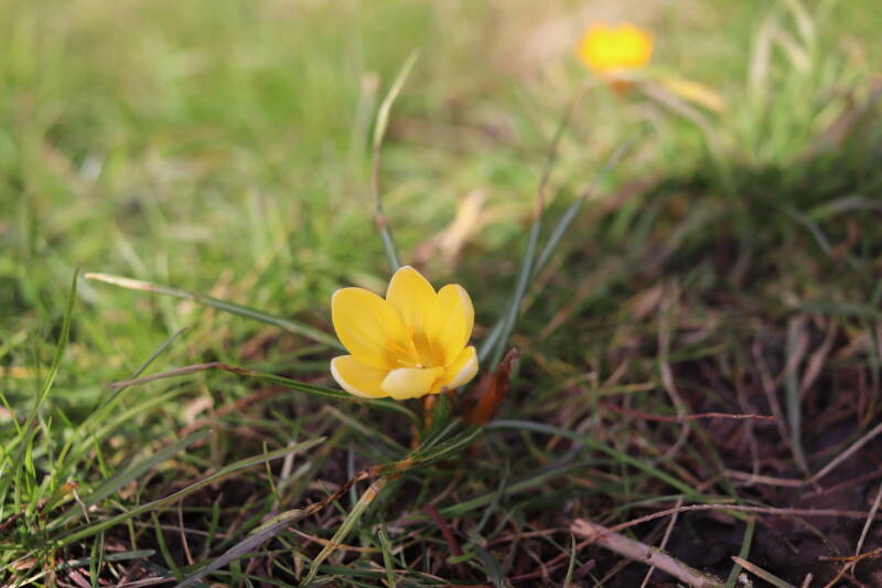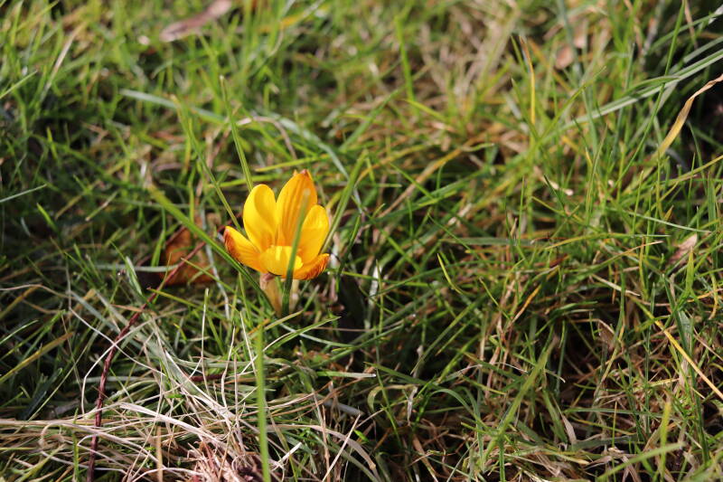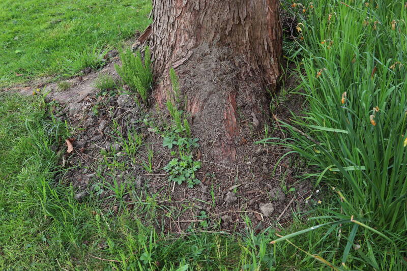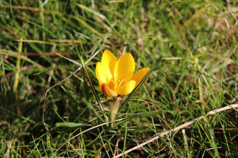 Rondom diverse bomen, bij lantaarnpalen, verkeersborden en een schrikhek is een enkele soort bollen aangeplant. Veel vroegbloeiende bollen rondom de obstakels moeten al afgestorven zijn tegen de tijd dat er periodiek zal worden gebosmaaid, om deze bollen de kans te geven zich hier te handhaven. Het beperkt de soorten die ik hier kan toepassen, maar in de toekomst wel wens uit te breiden. Ik hoop dat de bollen rondom de boomspiegels langer ongemoeid worden gelaten en de mogelijkheid krijgen voldoende reserves op te bouwen om ook de komende jaren te kunnen schitteren.