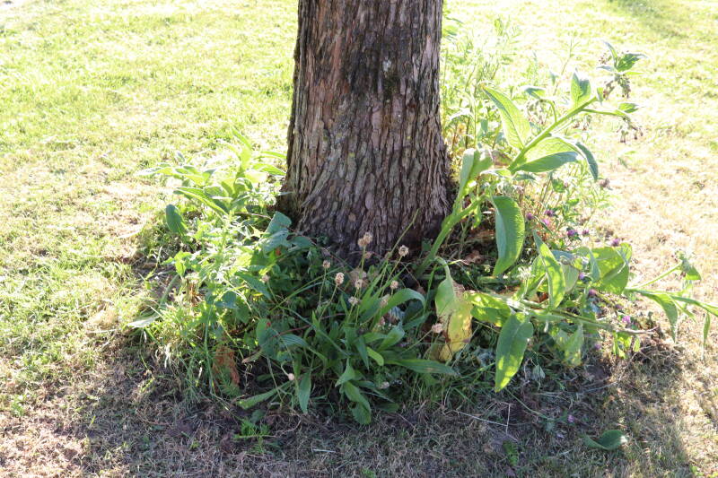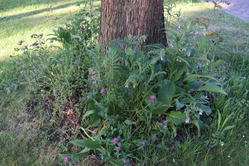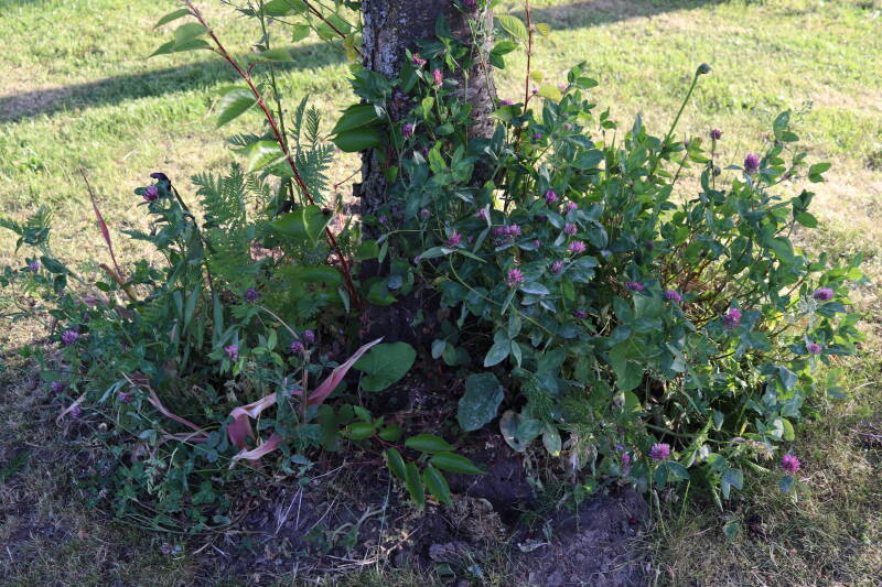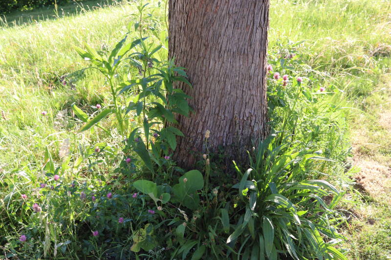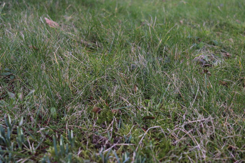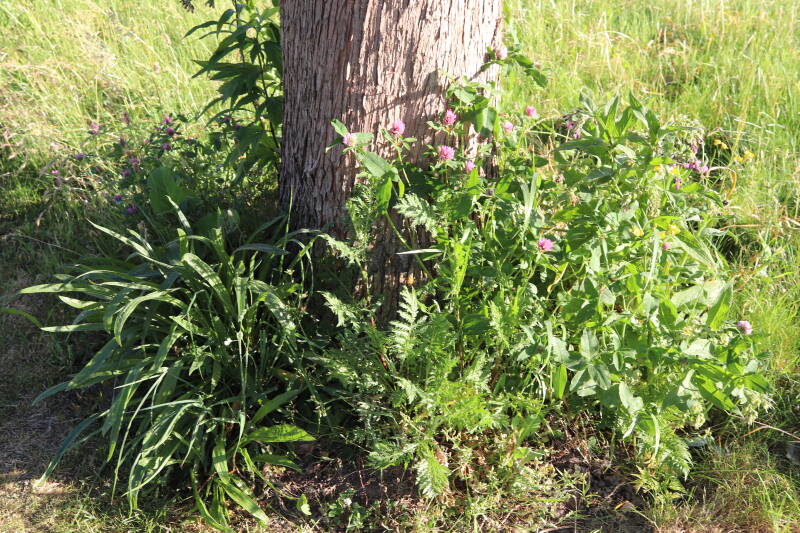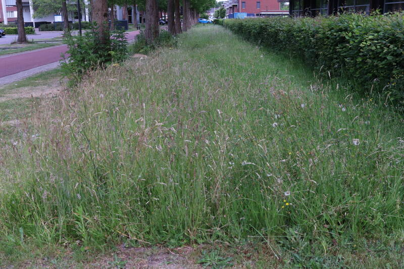 Een groot deel van de buitenruimte bestaat uit gazon. Hier komen naast natuurlijk grassen ook verschillende soorten kruidachtige planten in voor. Al is de variatie spaarzamer dan het geval zou zijn als het ongemoeid zou worden gelaten door minder en meer gevarieerd te maaien. In de hoeken waar de maaimachine minder makkelijk kan komen hebben planten slechts tijdelijk langer de tijd om te groeien.