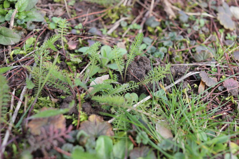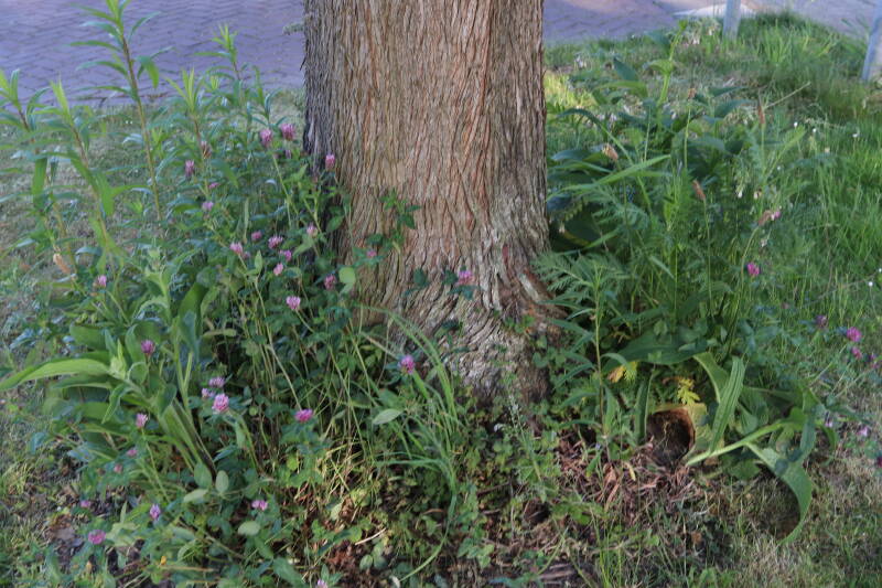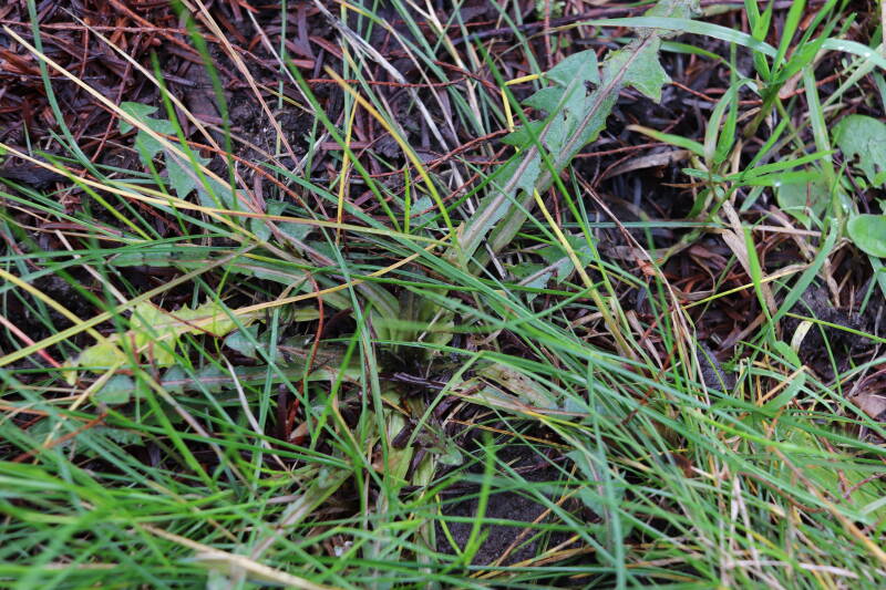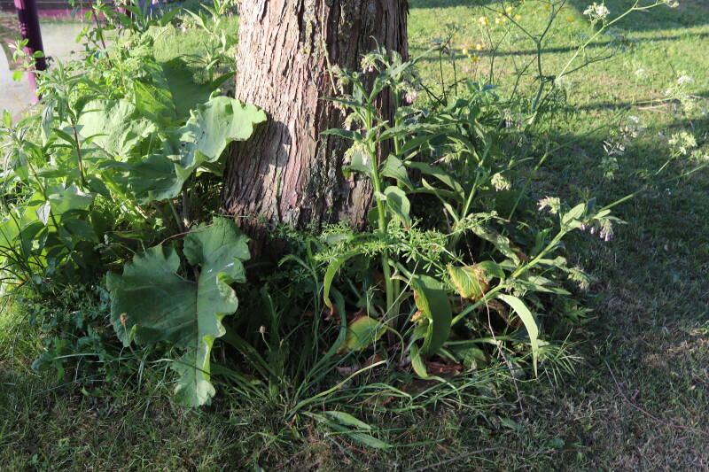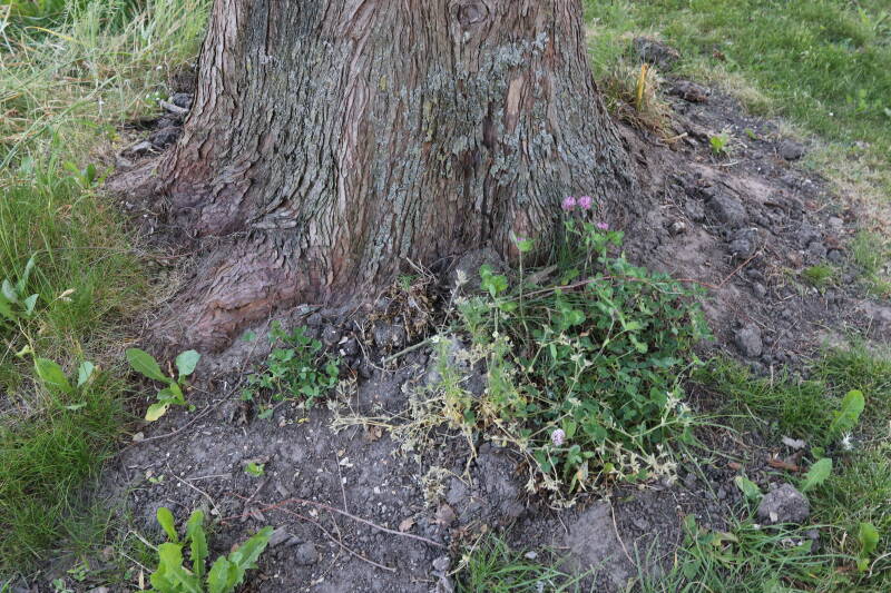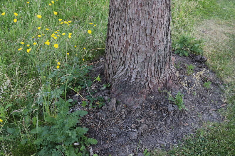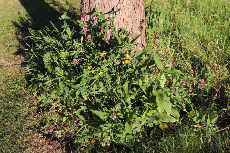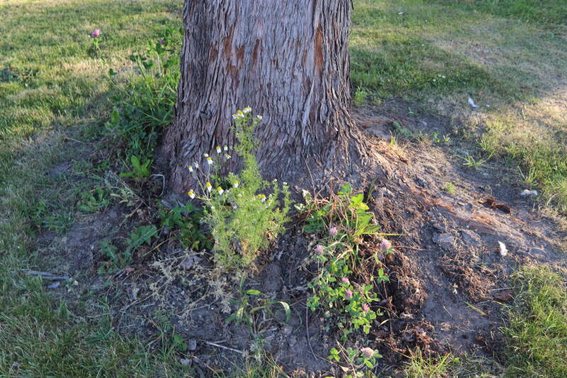 Een groot deel van de buitenruimte bestaat uit gazon. Hier komen naast natuurlijk grassen ook verschillende soorten kruidachtige planten in voor. Al is de variatie spaarzamer dan het geval zou zijn als het ongemoeid zou worden gelaten door minder en meer gevarieerd te maaien. In de hoeken waar de maaimachine minder makkelijk kan komen hebben planten slechts tijdelijk langer de tijd om te groeien.