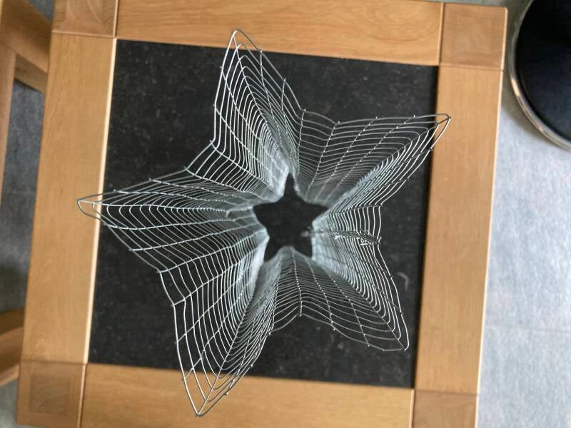 De maanden er voor had ik versnipperd karton bewaard zonder er een bestemming voor te hebben, maar de hele zak heb ik in dit project verwerkt om er zeker van te zijn dat het blijft staan als de ramen eens open staan. Het papier heb ik een dag of drie in water laten weken. Zachter geworden heb ik het water eruit geknepen voor de emmer met behanglijm op tafel werd gezet. Hoe meer je kneed en lijm toevoegt hoe beter het vorm is te geven. Ik ben begonnen in de sterpunten en vulde deze met dunne lagen op. Daarna bracht ik aan de buitenkant van het gaas de eerste laag papier-maché aan. Zo werkte ik naar boven toe. Achteraf bekeken had ik meer geduld moeten hebben met de papierklei tot deze geheel droog was voor ik het laatste volstopte en aandrukte met een stok.