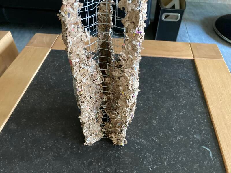 Voor de stevigheid heb ik gebruik gemaakt van een rol muizengaas. Ik heb hier een stuk van geknipt en het meerdere malen gevouwen voor ik het aan elkaar vastmaakte.