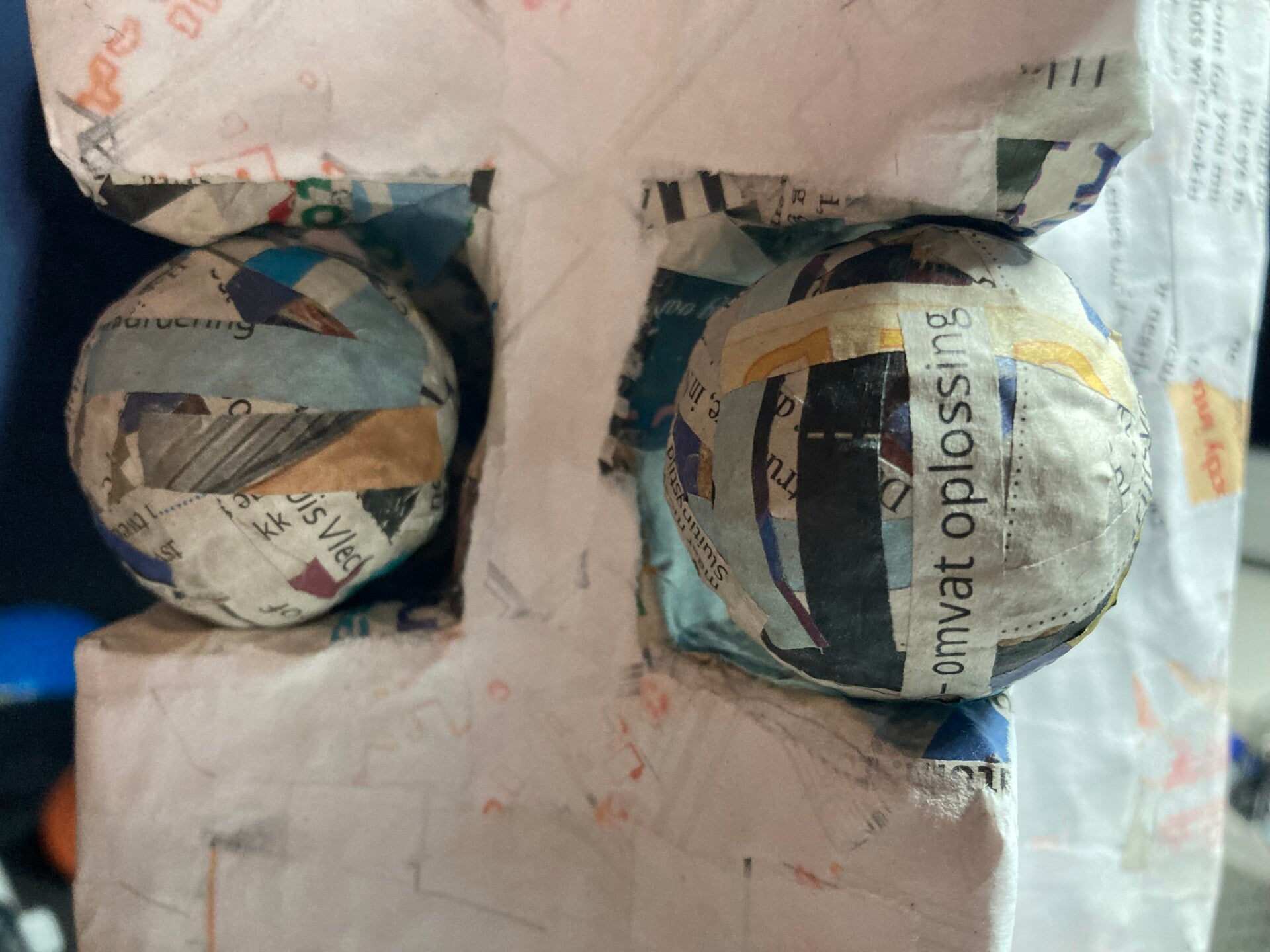 Voor de ogen heb ik twee openingen in het gaas geknipt. De ogen heb ik zo goed als mogelijk was in mijn handen gerold en op een later moment van smalle stroken papier-maché voorzien.
