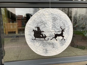 Uit de vrije hand een kerstman op een slede met rendier te tekenen zag ik niet zitten. Ik heb van het internet een afbeelding geplukt en het uitgesneden op papier. Ik draaide daarbij de maan tot ik tevreden was. Op deze wijze kon ik gemakkelijk met een permanent marker op de maan de lijnen aanbrengen en op een later moment opvullen. Om er vervolgens achter te komen dat ik geen rekening had gehouden met het visdraad om de maan aan op te hangen! Het was snel goed te maken door op de achterzijde koord vast te plakken.