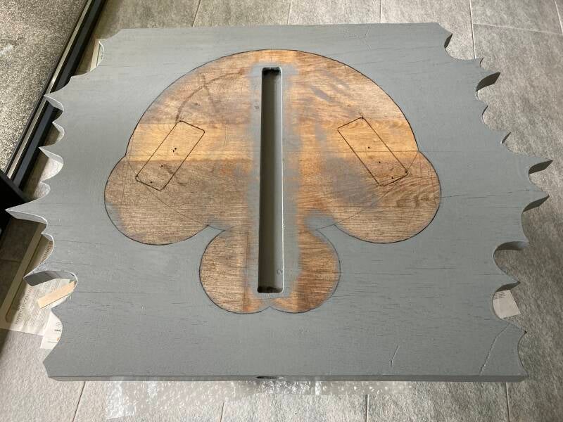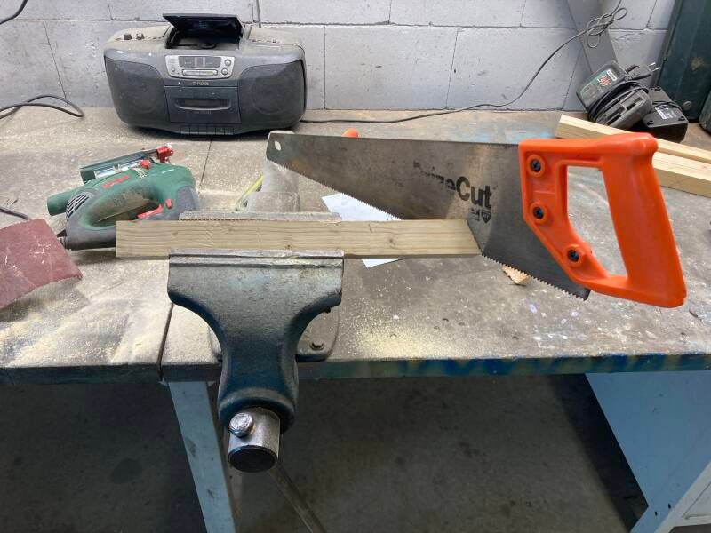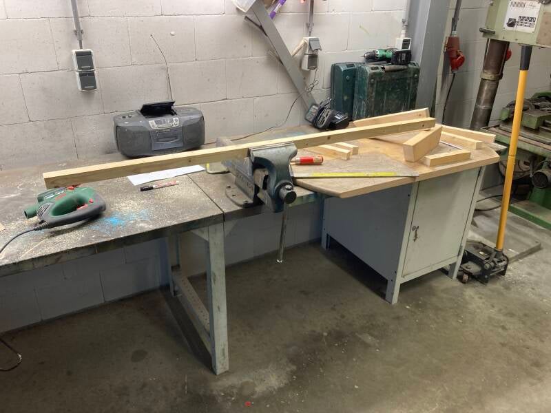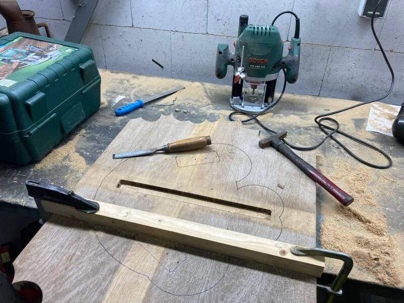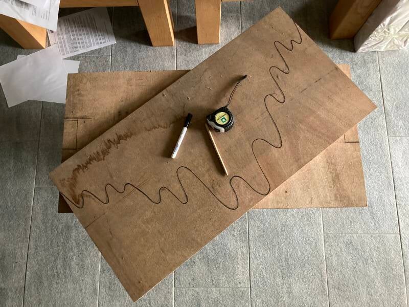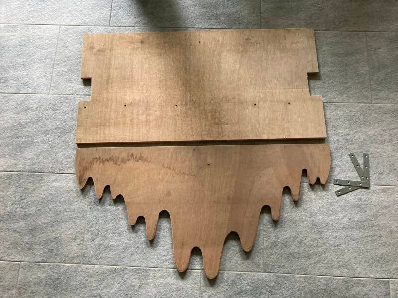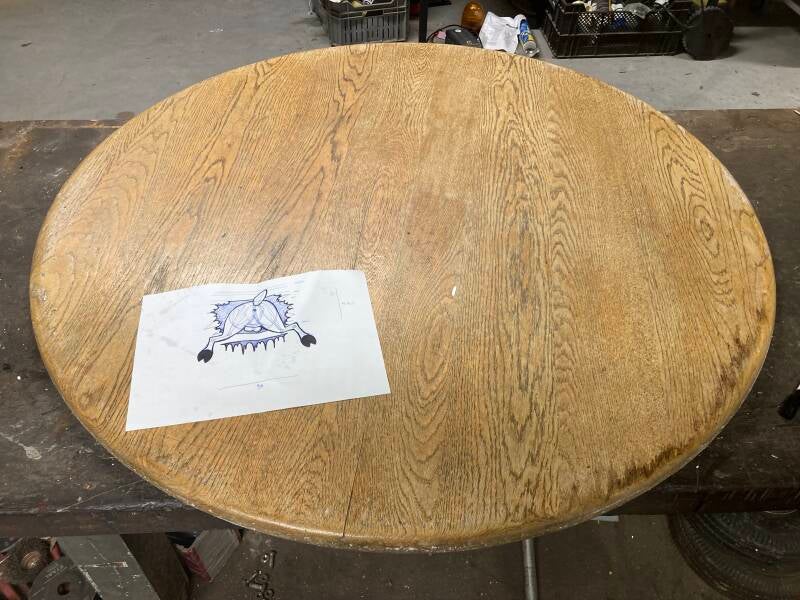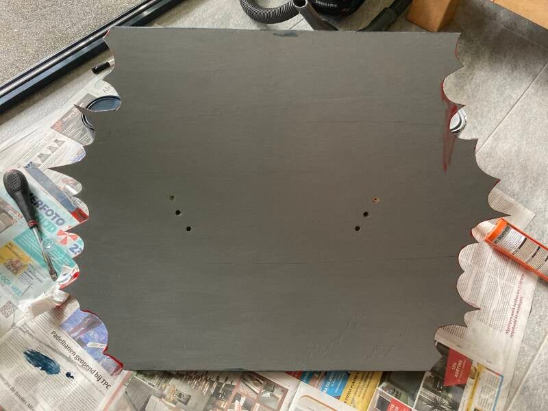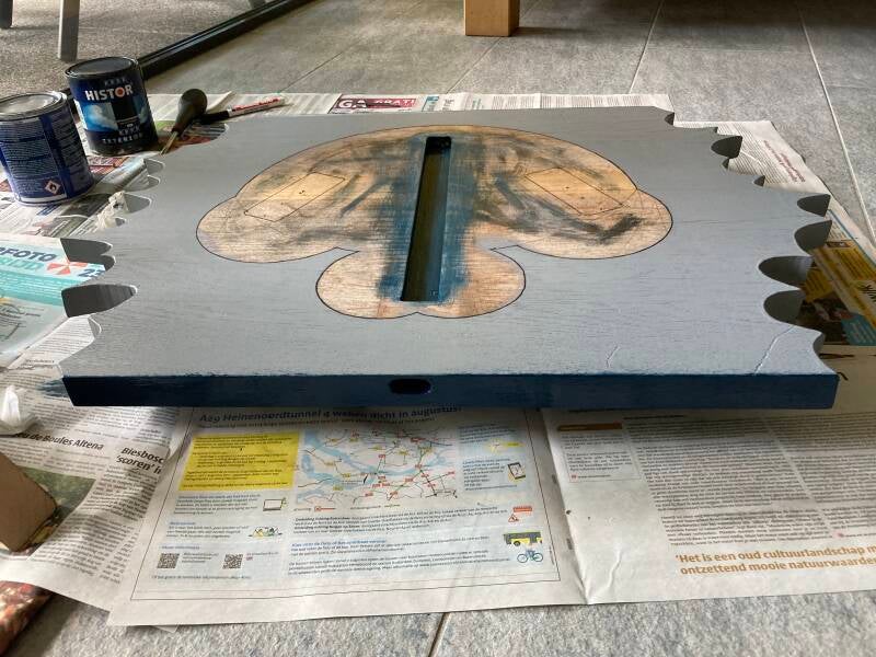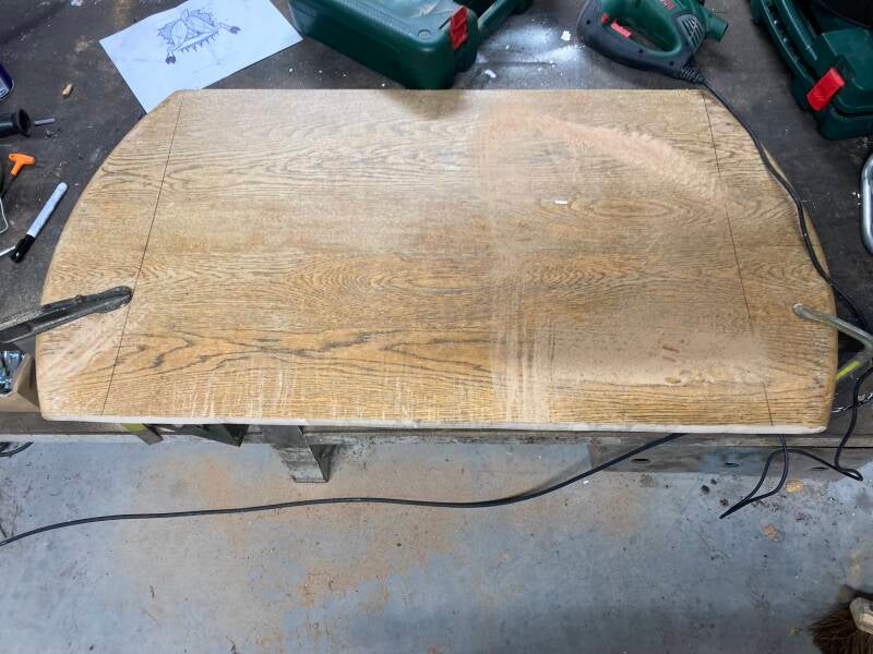 Op zoek naar een houten plaat met de juiste afmetingen kwam er een tafelblad op mijn pad. Het was te groot om in mijn kleine auto te kunnen vervoeren en gezien een trekhaak ontbreekt heb ik er de decoupeerzaag bij gepakt om het passend te maken voor transport.