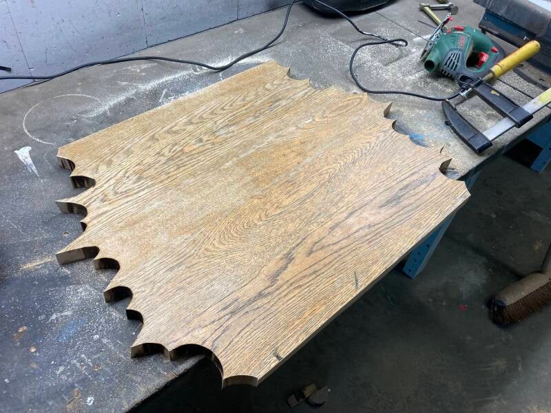 De decoupeerzaag heeft zich een weg langs de golvende lijn door het hout gevreten.