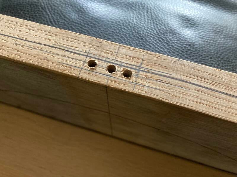 Zoals ik had verwacht moest er het nodige hout in de geboorde openingen worden bewerkt met raspen en beitels om het aan te laten sluiten op de gleuf.