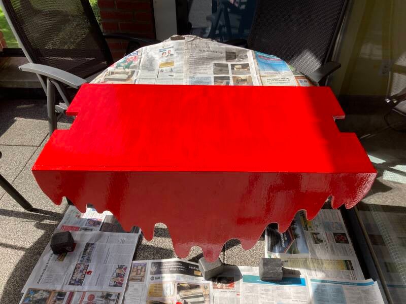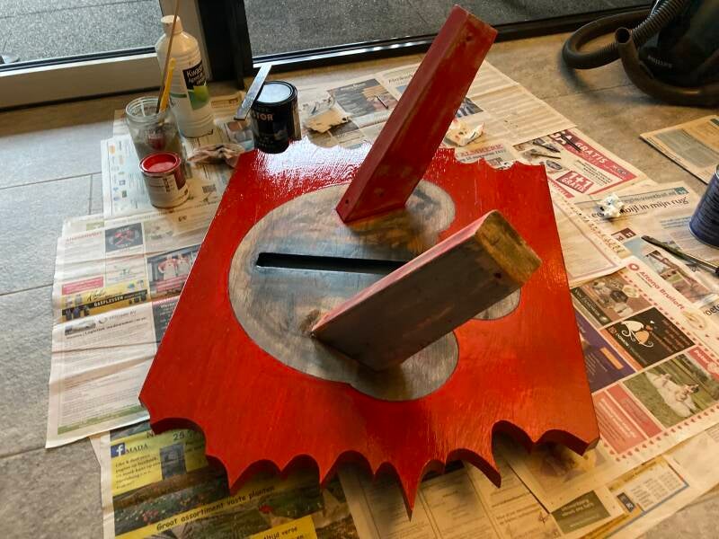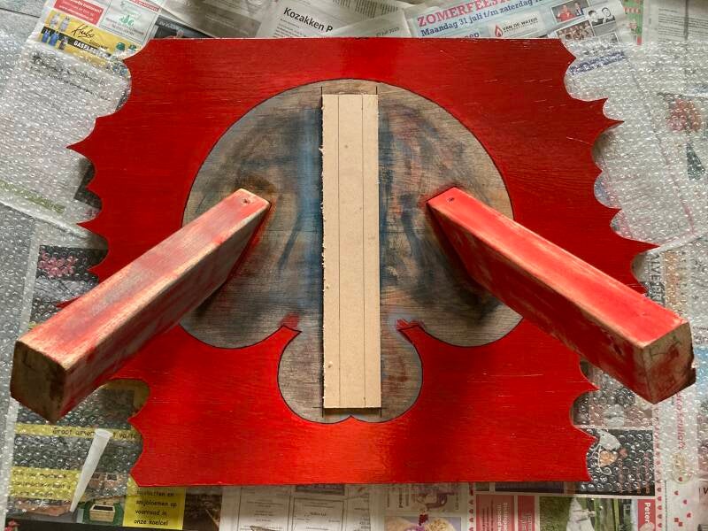Lichtere tinten van deze bruine kleur heb ik over de basis gestreken. Daarna kwam de rode verf weer aan de beurt om de overgang op het hout achter een rode kleur schuil te laten gaan.