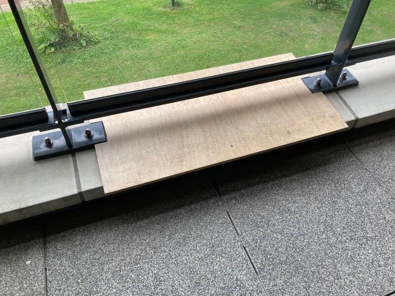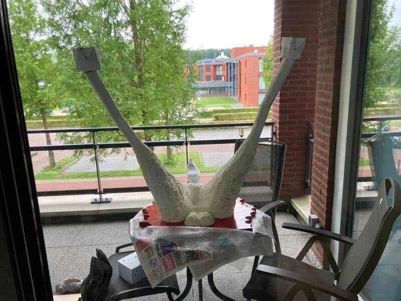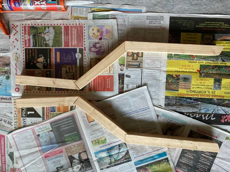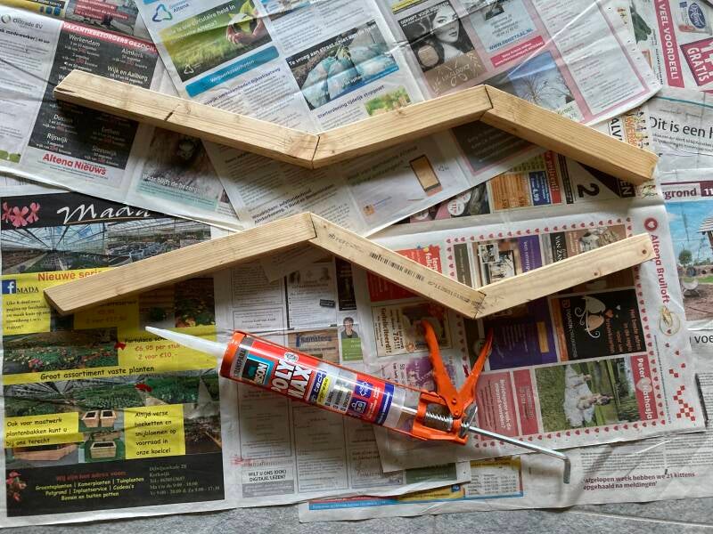 Het is bepaald geen timmerwerk van een expert, maar nadien zat er weinig beweging in en daar gaat het mij om. Er komt nog een laag purschuim overheen en daarna diverse lagen krantenpapier. Als het geheel straks aan de buitenkant van het balkon komt te hangen wil ik niet dat er de mogelijkheid bestaat dat er iets van een poot afbreekt en naar beneden valt.