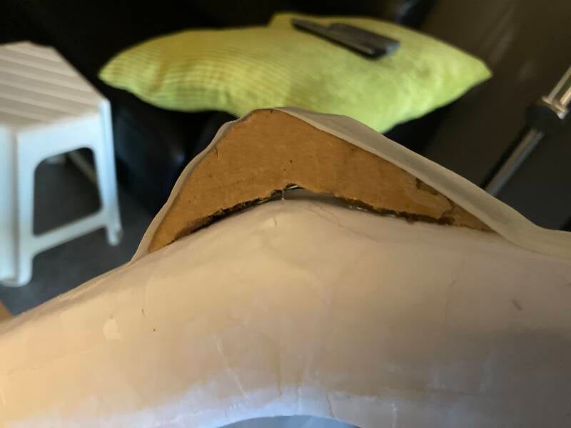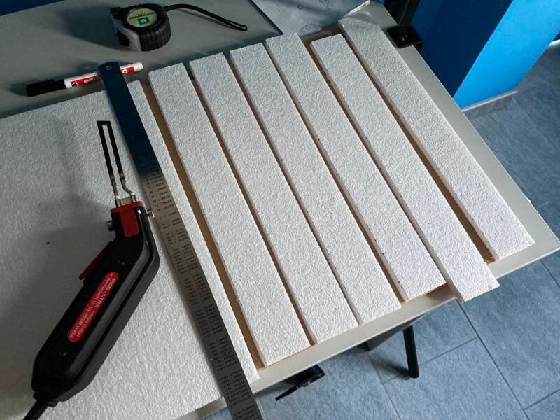 De eerste laag tempex is met behulp van lijm aangebracht. Het bestaat uit dunne strippen. Ik ben ongeveer een centimeter van de rand vandaan gebleven. Deze ruimte wordt later opgevuld met purschuim.